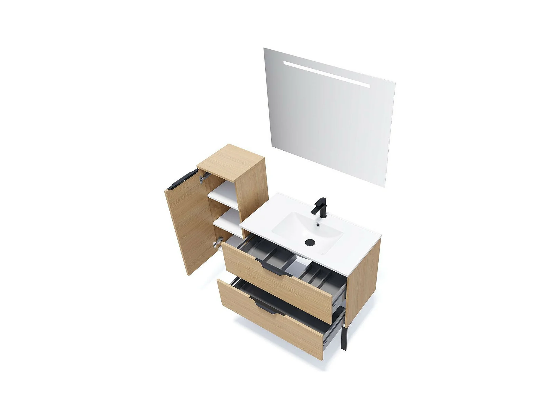 Meuble de salle de bain suspendu vasque intégrée 90cm 2 tiroirs Chêne clair + miroir - Venice