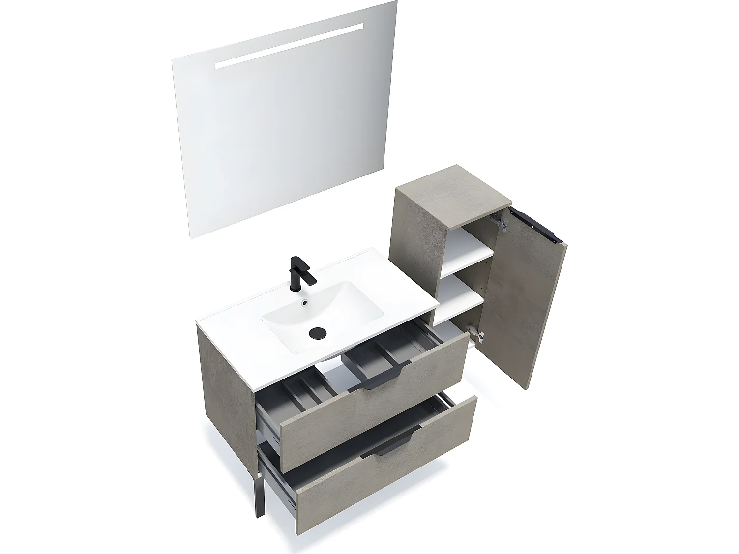 Meuble de salle de bain suspendu vasque intégrée 90cm 2 tiroirs façon Béton + miroir + colonne ouverture droite - Venice