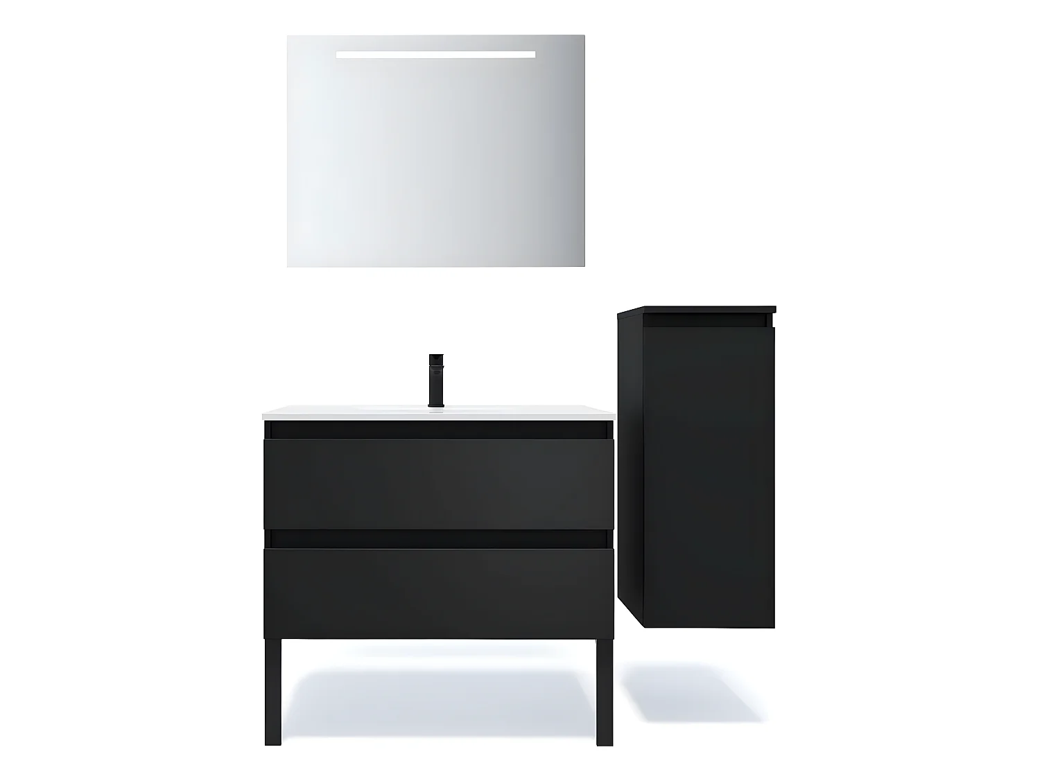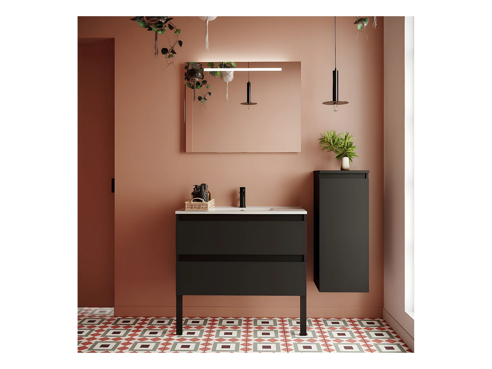 Meuble de salle de bain suspendu vasque intégrée 90cm 2 tiroirs Noir + miroir + colonne ouverture droite - Hudson