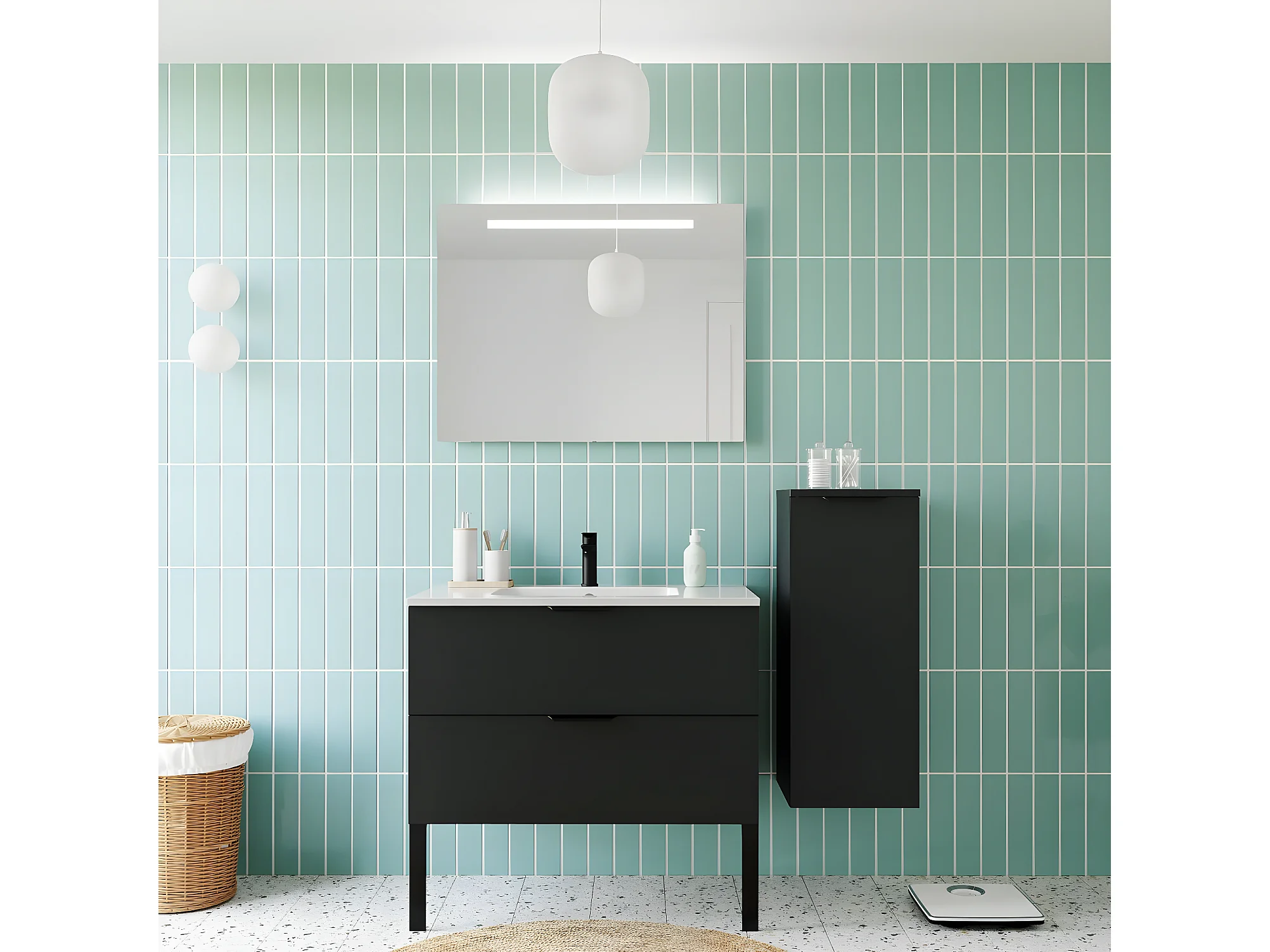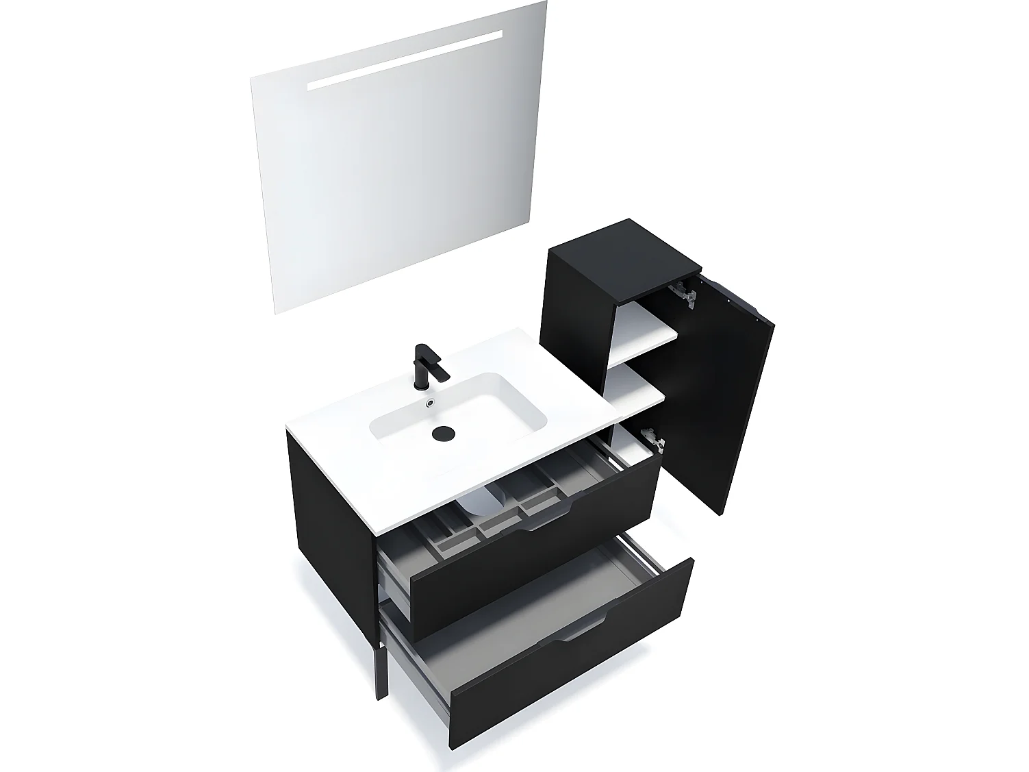 Meuble de salle de bain suspendu vasque intégrée 90cm 2 tiroirs Noir + miroir + colonne ouverture droite - Soho