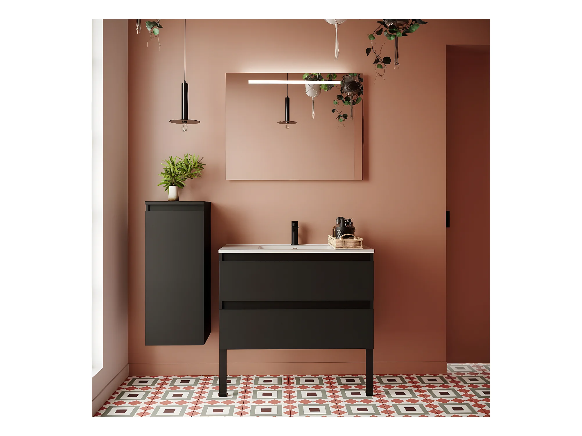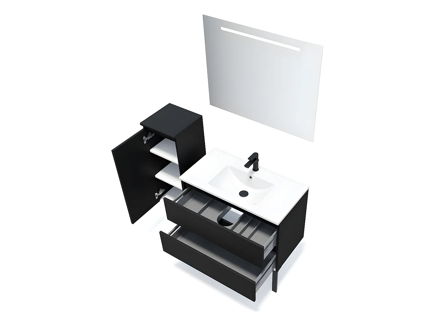 Meuble de salle de bain suspendu vasque intégrée 90cm 2 tiroirs Noir + miroir + colonne ouverture gauche - Hudson