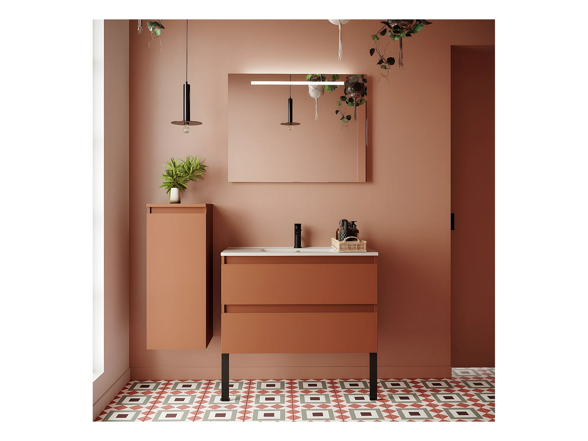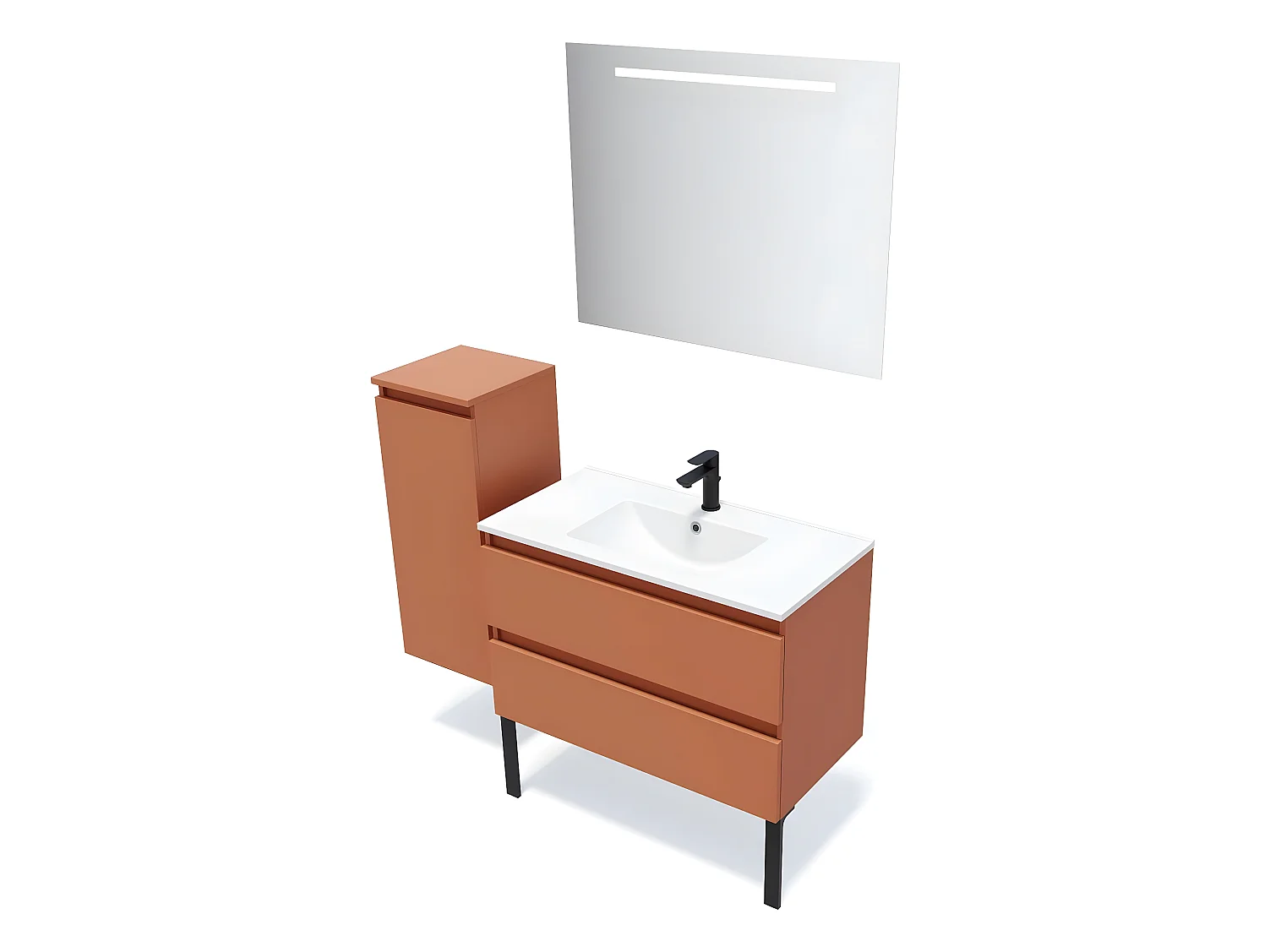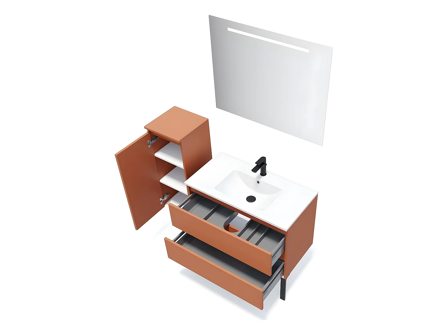 Meuble de salle de bain suspendu vasque intégrée 90cm 2 tiroirs Terracotta + miroir + colonne ouverture gauche - Hudson