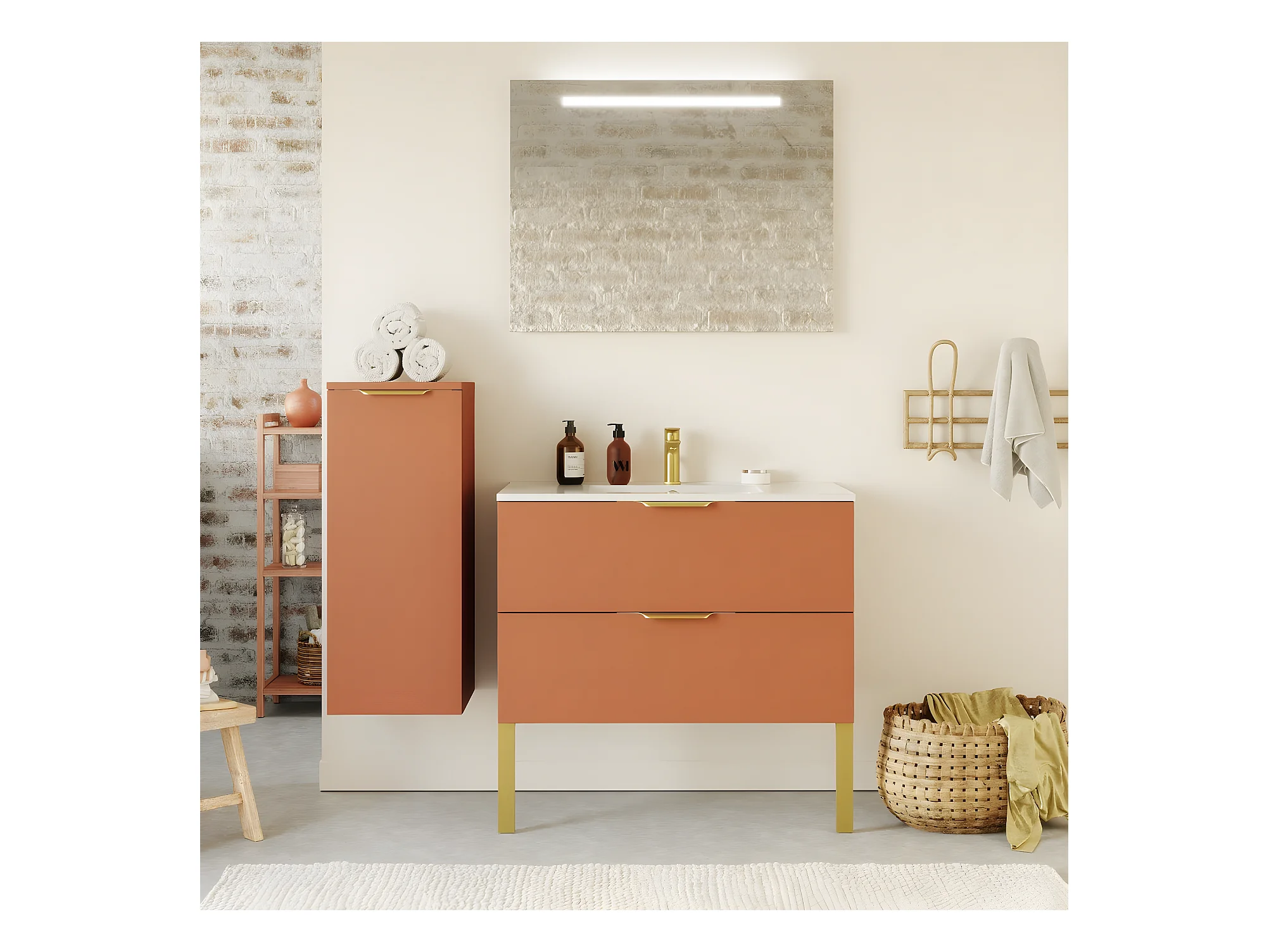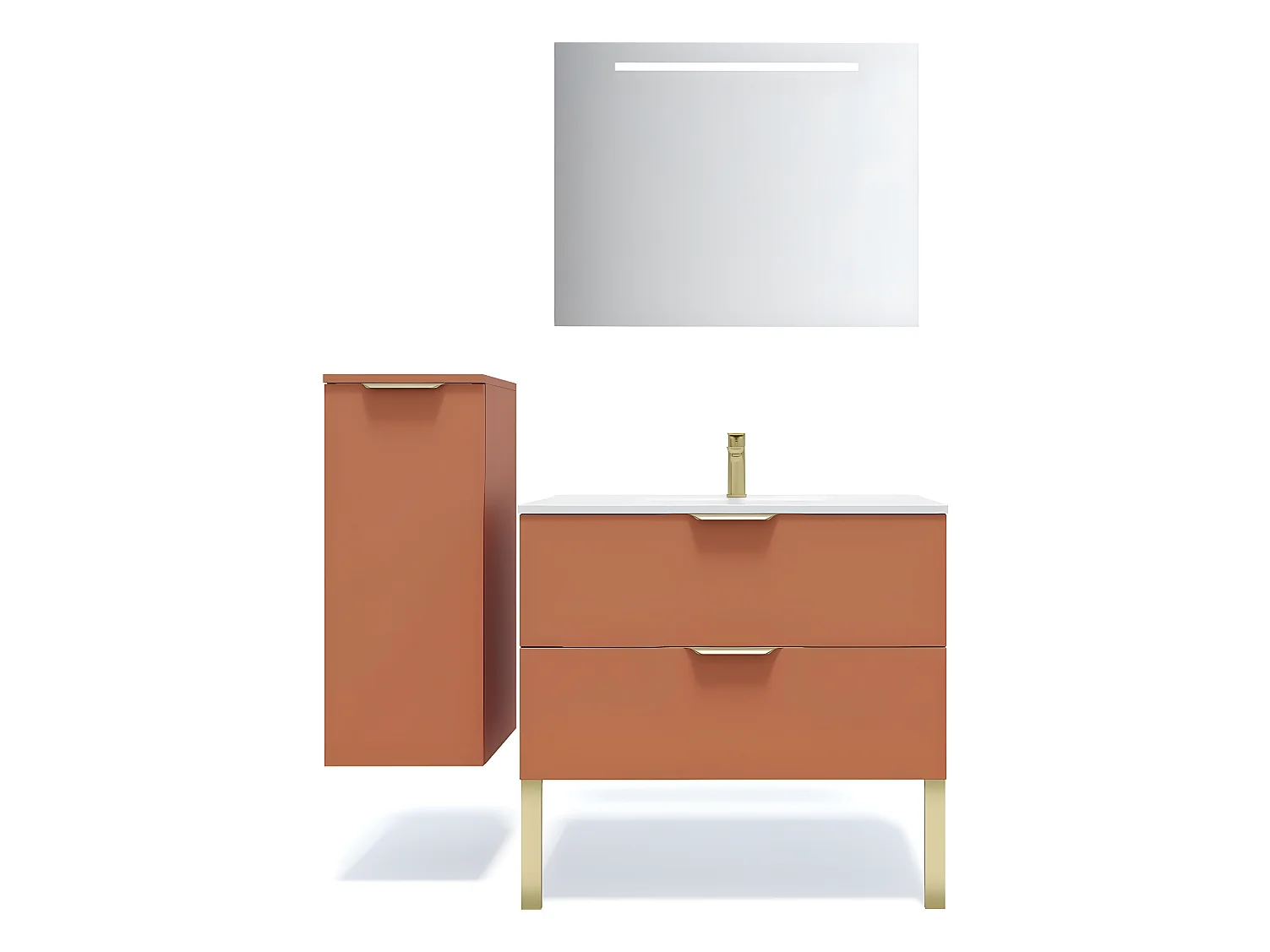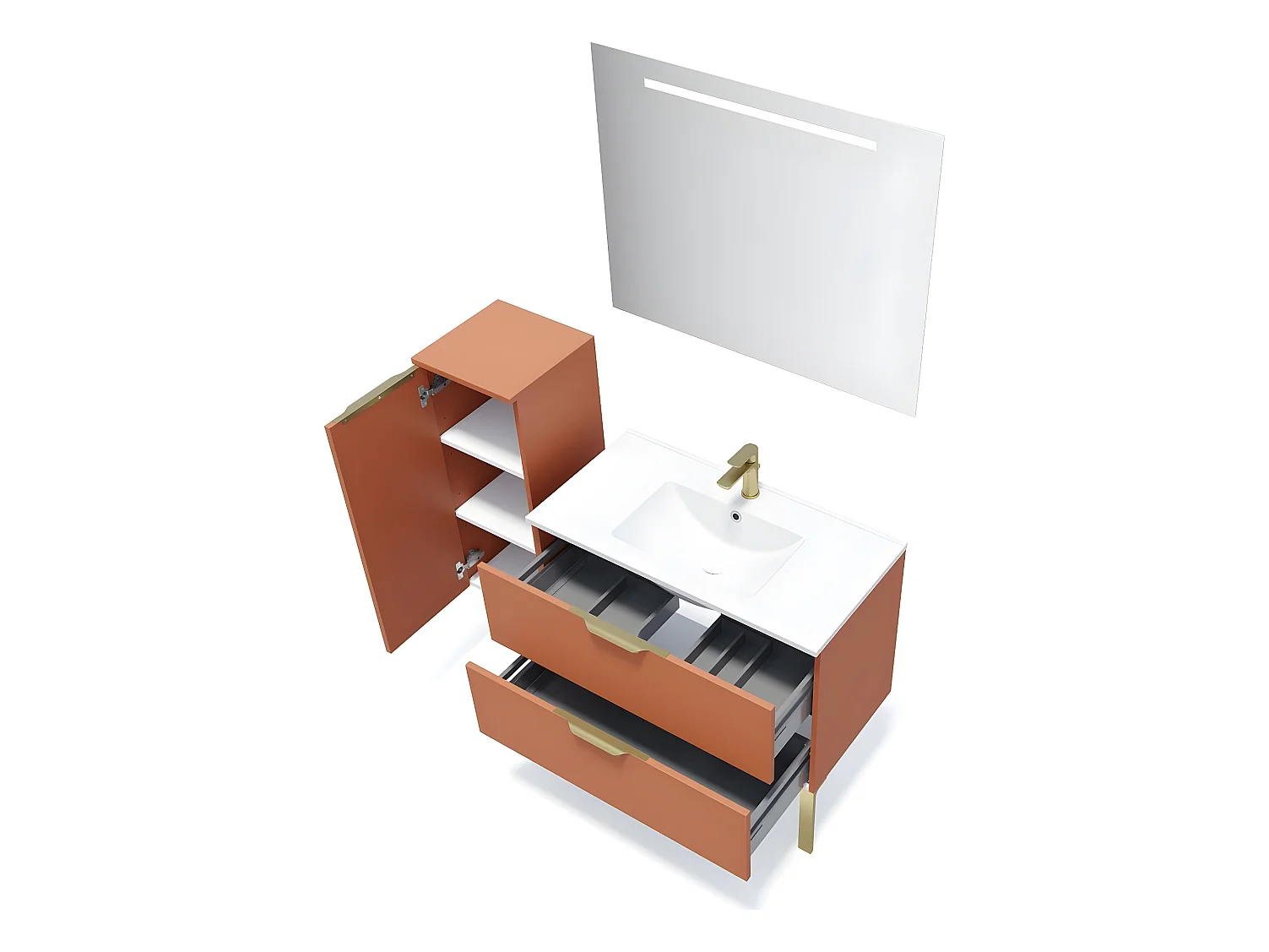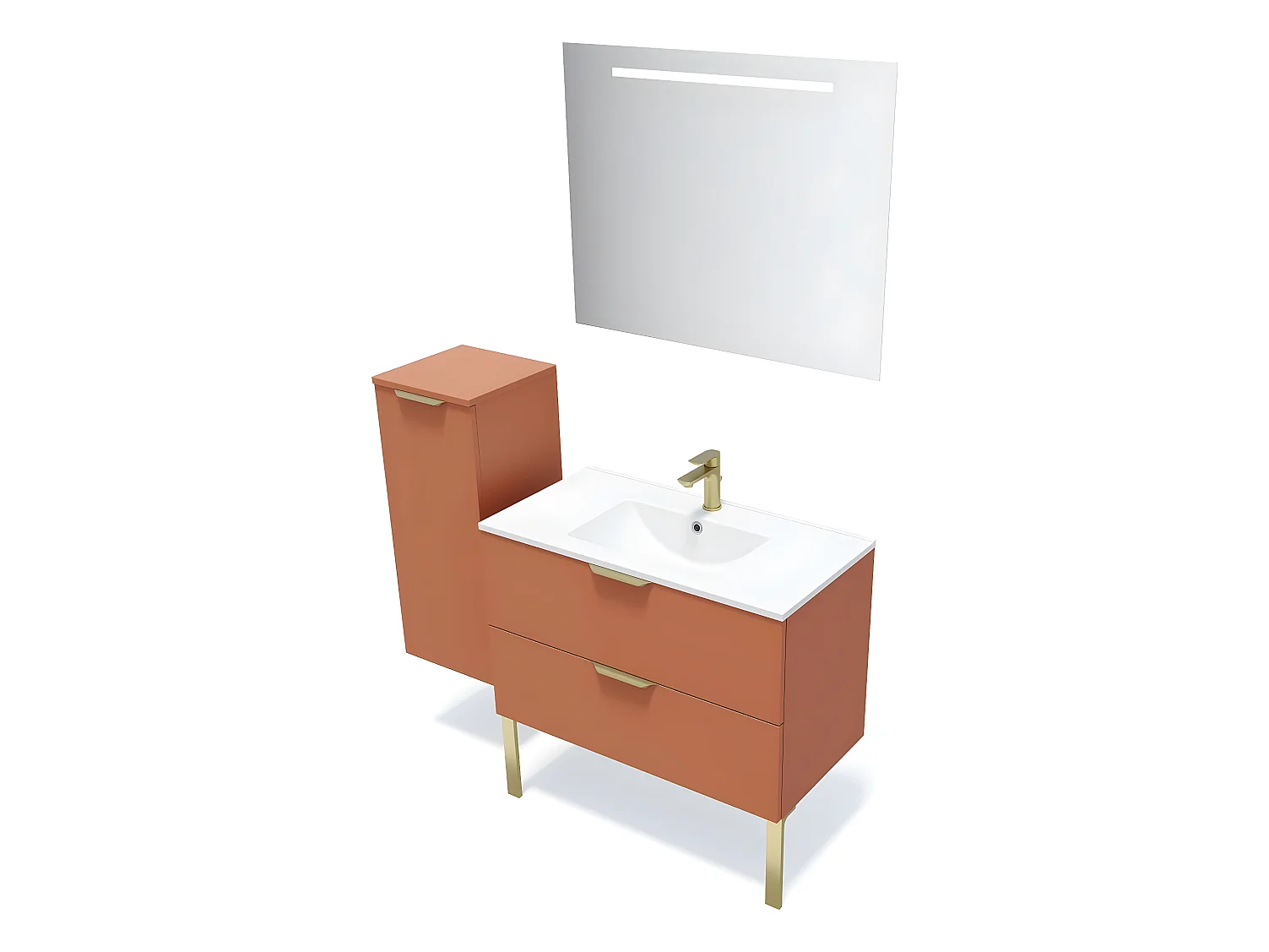 Meuble de salle de bain suspendu vasque intégrée 90cm 2 tiroirs Terracotta + miroir + colonne ouverture gauche - Venice