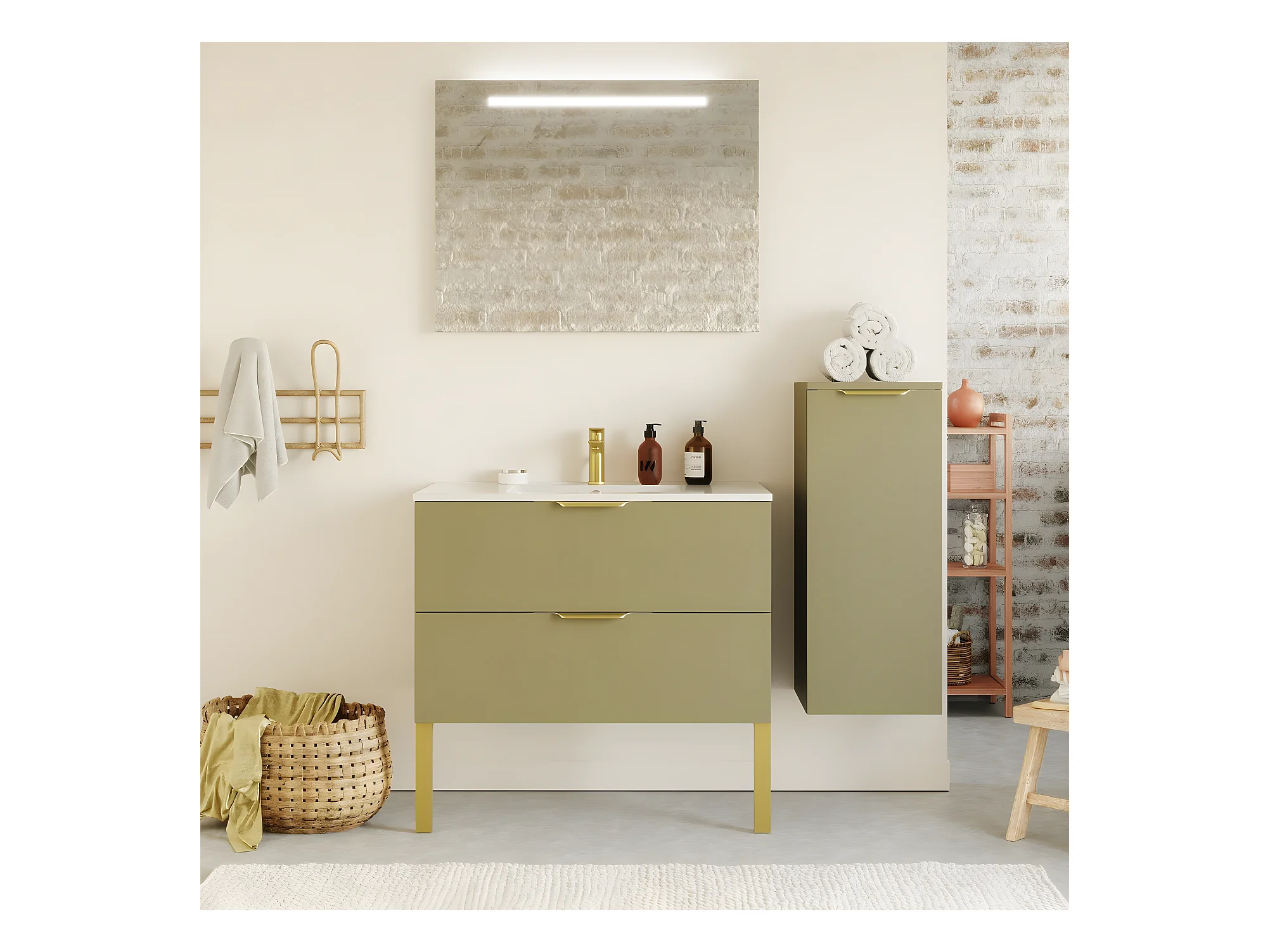 Meuble de salle de bain suspendu vasque intégrée 90cm 2 tiroirs Vert olive + miroir + colonne ouverture droite - Venice
