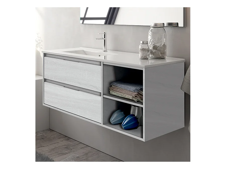 Meuble de salle de bain vasque déportée - 2 tiroirs - OLYMPE et miroir rond Led SOLEN - hibernian (bois blanchi) - 80cm