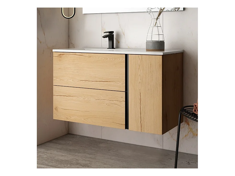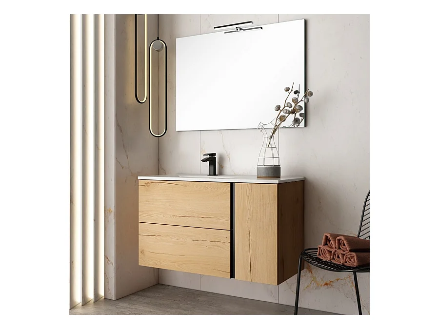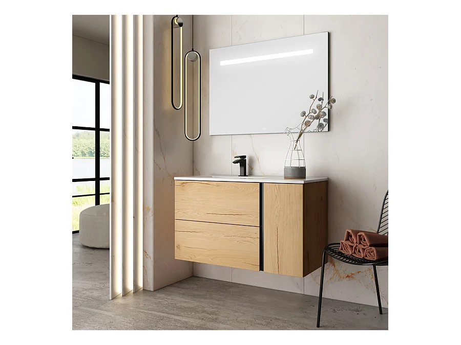 Meuble de salle de bain vasque déportée - 2 tiroirs - PRADO et miroir Led STAM - roble (chêne clair) - 100cm
