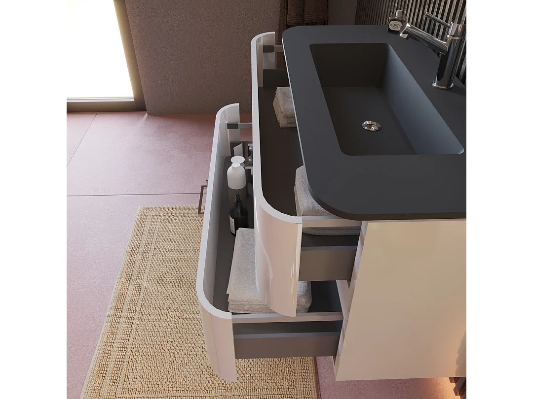 Meuble De Salle De Bains Mural 100Cm Tiroirs Blanc Brillant Avec Lavabo Noir | Hollywood