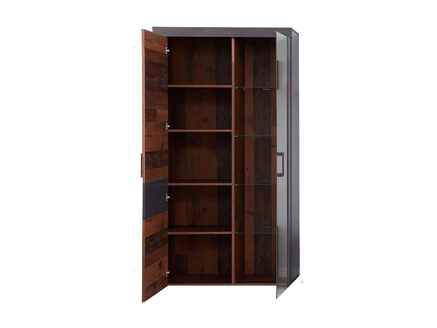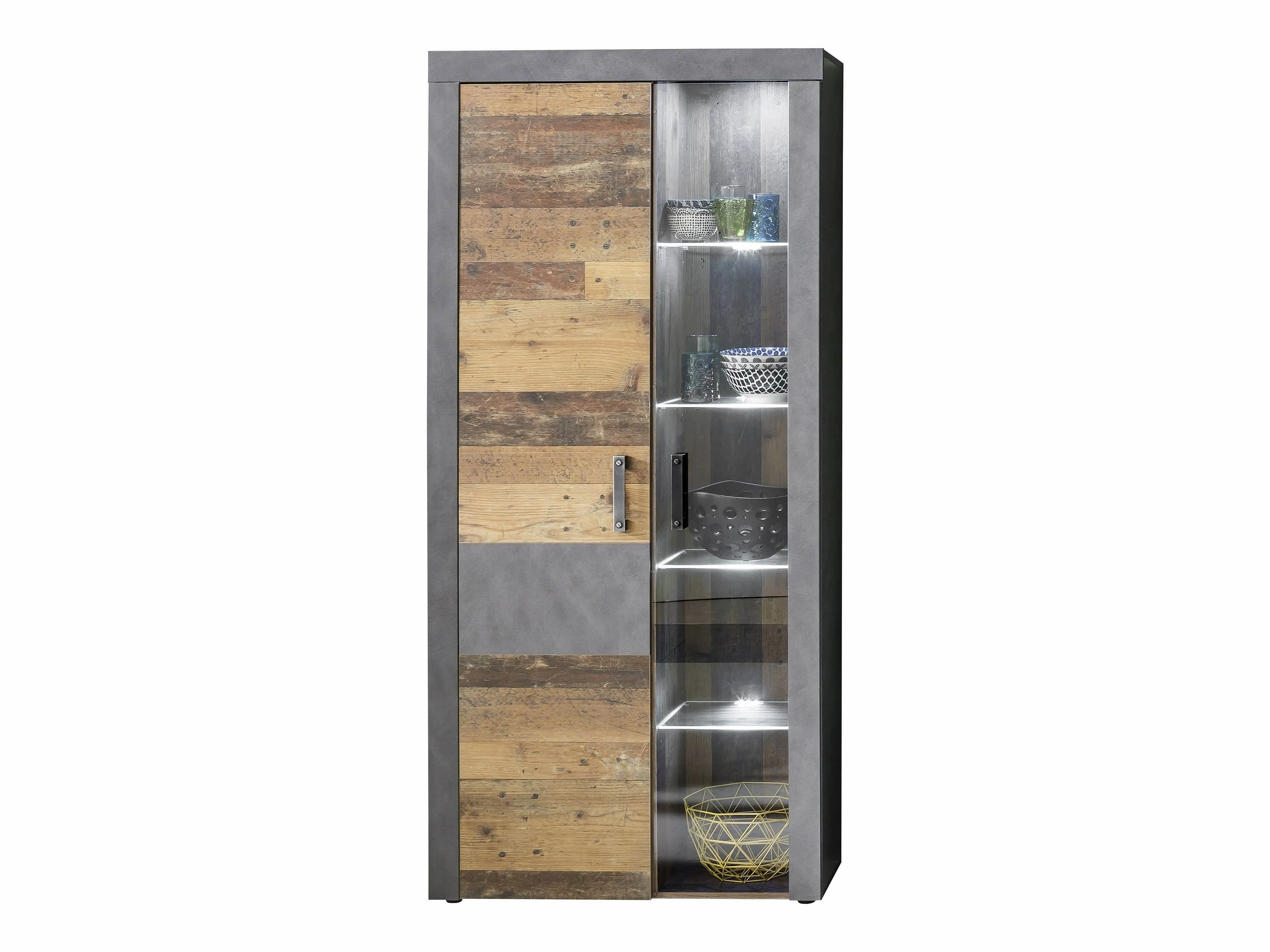 Meuble de salon-séjour . Meuble vitrine en mélaminé coloris bois effet vieilli avec une finition gris ciment. L - H - P: 87 - 189 - 34 cm.