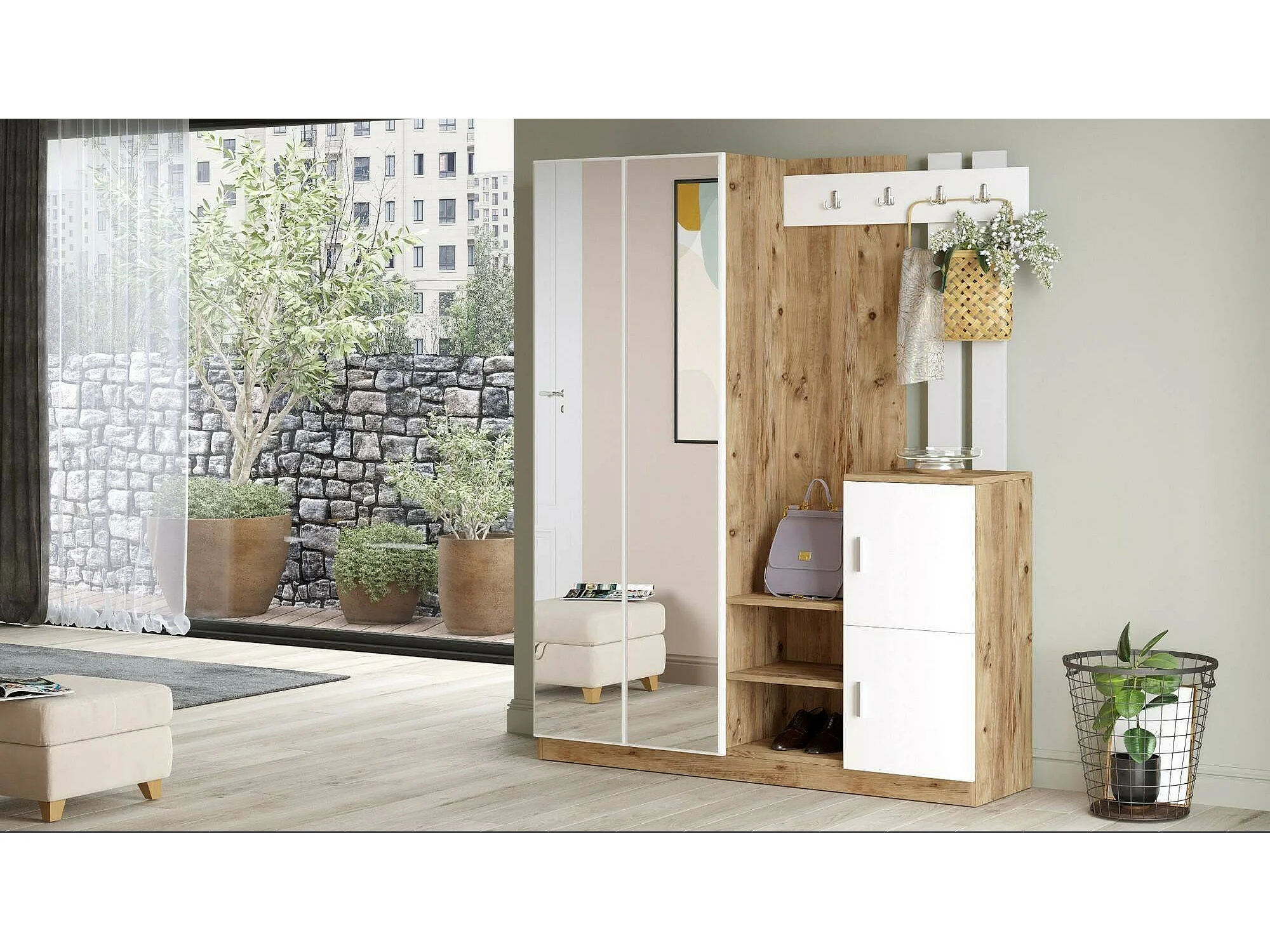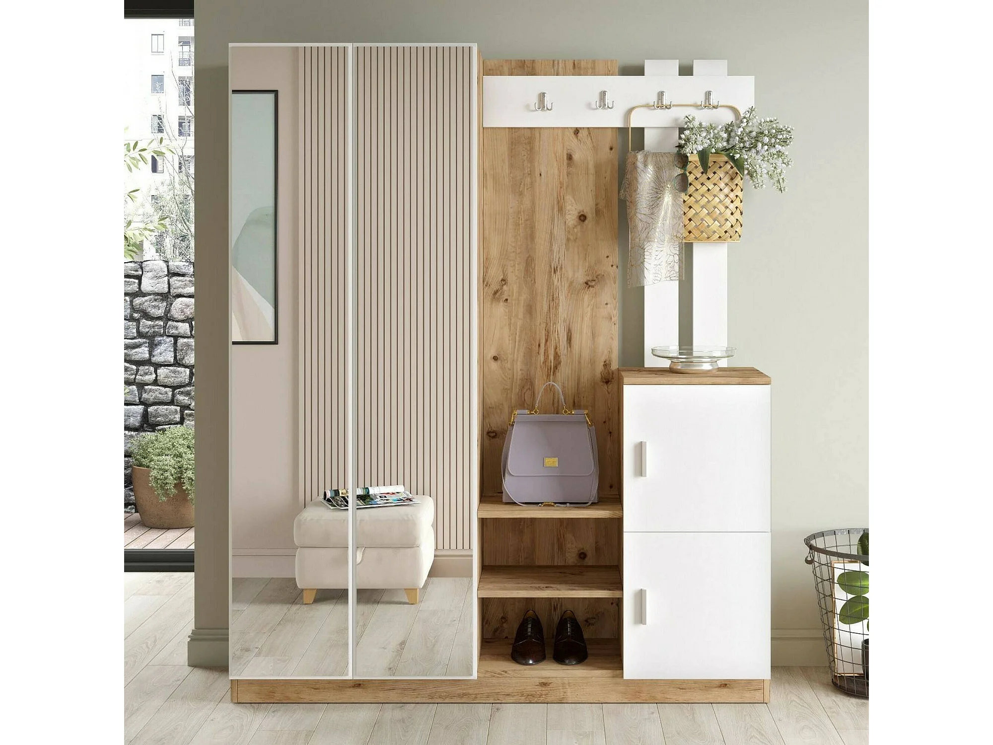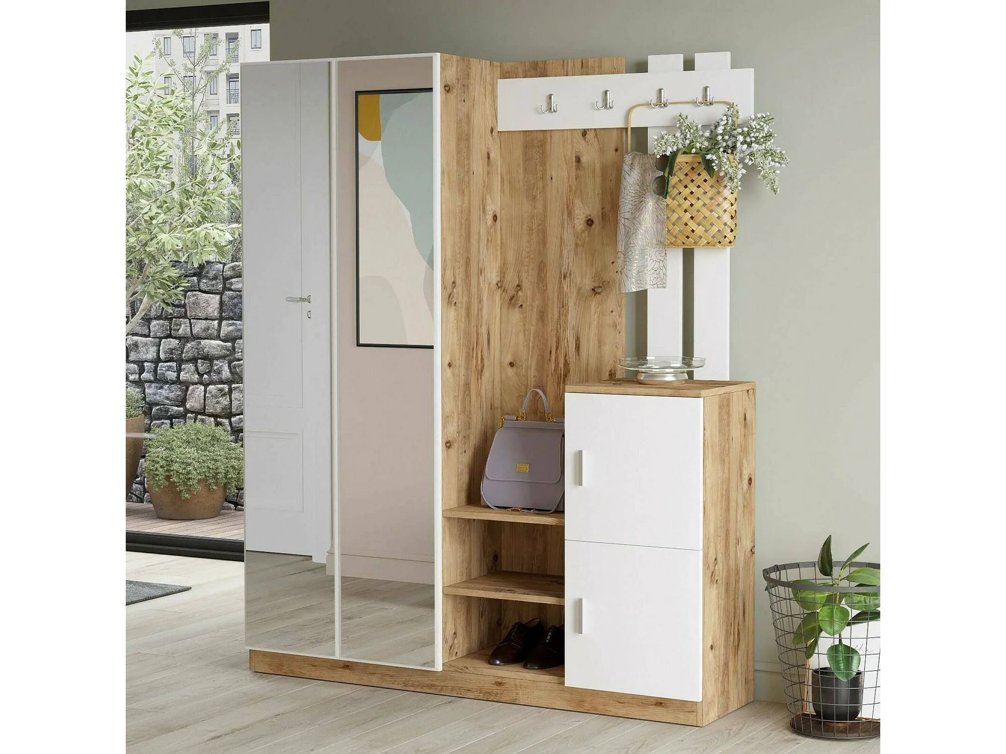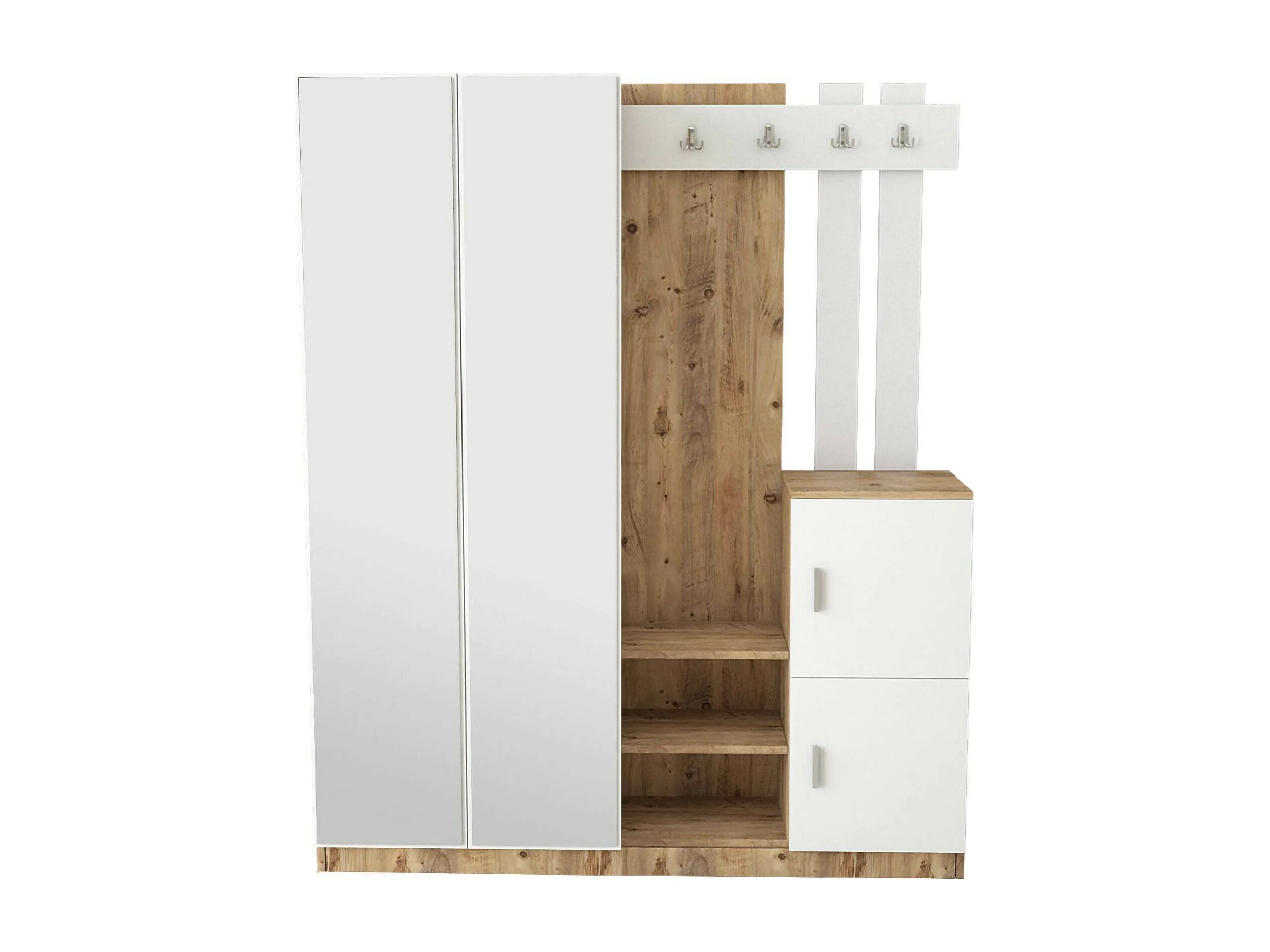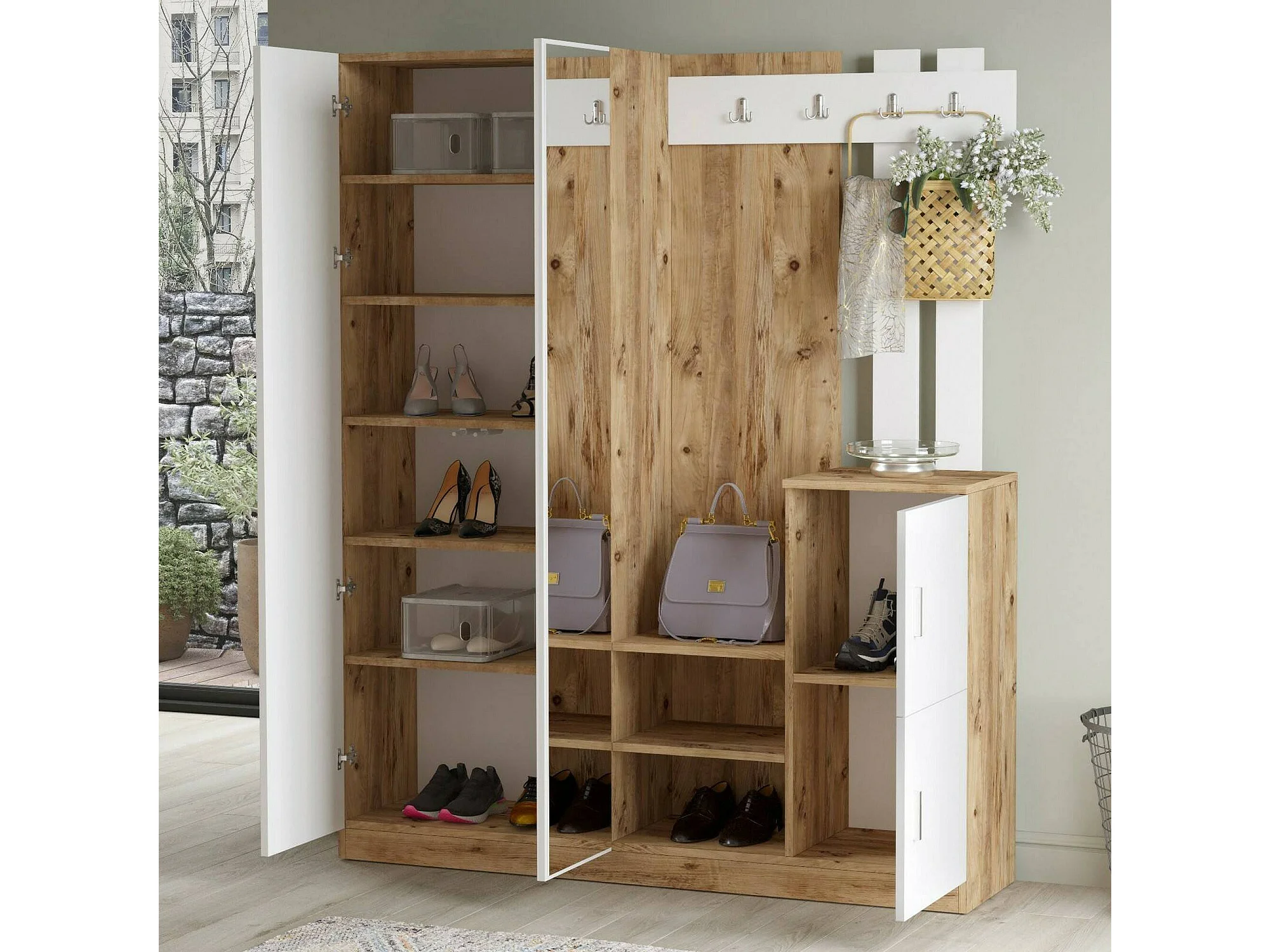 Meuble d'entrée Borealis, Crochet d'entrée, Composition pour l'atrium, Console de rangement multifonction, 147x38h180 cm, Chêne et Blanc
