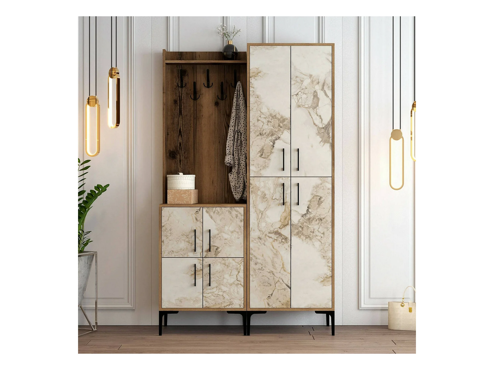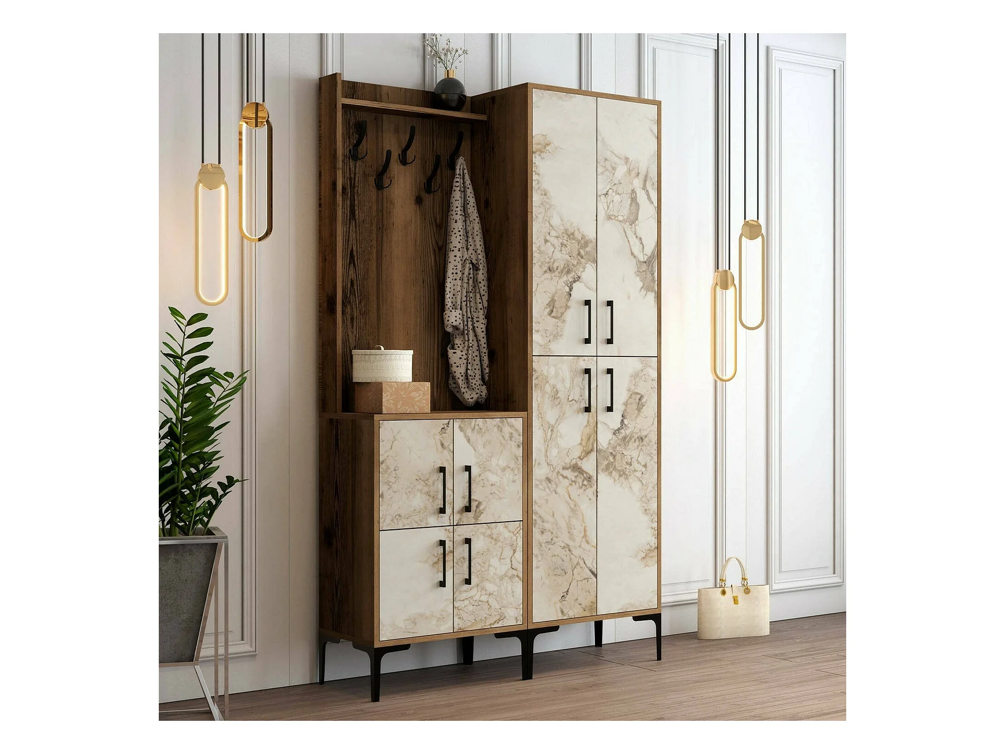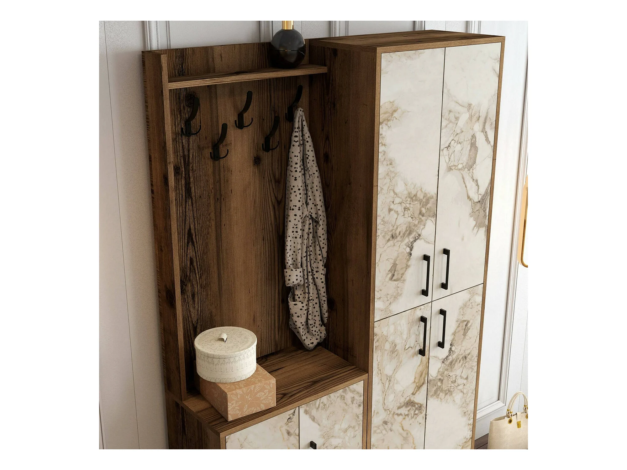 Meuble d'entrée Castor, Crochet d'entrée, Composition pour l'atrium, Console de rangement multifonction, 120x35h200 cm, Noyer et Marbre Blanc