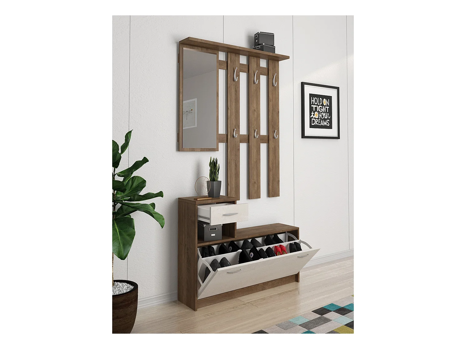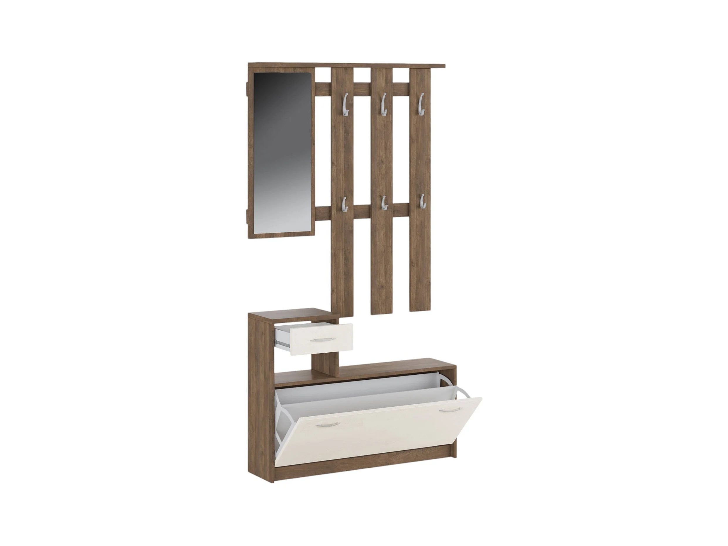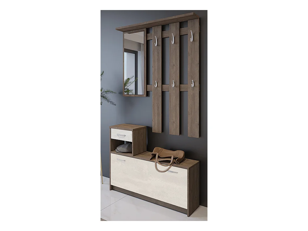 Meuble d'entrée Clint, Entrée moderne, Armoire avec étagère à chaussures, Armoire polyvalente avec miroir et cintre, 100x25h180 cm, Chêne et Blanc