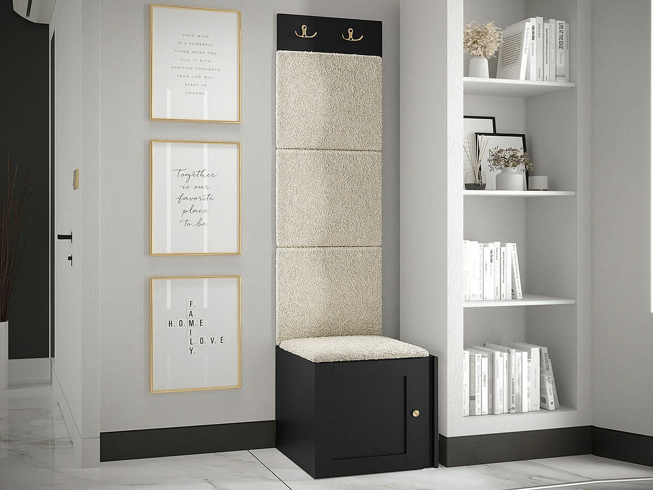 Meuble d'entrée Hartford 378, 186x42x46cm, Noir|Brun clair, MDF|Stratifié|Tissu