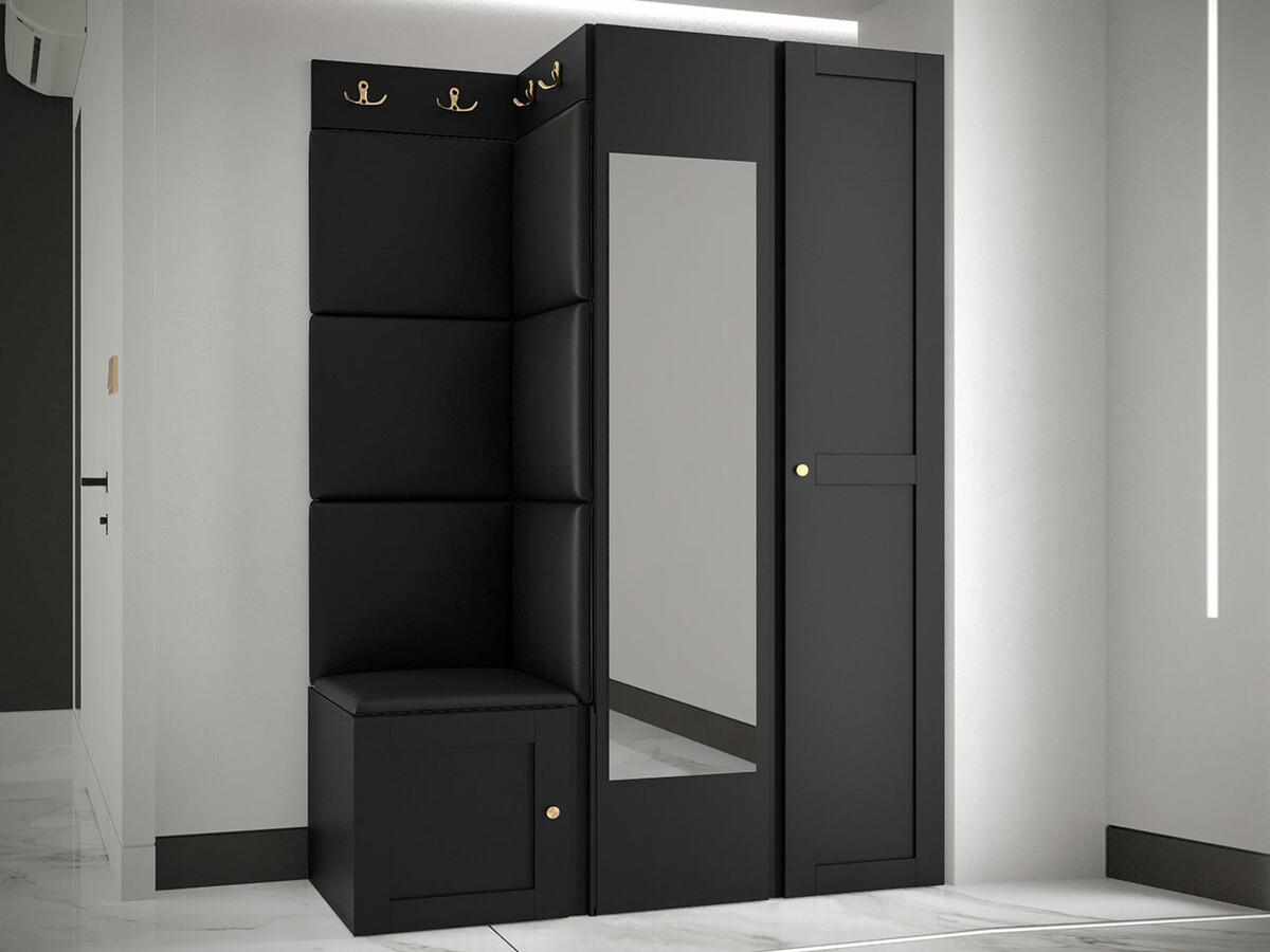 Meuble d'entrée Hartford 380, 186x116x46cm, Miroir, Noir, Stratifié|Faux cuir|MDF