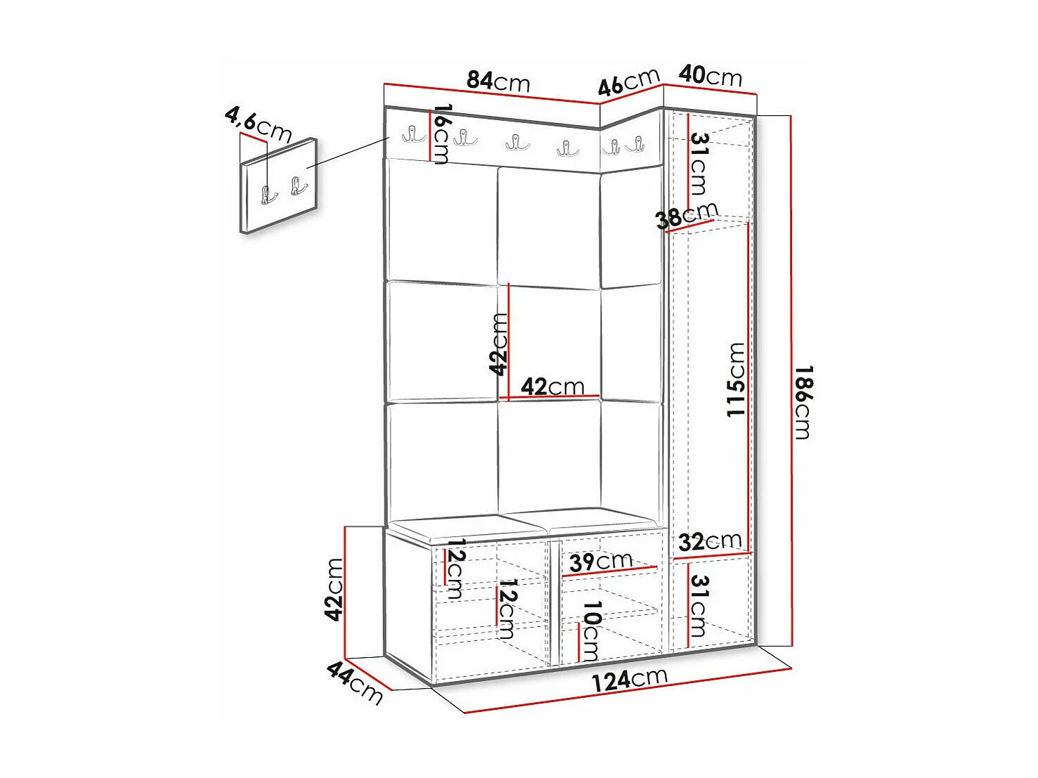 Meuble d'entrée Hartford 385, 186x124x46cm, Noir|Marron, Stratifié|Tissu|MDF