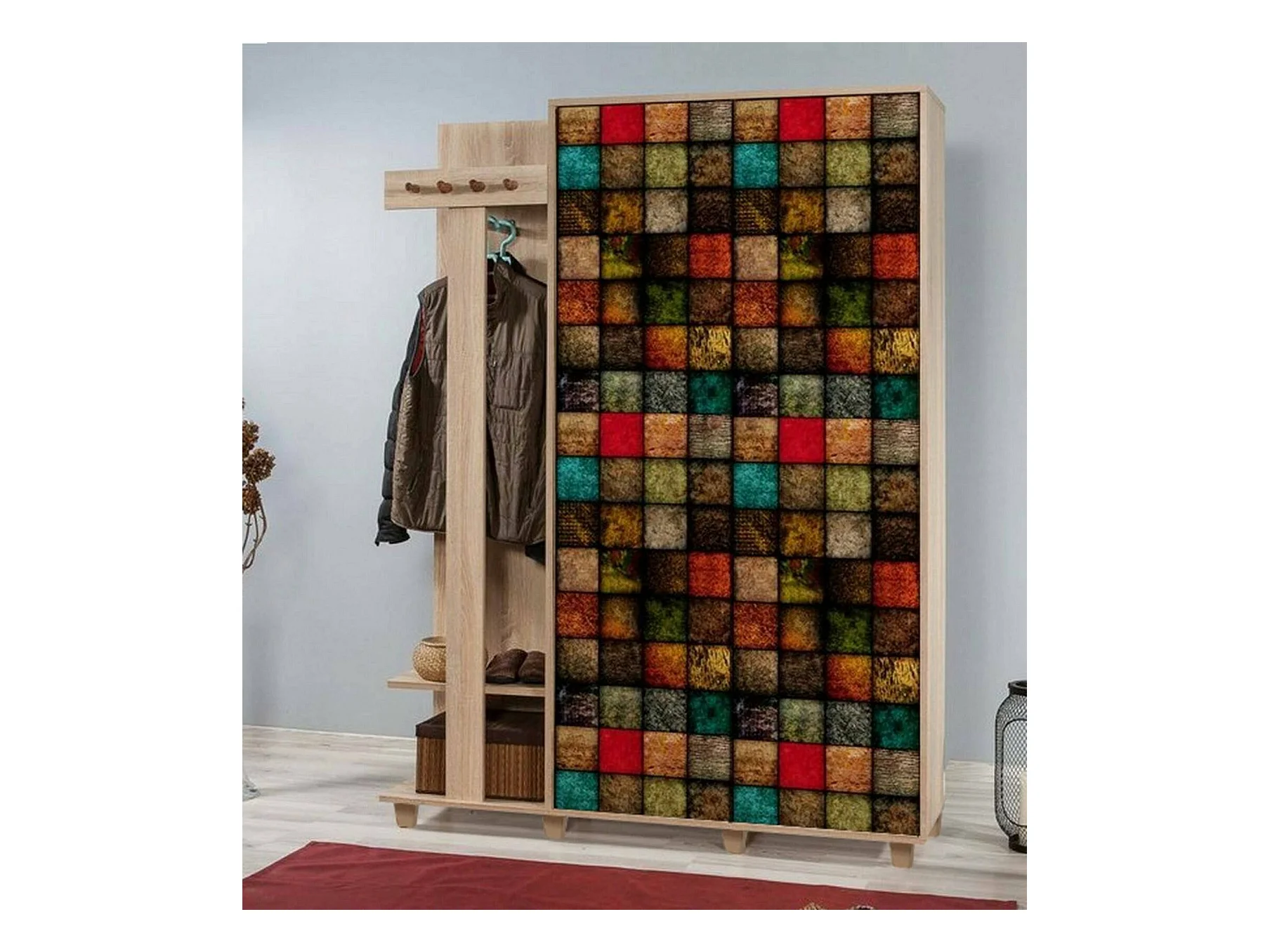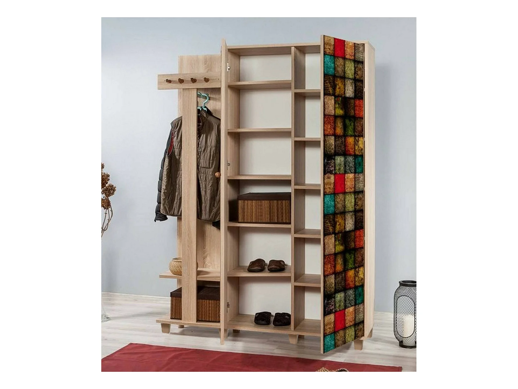 Meuble d'entrée Terpsi, Crochet d'entrée, Composition pour l'atrium, Console de rangement multifonction, 135x36h194 cm, Chêne et Multicolore