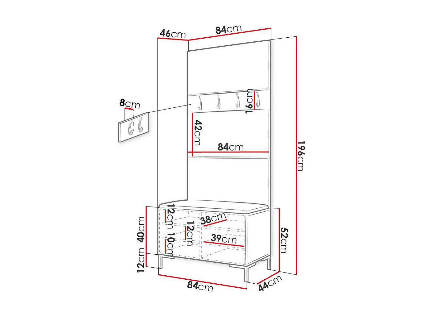 Meuble d'entrée Tivsoa 102, 196x84x46cm, Craft chêne, Faux cuir|Stratifié, Murale|À poser