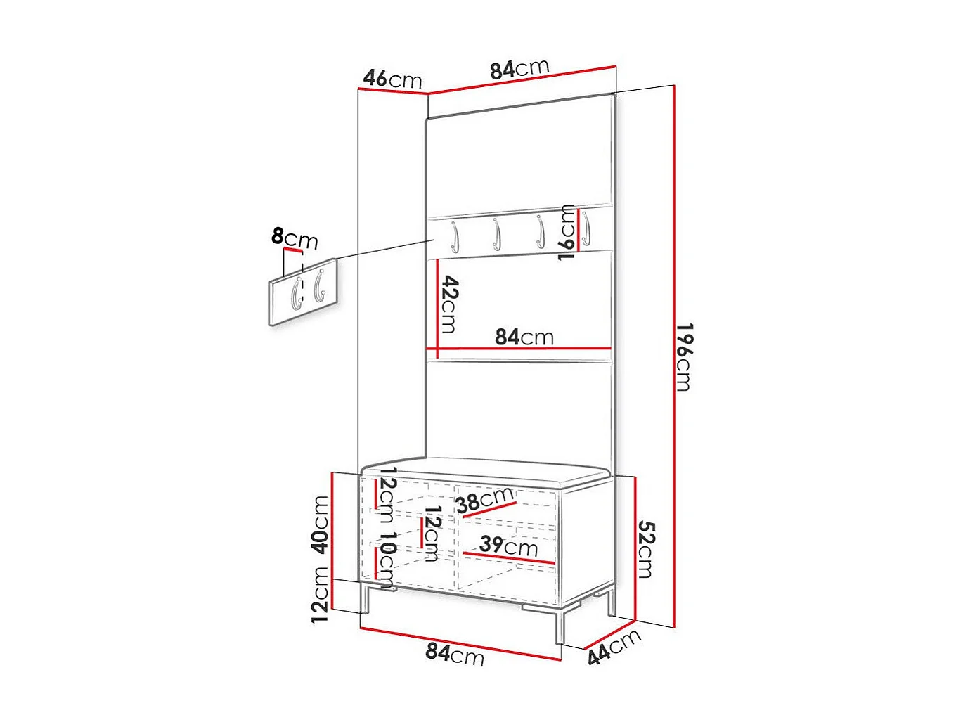 Meuble d'entrée Tivsoa 102, 196x84x46cm, Noir, Tissu|Stratifié, À poser|Murale