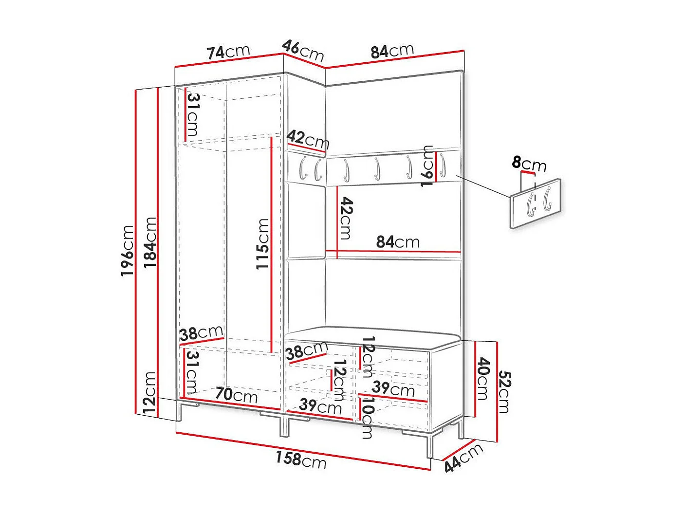 Meuble d'entrée Tivsoa 107, 196x158x46cm, Disponible, Noir, Tissu|Stratifié