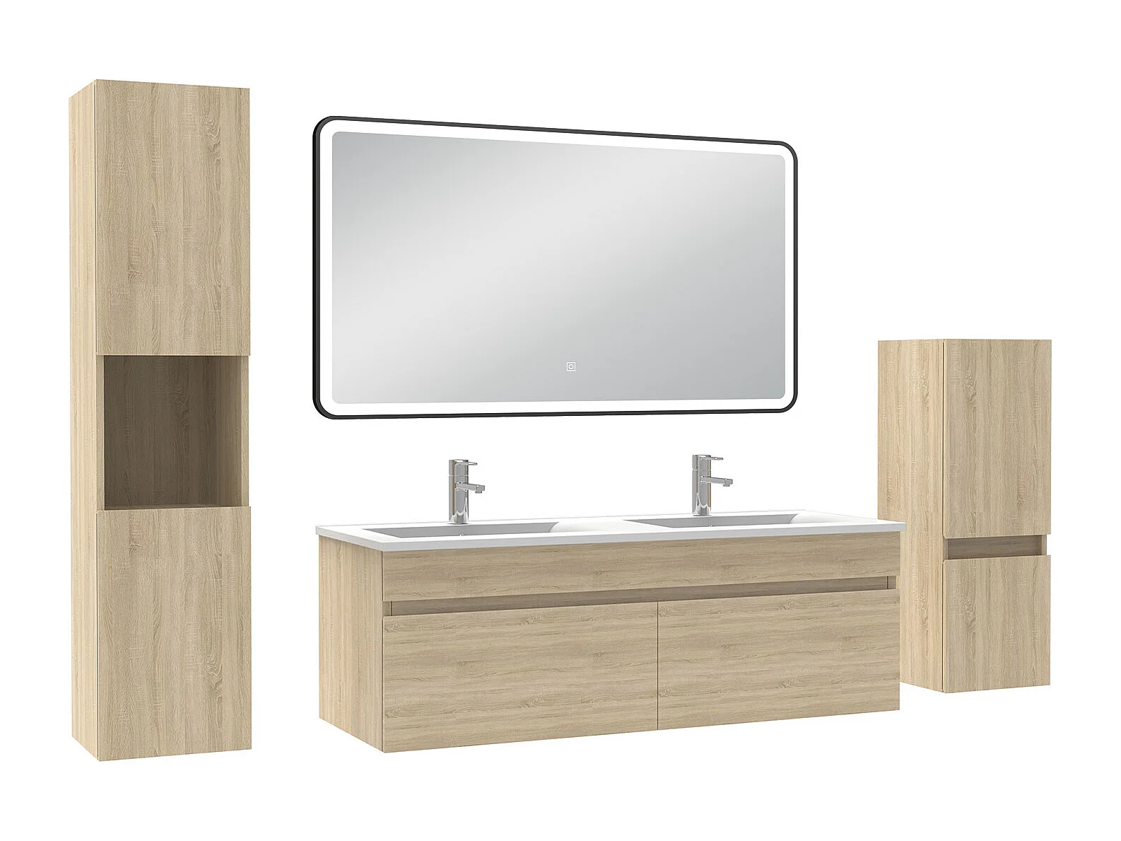 Meuble double vasque 120cm avec colonne + miroir lumineux 3 couleurs + dimmable chêne wotan