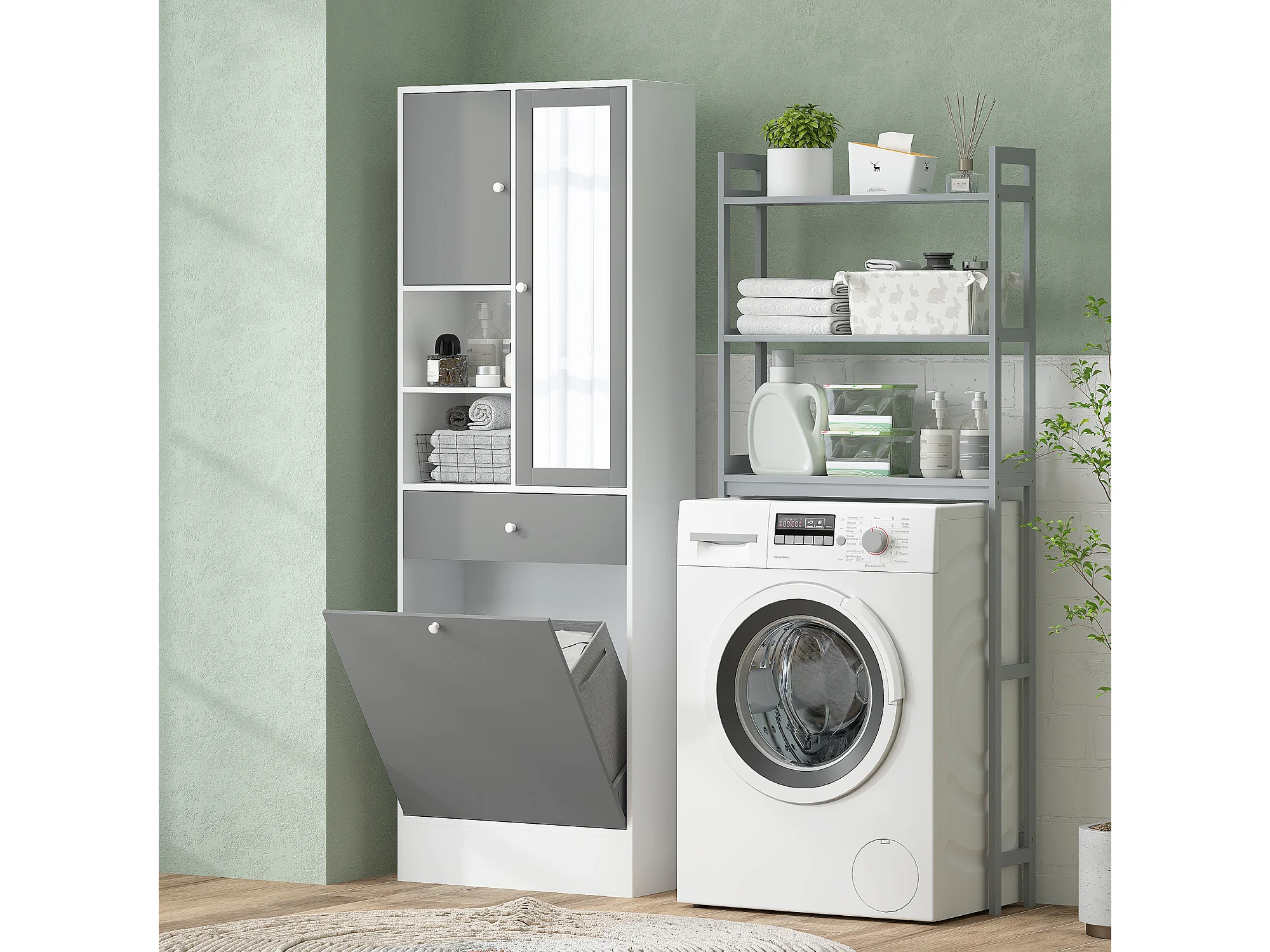 Meuble haut de salle de bain avec miroir - panier à linge à bascule, 2 portes, 3 étagères, 2 niches, tiroir - blanc gris