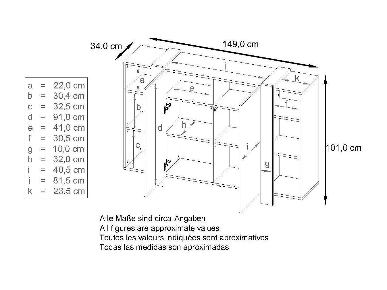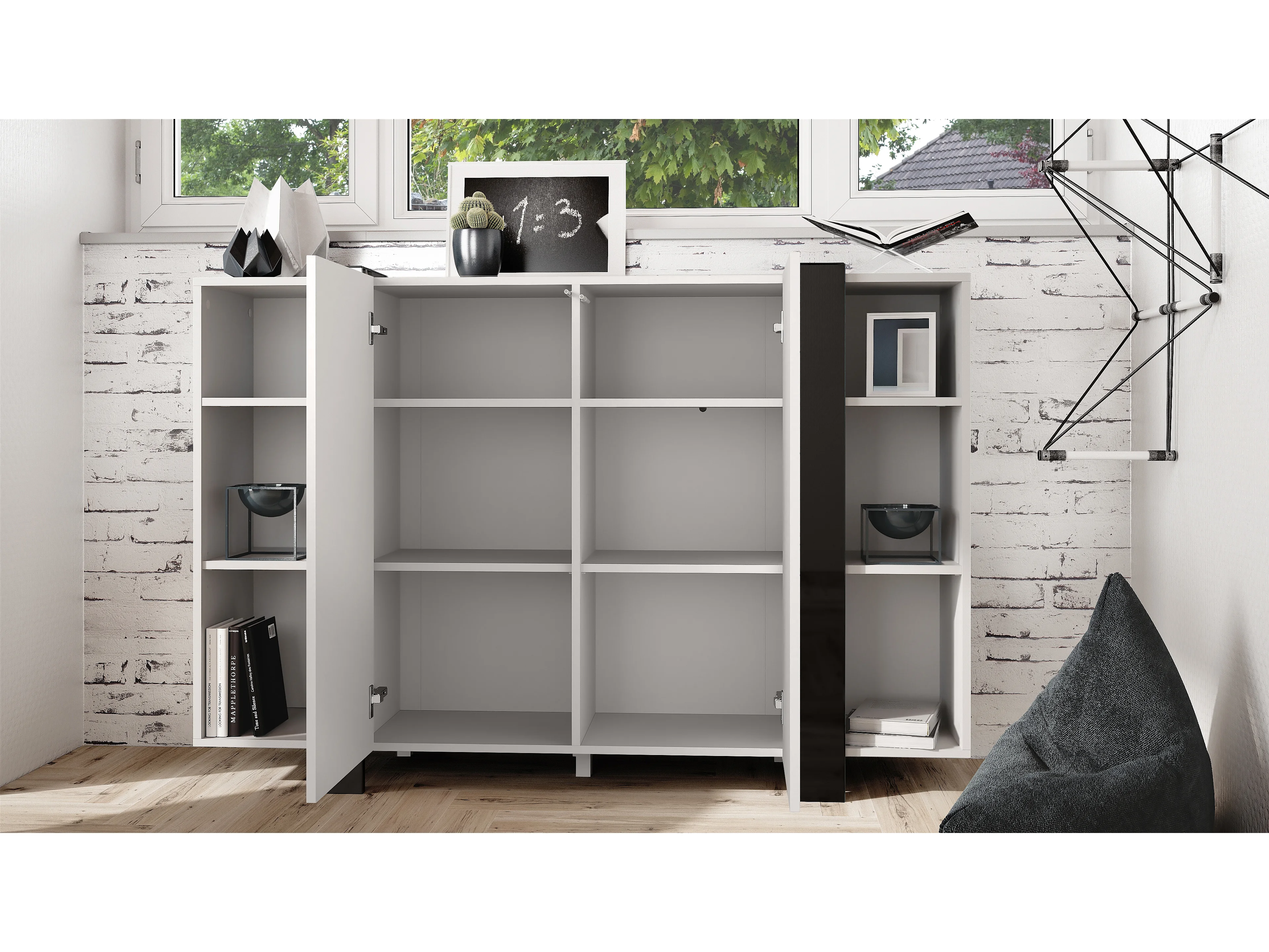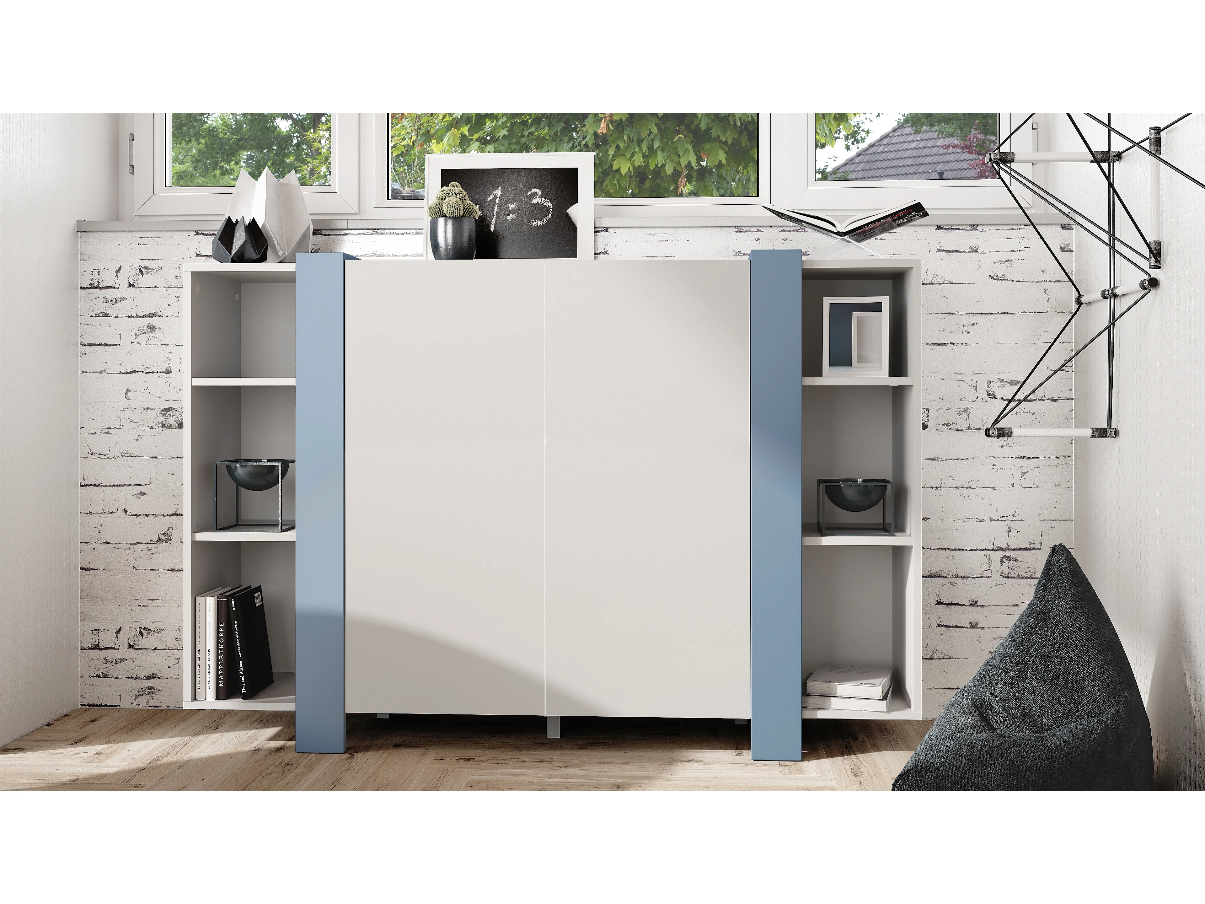 meuble haut Ida V2, Buffet avec 12 compartiments, caisson en blanc mat, bandeaux en denim mat, (149 x 101 x 34 cm) | Grand choix de couleurs