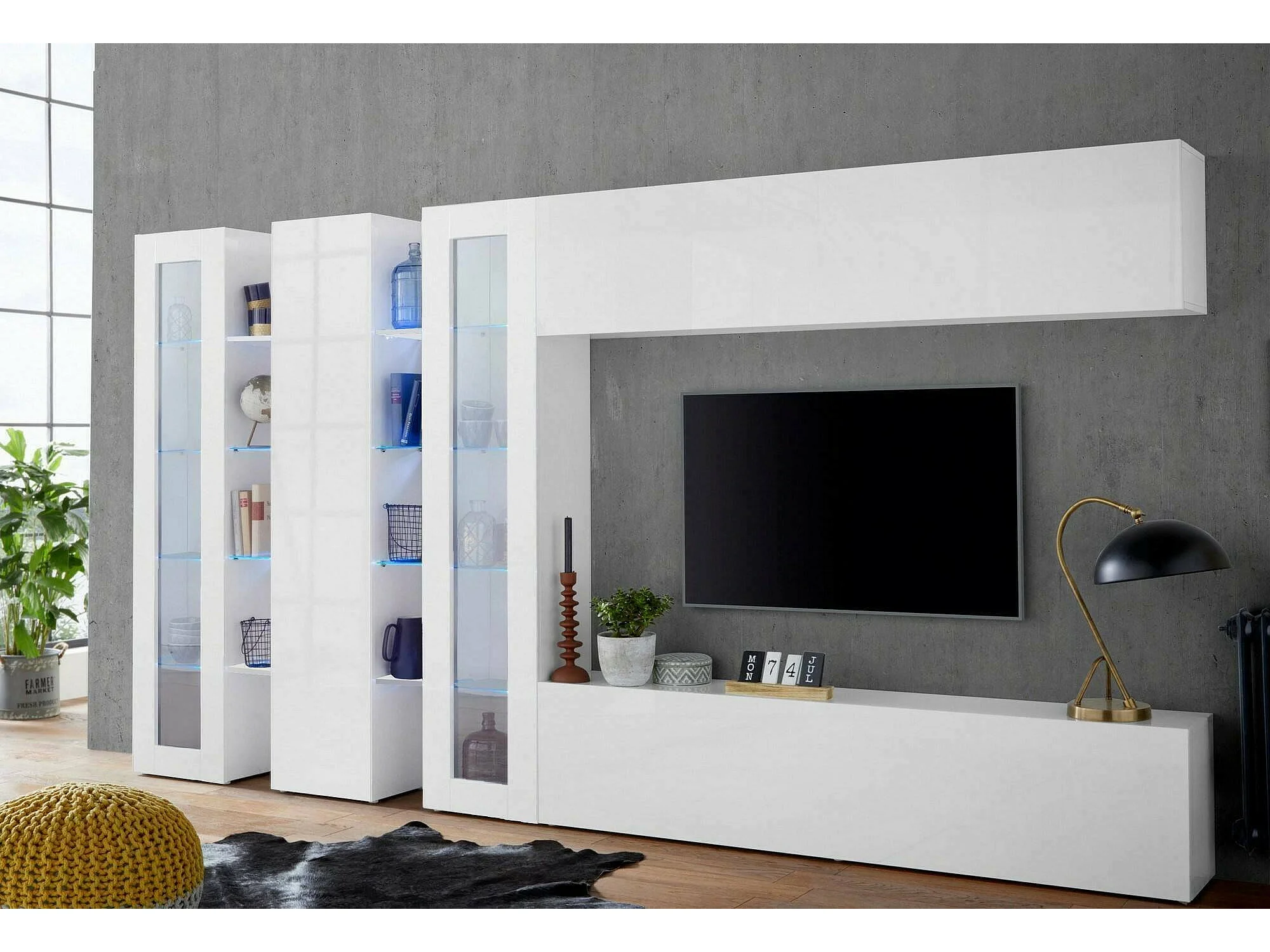 Système mural Clemente, meuble TV 5 portes, Meuble de salon polyvalent, 100% Made in Italy, 340x30h180 cm, Blanc brillant