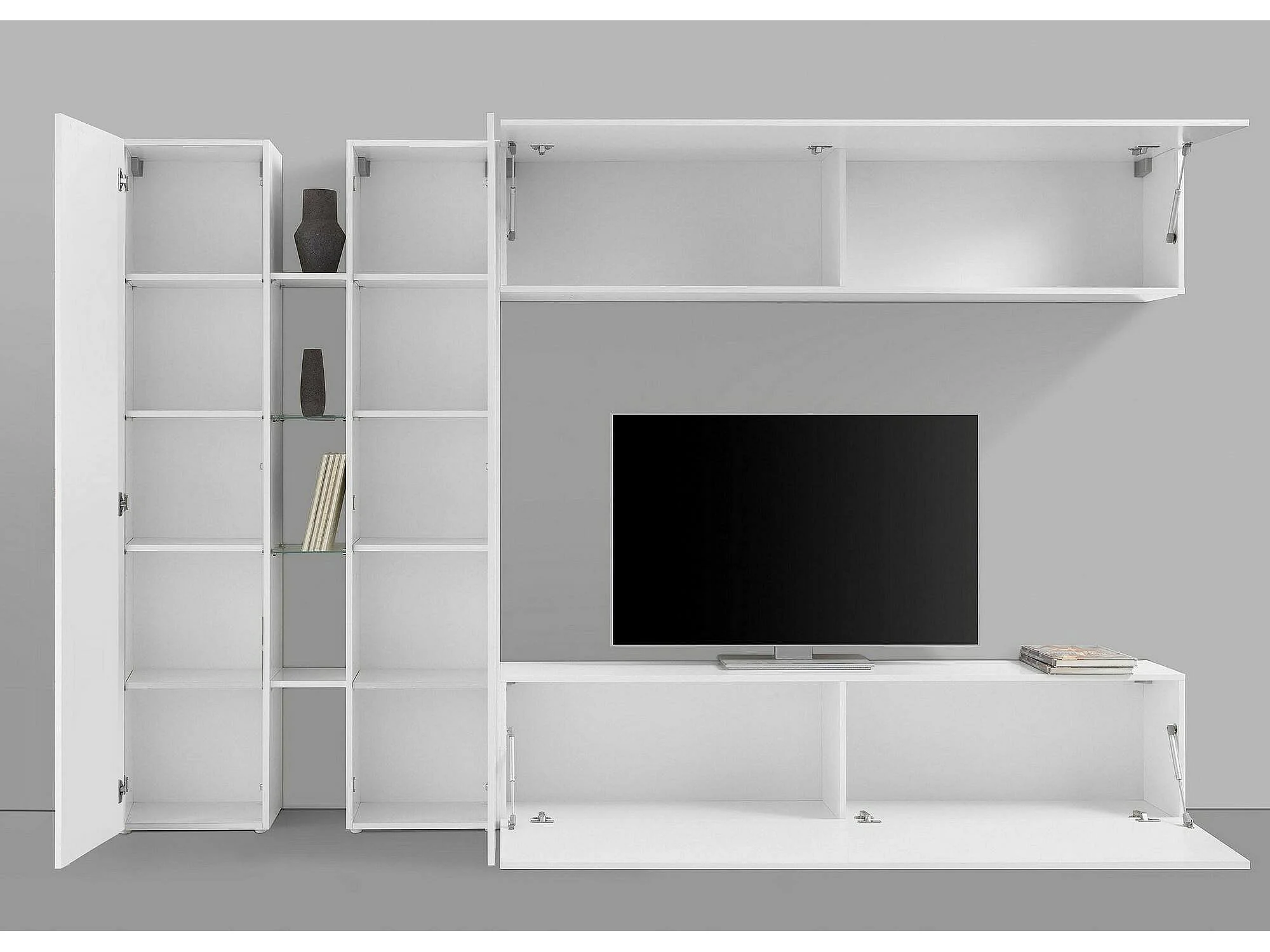 Ensemble mural Costanzo, meuble TV 4 portes, meuble de salon polyvalent, 100% Made in Italy, 280x30x180 cm, Blanc brillant