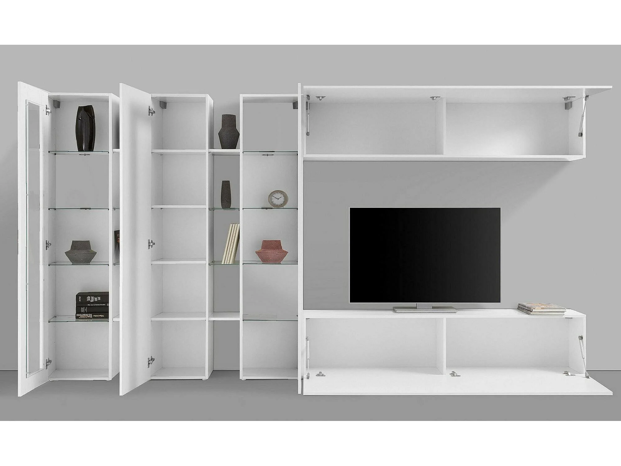 Système mural Dbenal, meuble TV 5 portes, Meuble de salon polyvalent, 100% Made in Italy, 340x30h180 cm, Blanc brillant