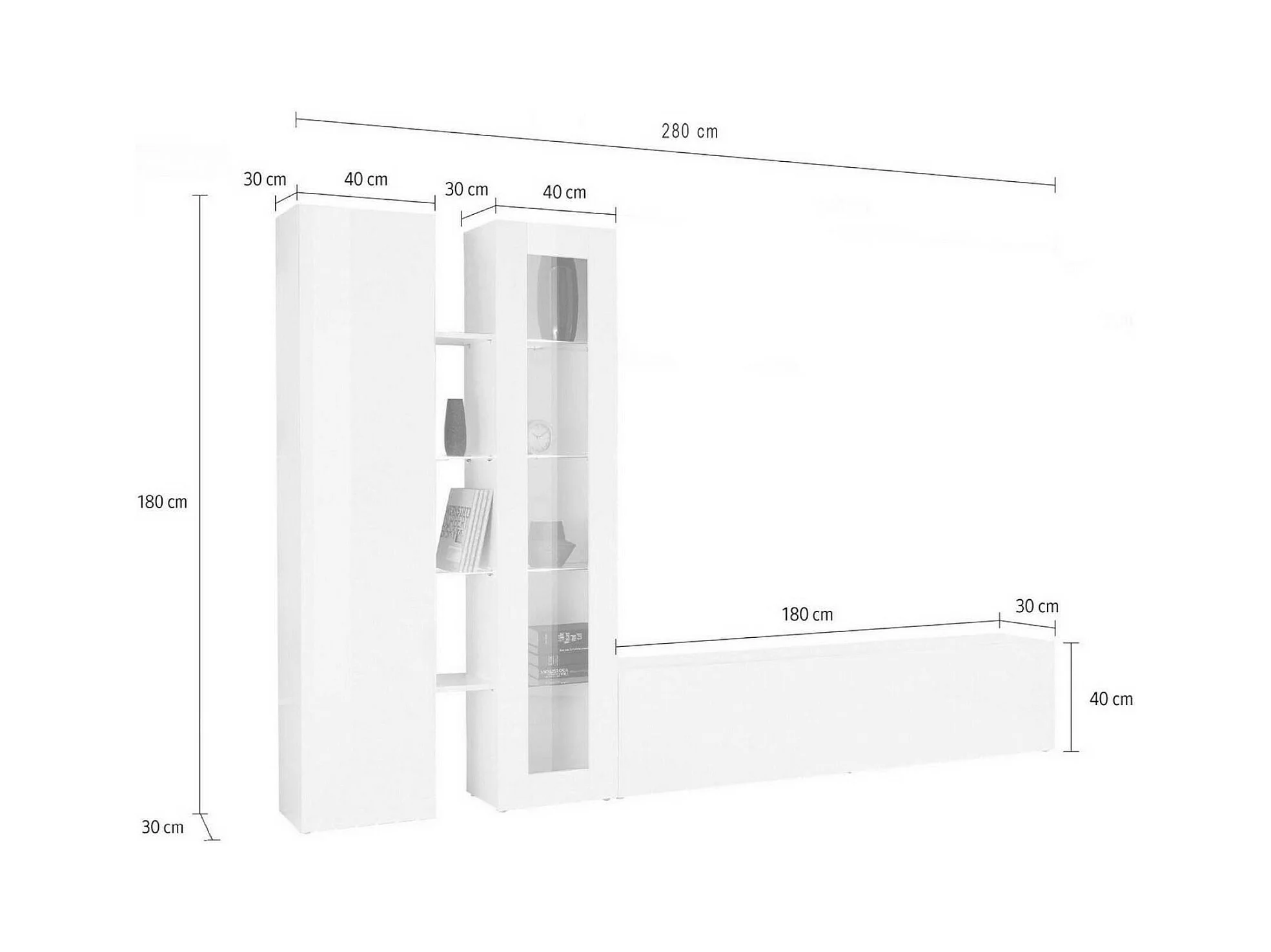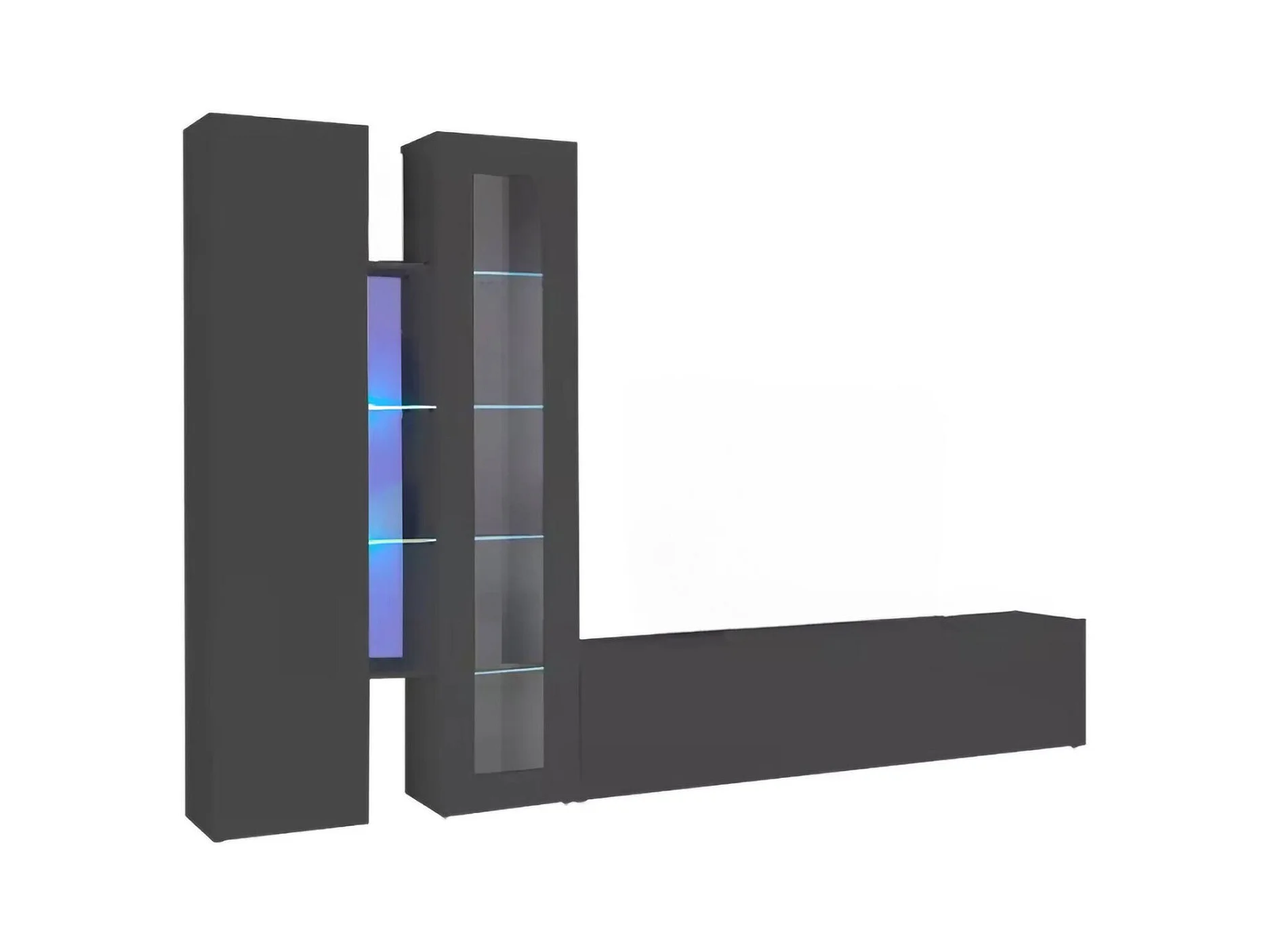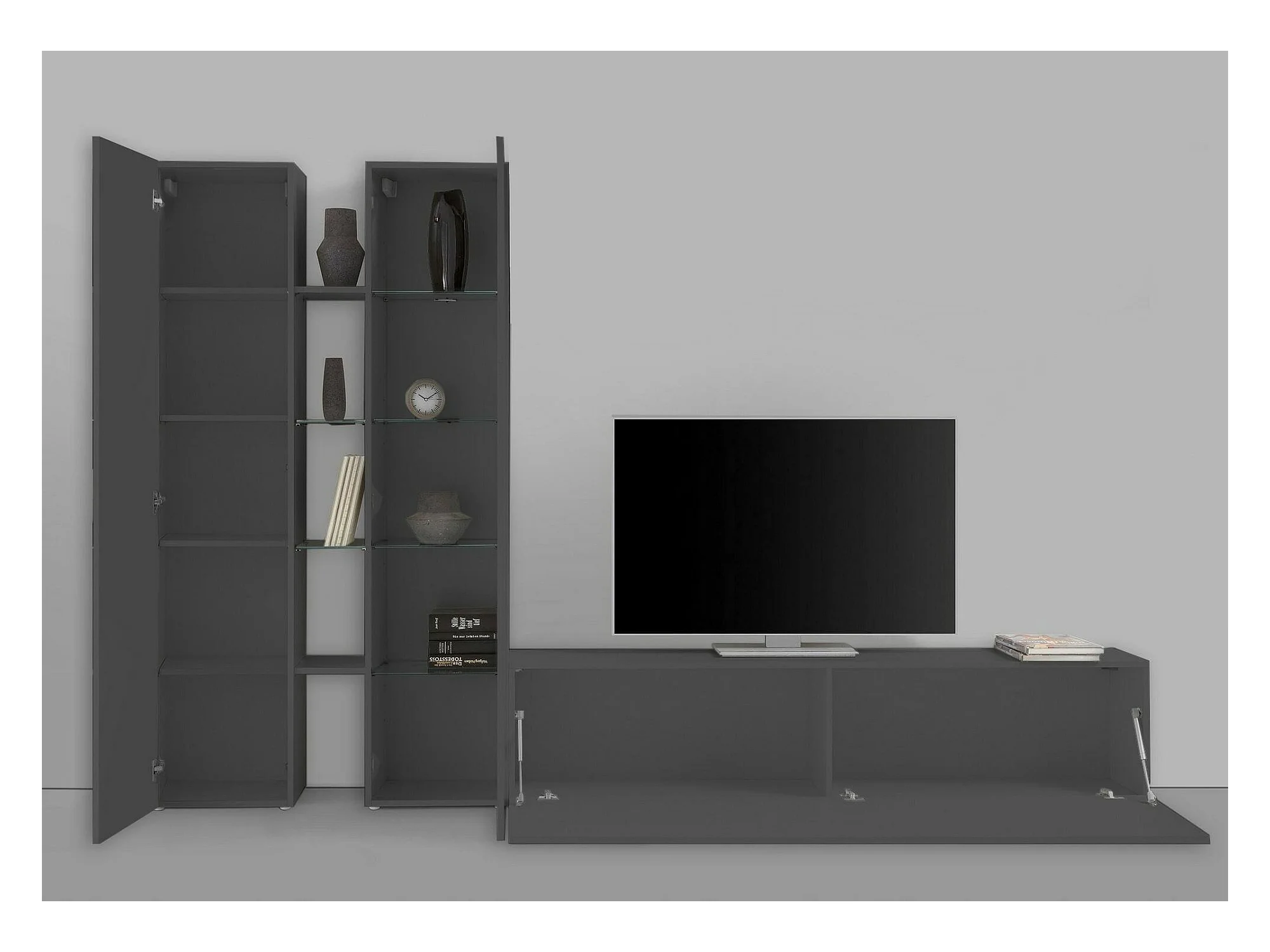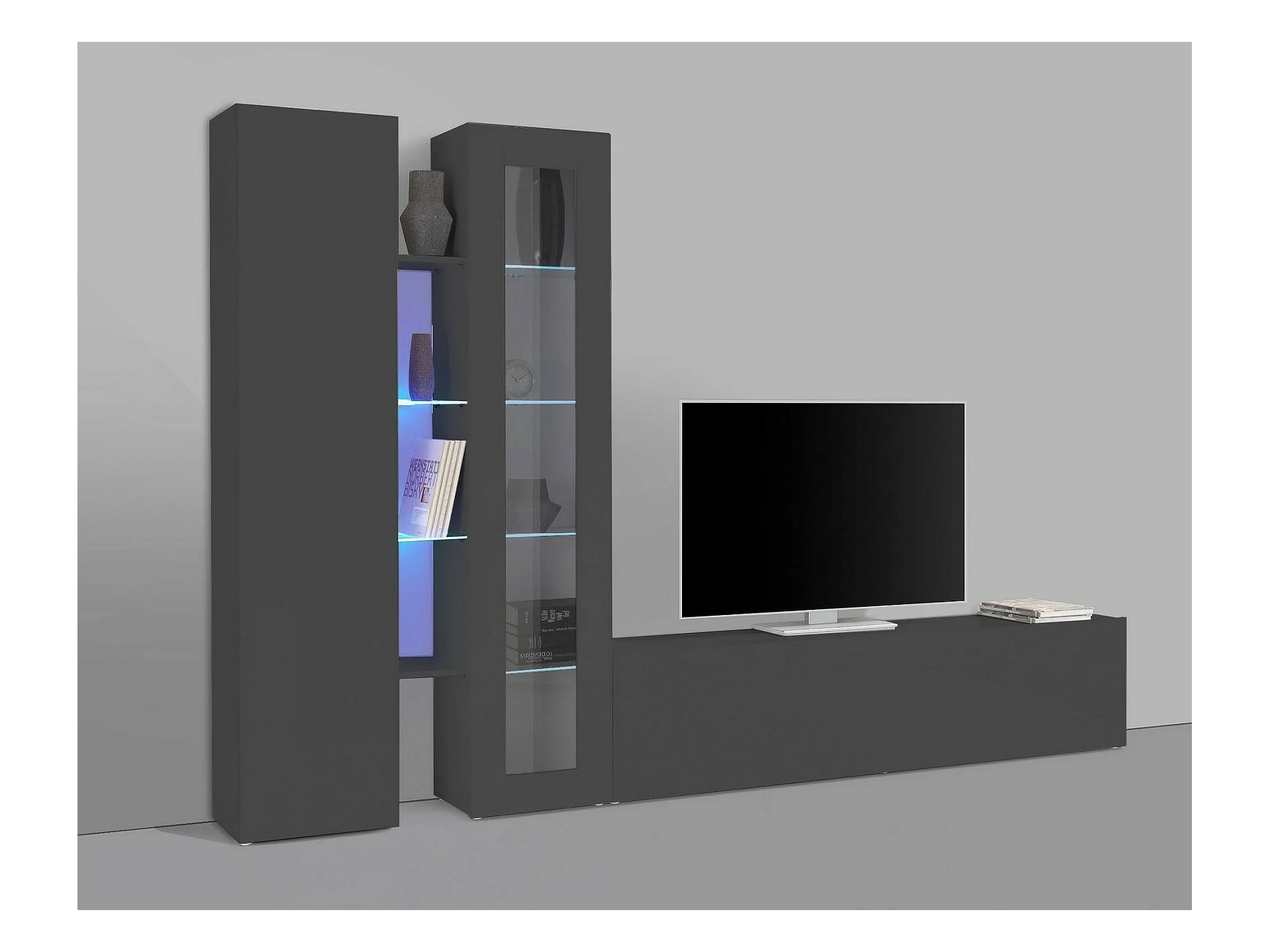 Élément mural Dimitri, meuble TV 3 portes, meuble de salon polyvalent avec vitrine et lumière LED, 100% Made in Italy, 280x30h180 cm, Anthracite