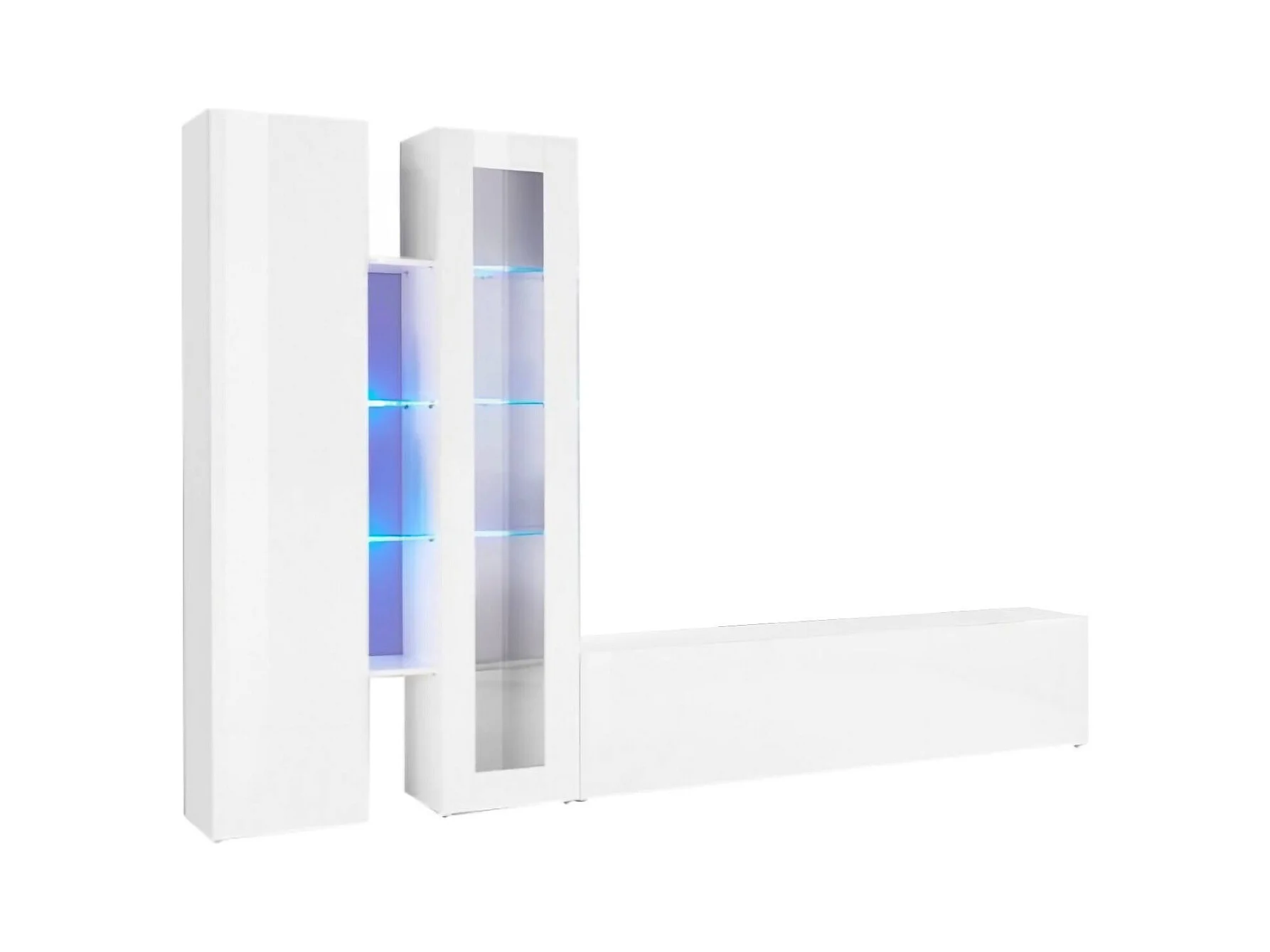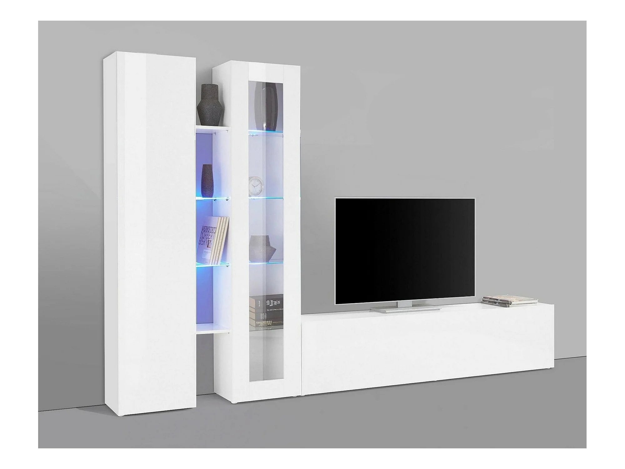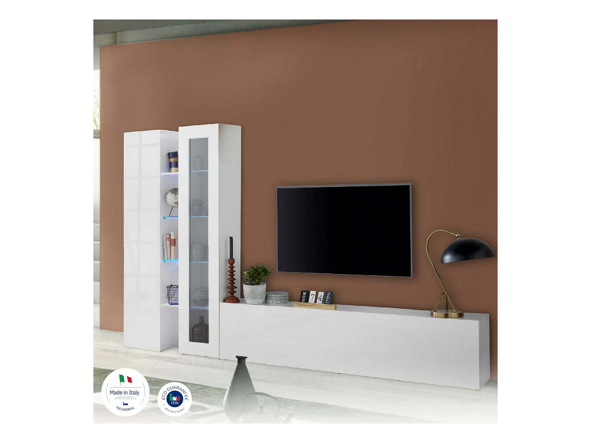 Élément mural Dimitri, meuble TV 3 portes, Meuble de salon polyvalent avec vitrine et lumière LED, 100% Made in Italy, 280x30h180 cm, Blanc brillant