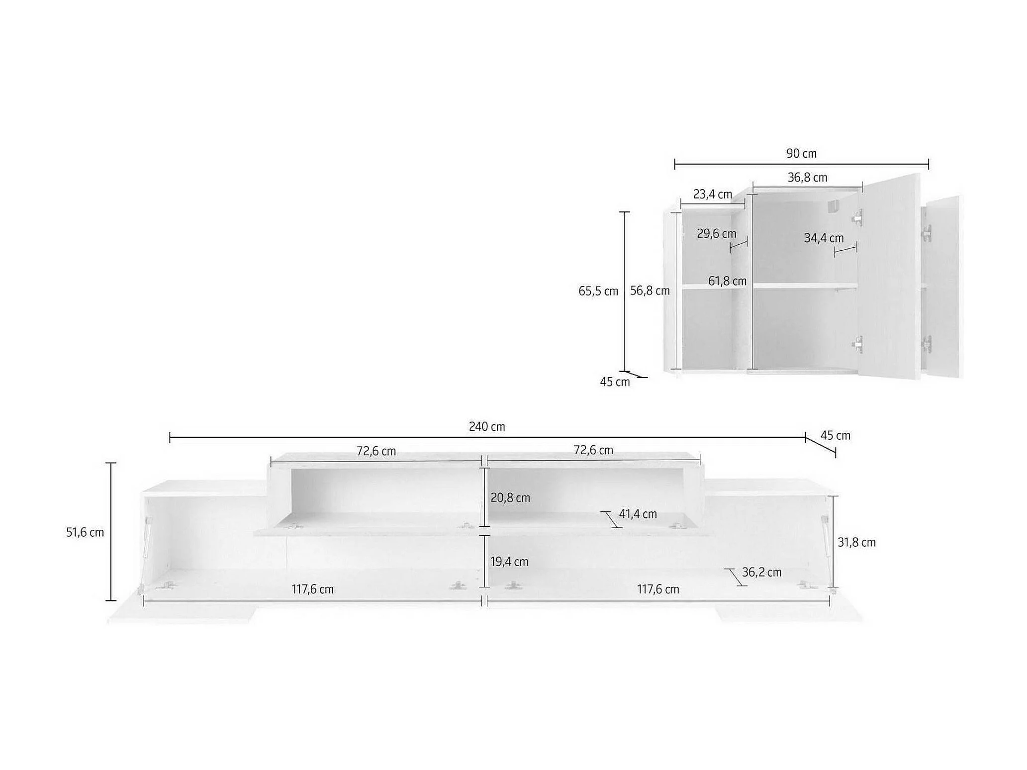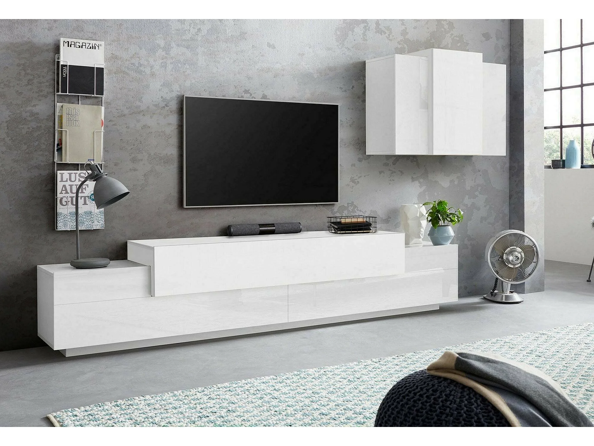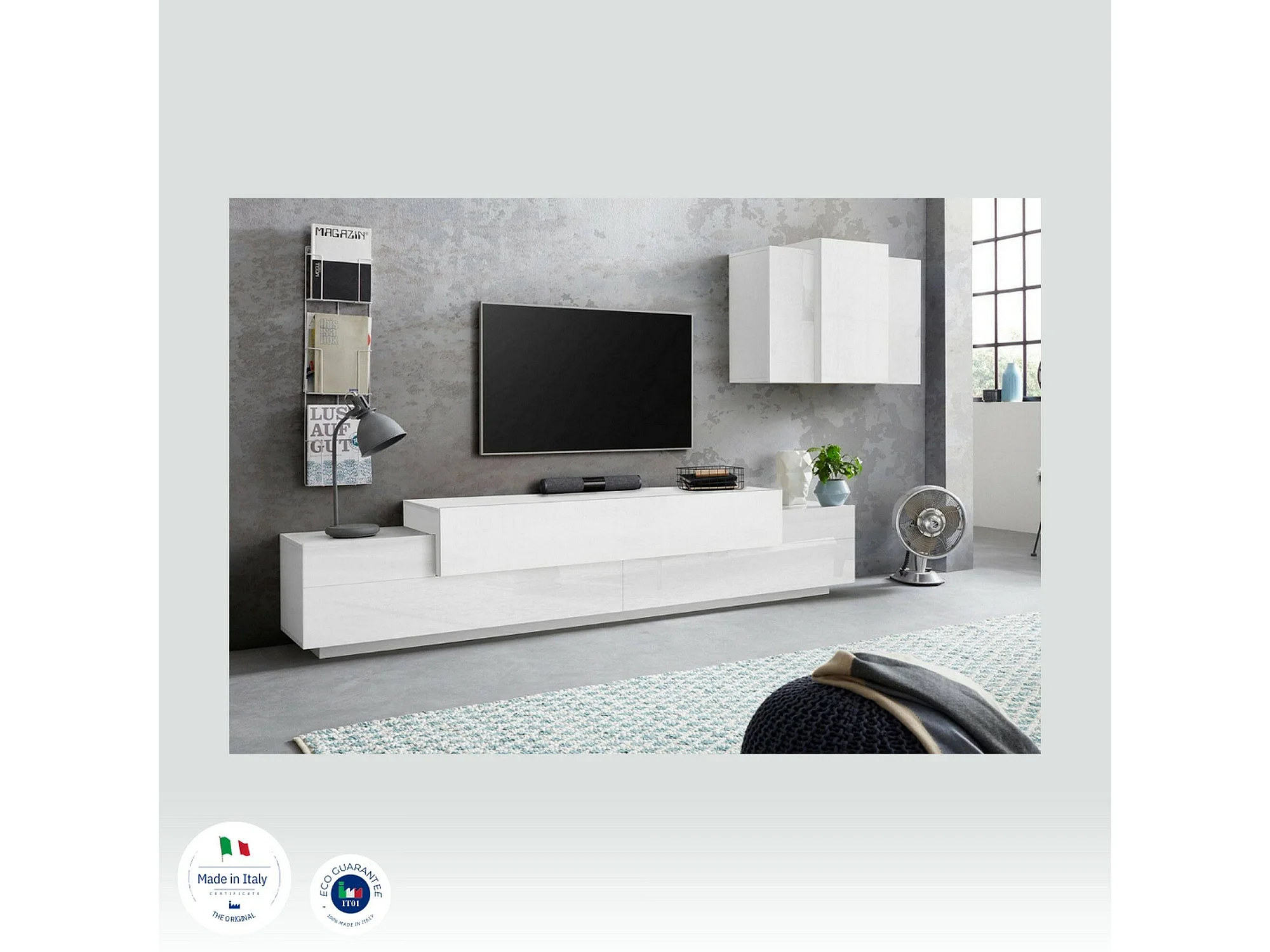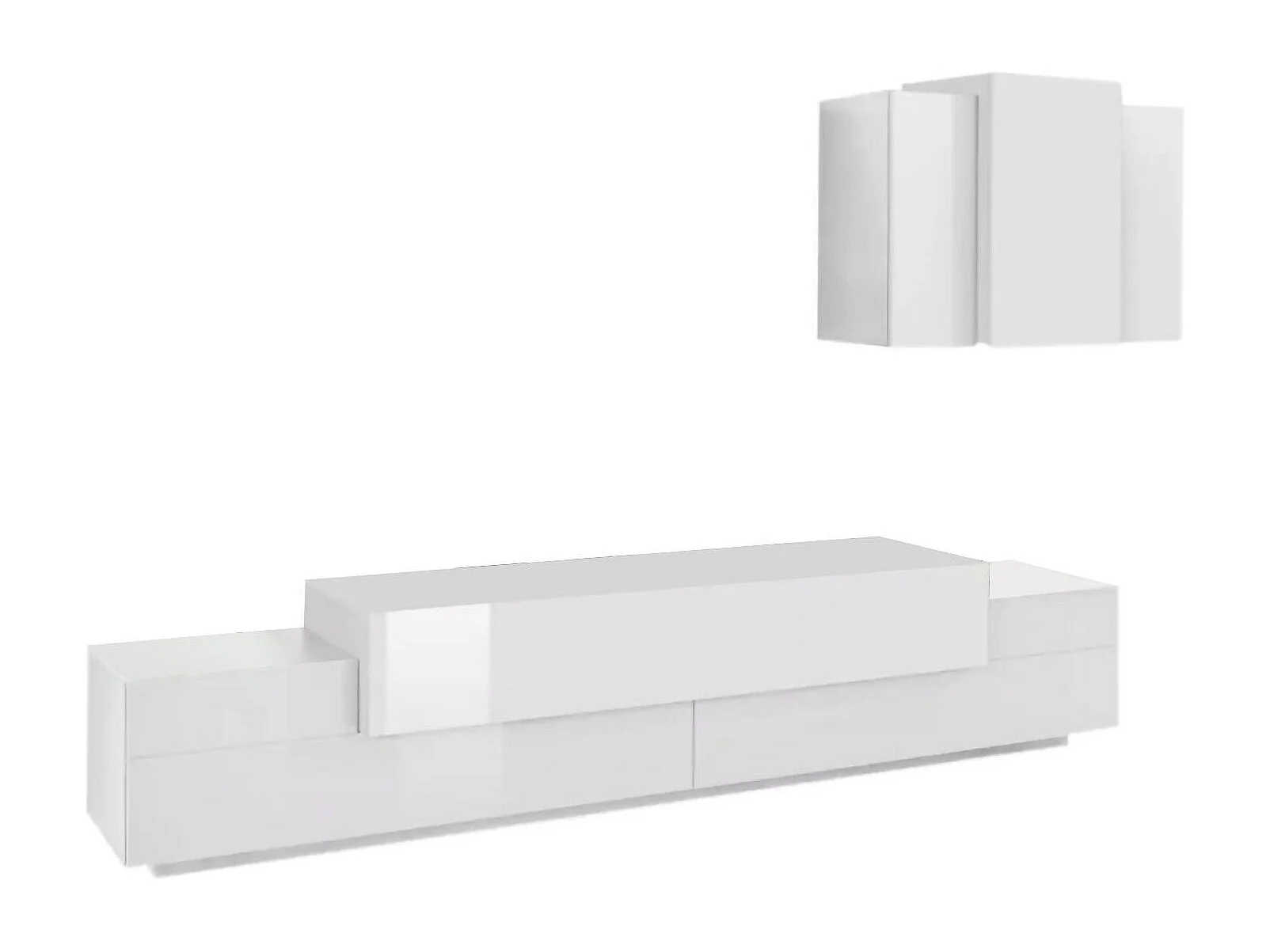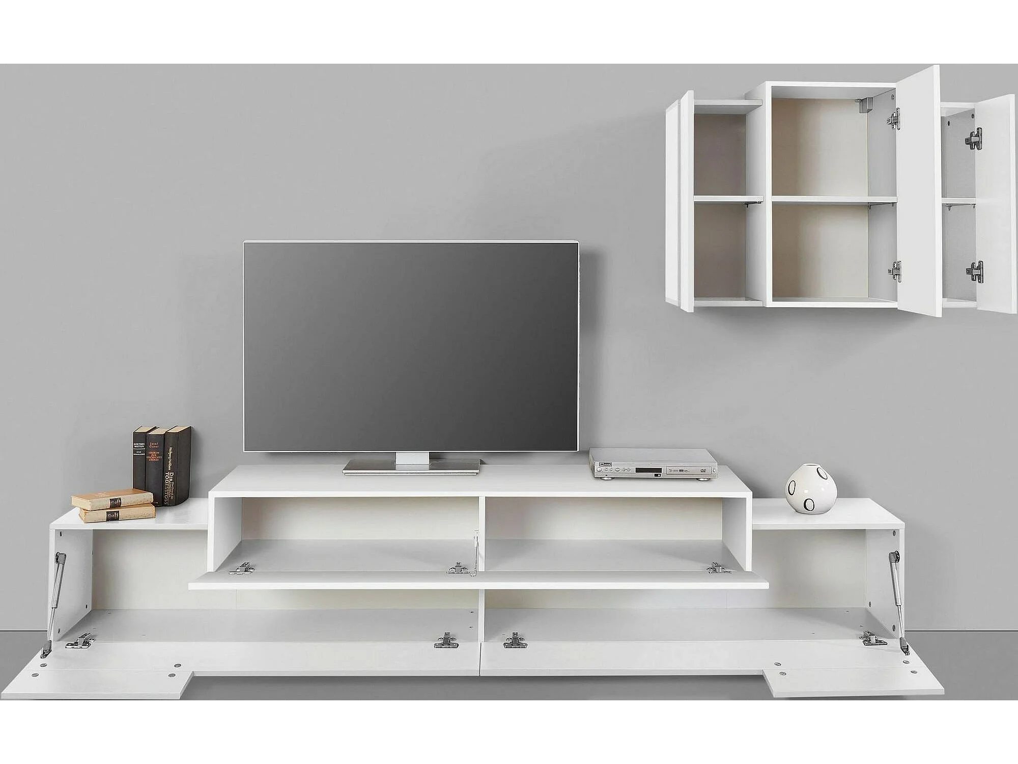 Système mural Dmar, ensemble de salon meuble TV, meuble de salon polyvalent, 100% Made in Italy, 240x45h180 cm, Blanc brillant
