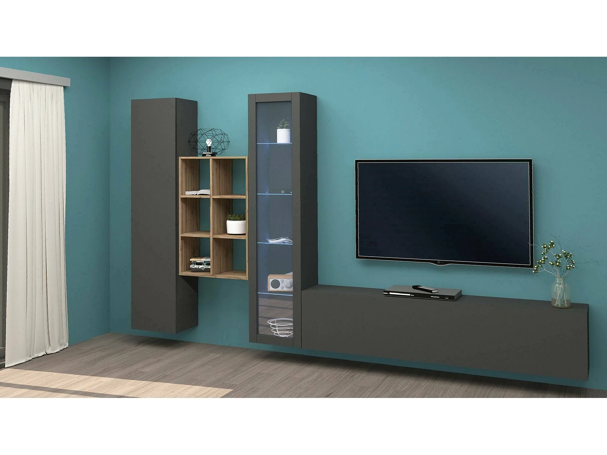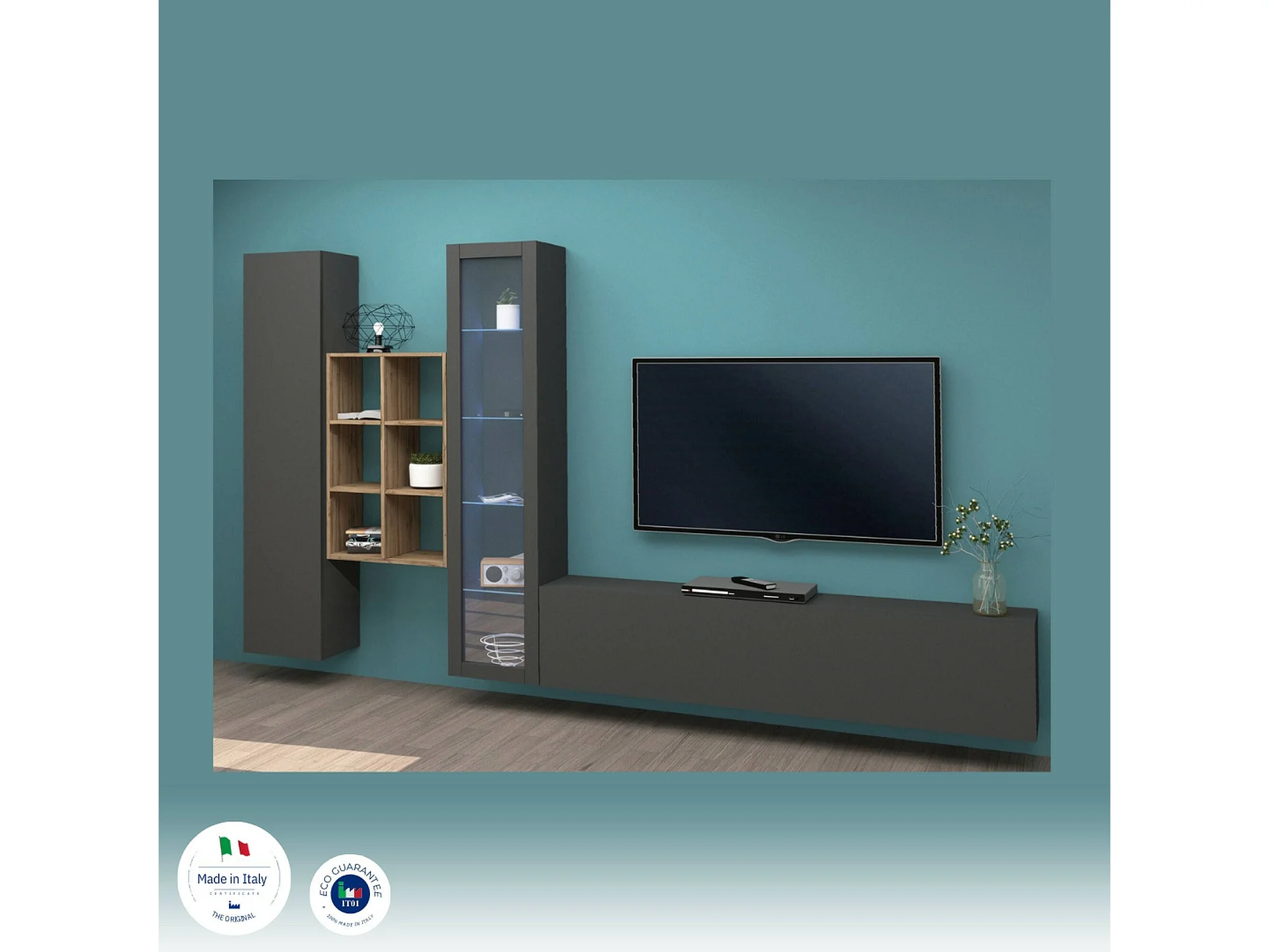 Système mural Eugenio, meuble TV 3 portes, Meuble de salon polyvalent avec vitrine et lumière LED, 100% Made in Italy, 320x30h180 cm, Anthracite