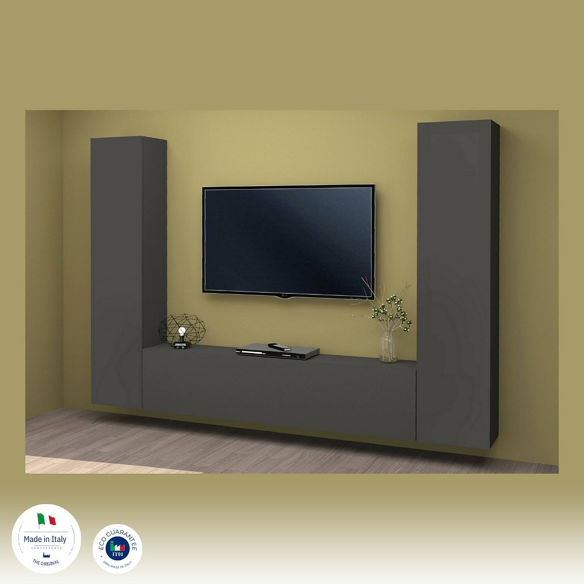 MEUBLE MURAL - Ensemble de salon Meuble TV avec 3 portes, Meuble de salon polyvalent, 100% Made in Italy, cm 260x30h180, Anthracite.