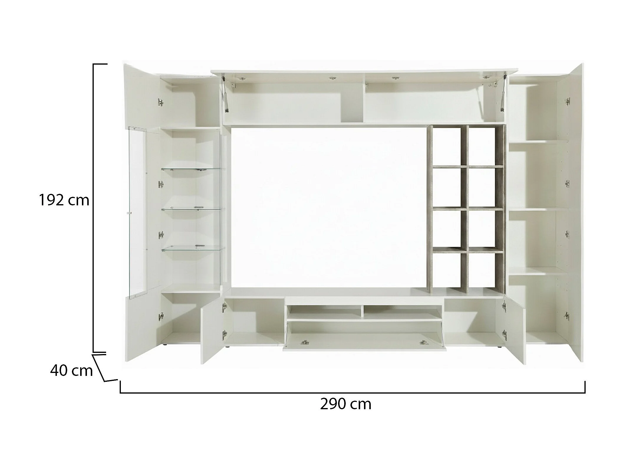 Unité murale Iago, ensemble de salon meuble TV, Meuble de salon polyvalent, 100% Made in Italy, 290x40h192 cm, Blanc brillant et béton