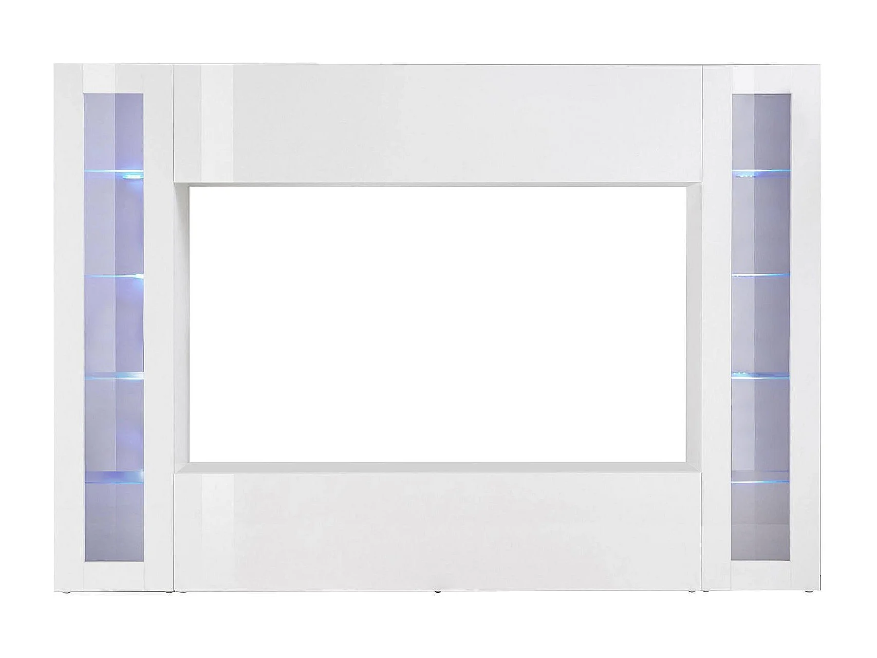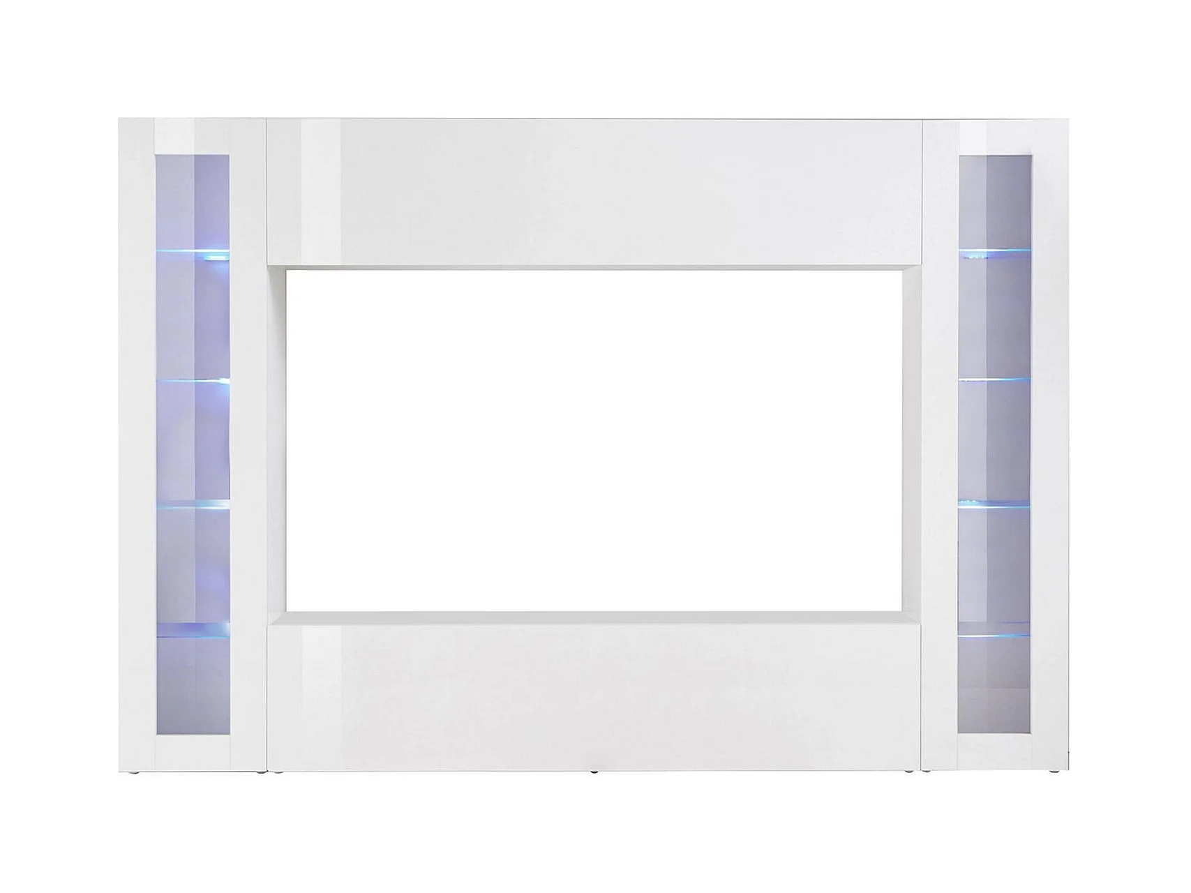 Élément mural Luigi, meuble TV 4 portes, Meuble de salon polyvalent, 100% Made in Italy, 260x30h180 cm, Blanc brillant, avec lumière LED bleue et deux vitrines