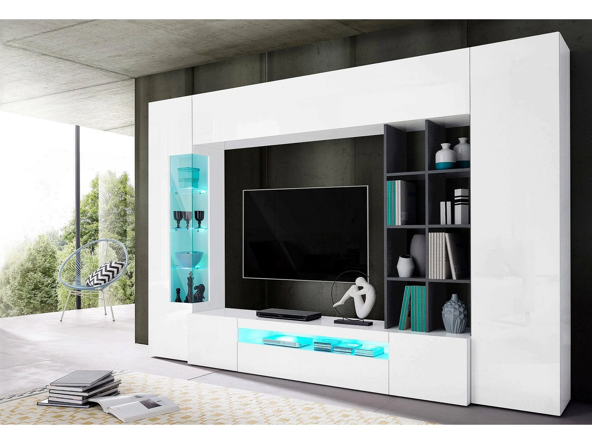 Ensemble mural Ocean, meuble TV pour salon, meuble de salon polyvalent avec lumière LED, 100% Made in Italy, 290x40h192 cm, blanc brillant et ardoise