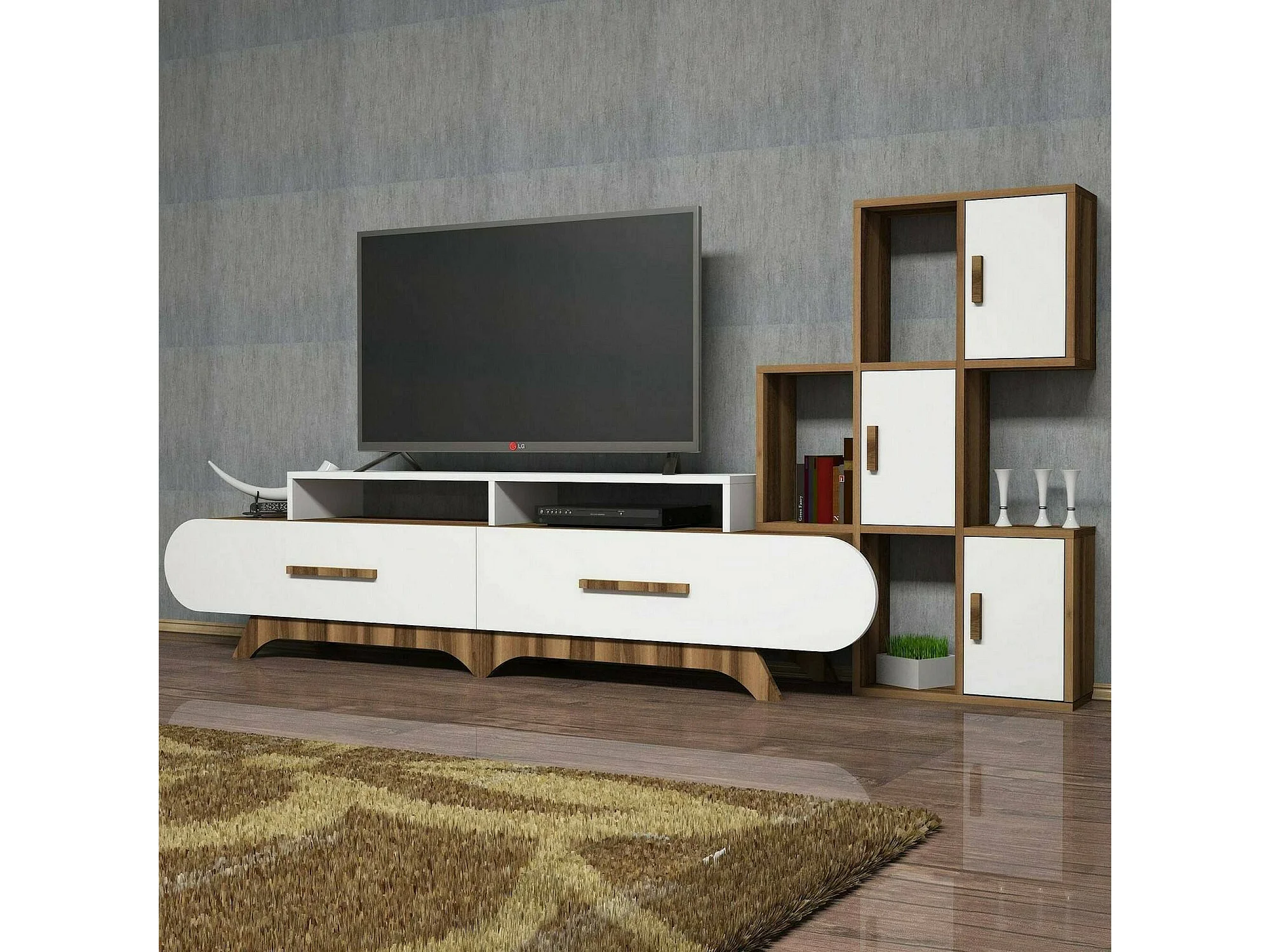 Meuble Mural Zephyria, Composition du salon, Meubles de salon polyvalents, Meuble télé, 205x37h50 cm, Noyer et Blanc