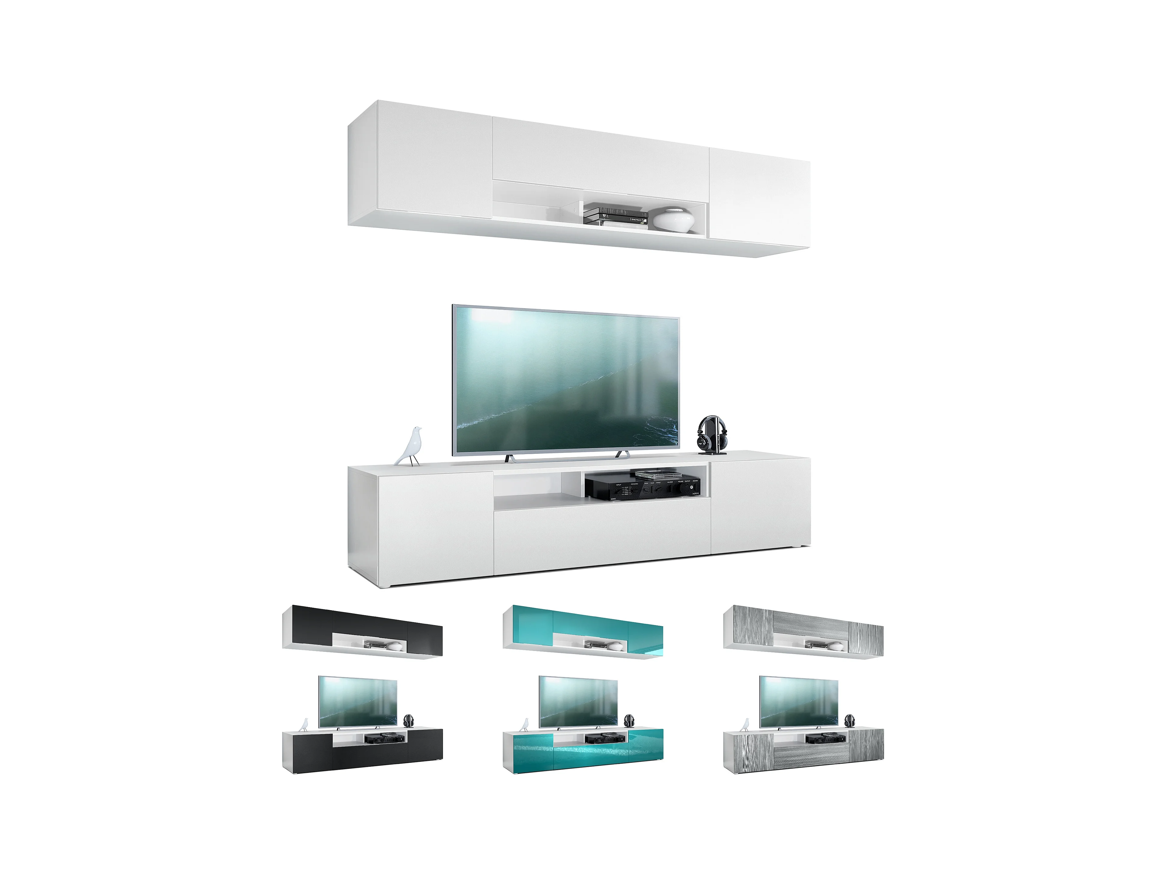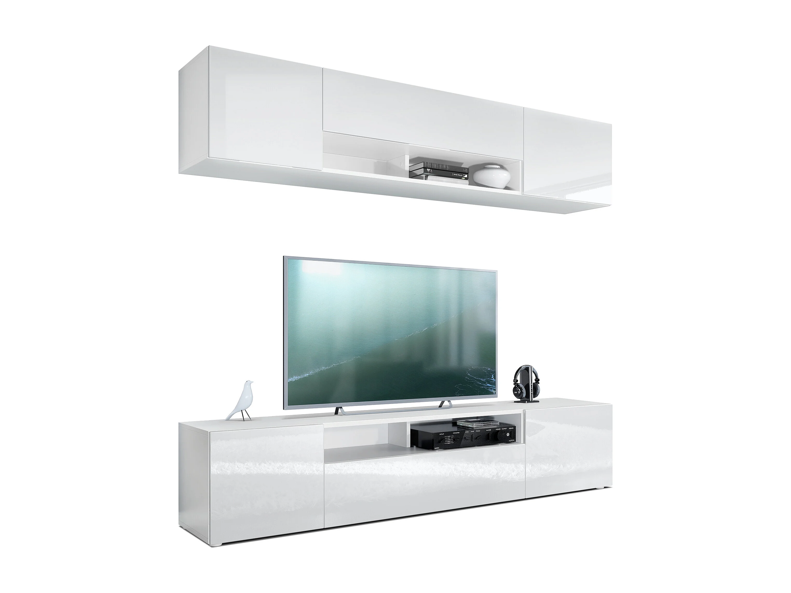 Meuble-paroi Mogan, blanc mat/blanc haute brillance - Meuble mural moderne composé de 2 étagères TV (181 x 147 x 35 cm)