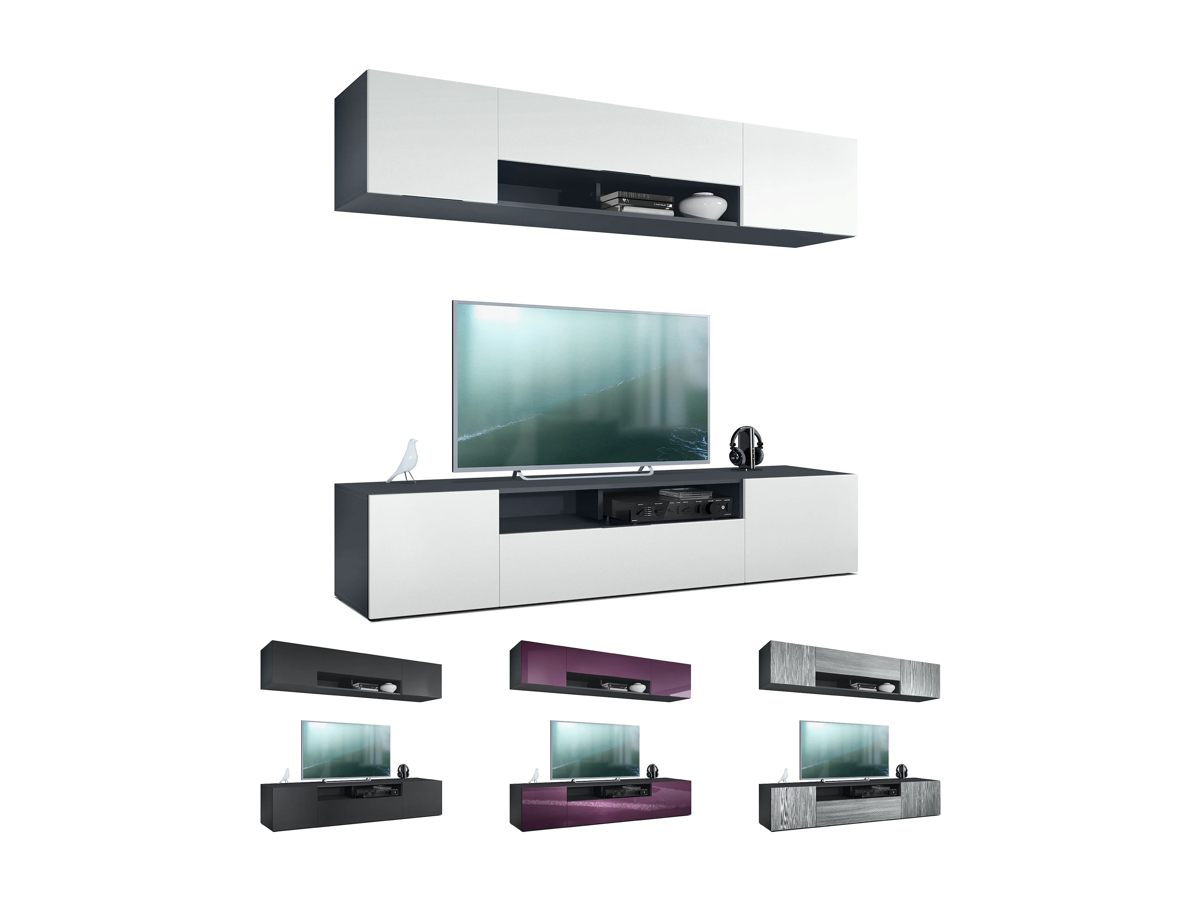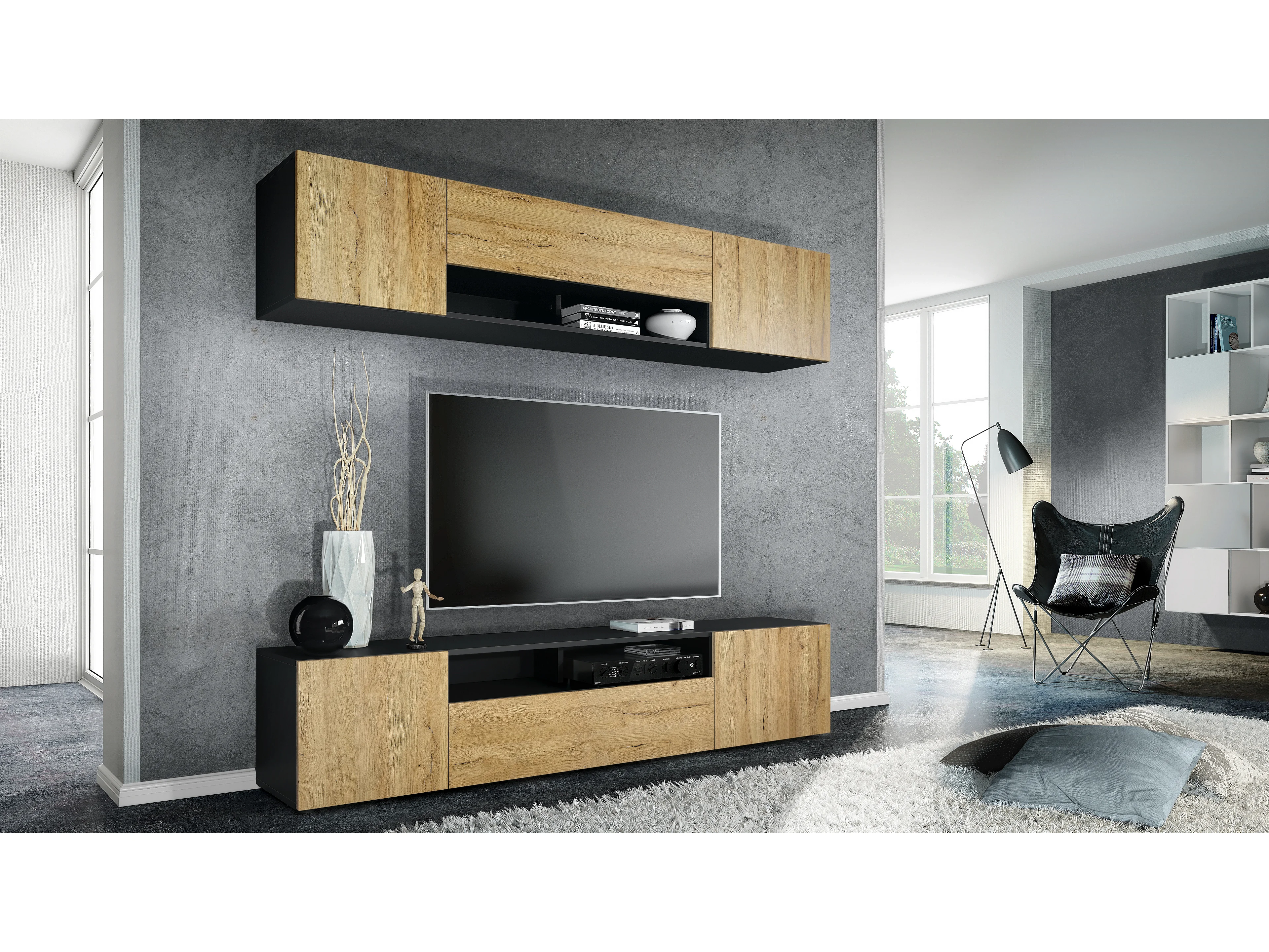 Meuble-paroi Mogan, noir mat/chêne nature - Meuble mural moderne composé de 2 étagères TV (181 x 147 x 35 cm)