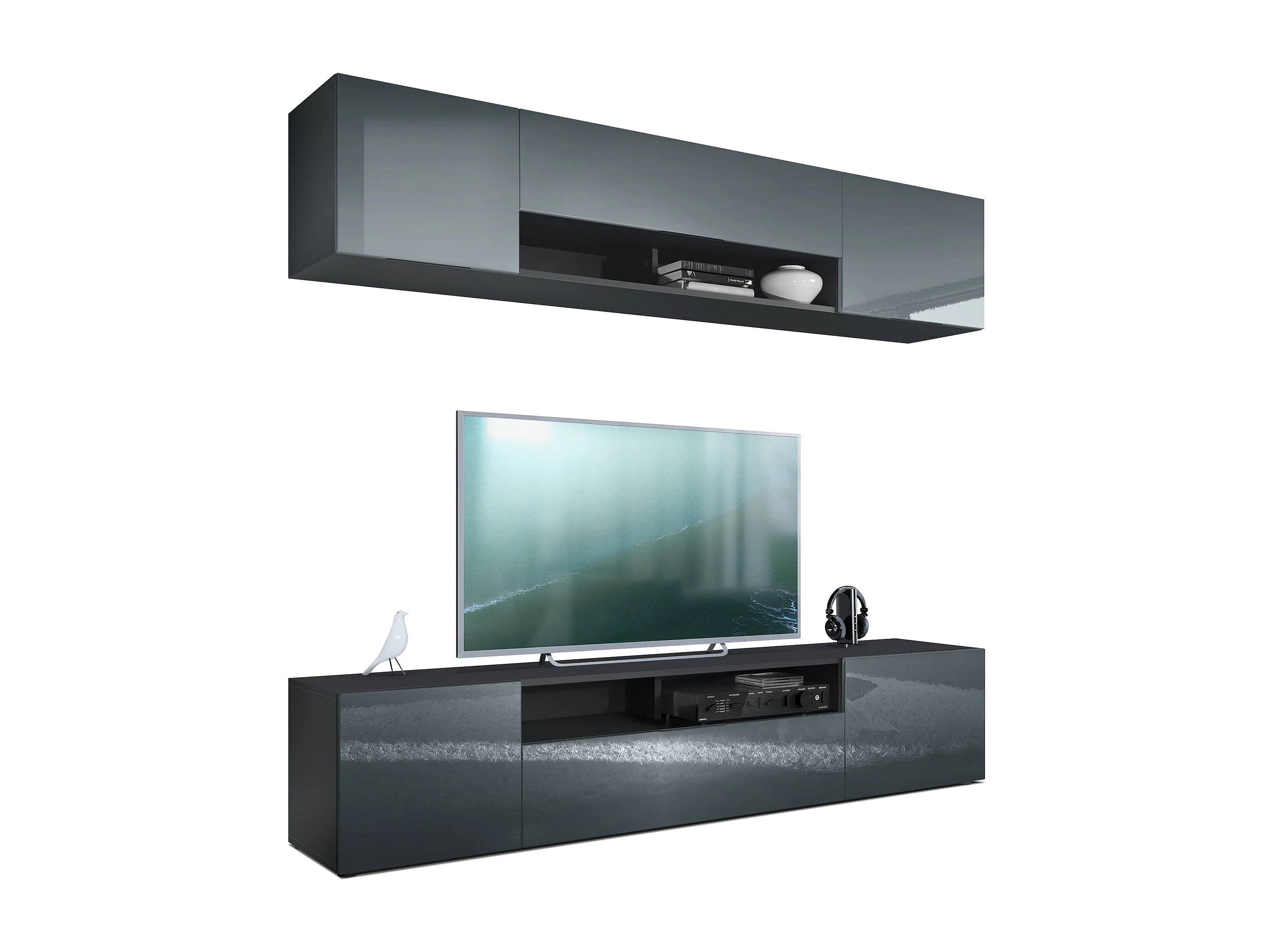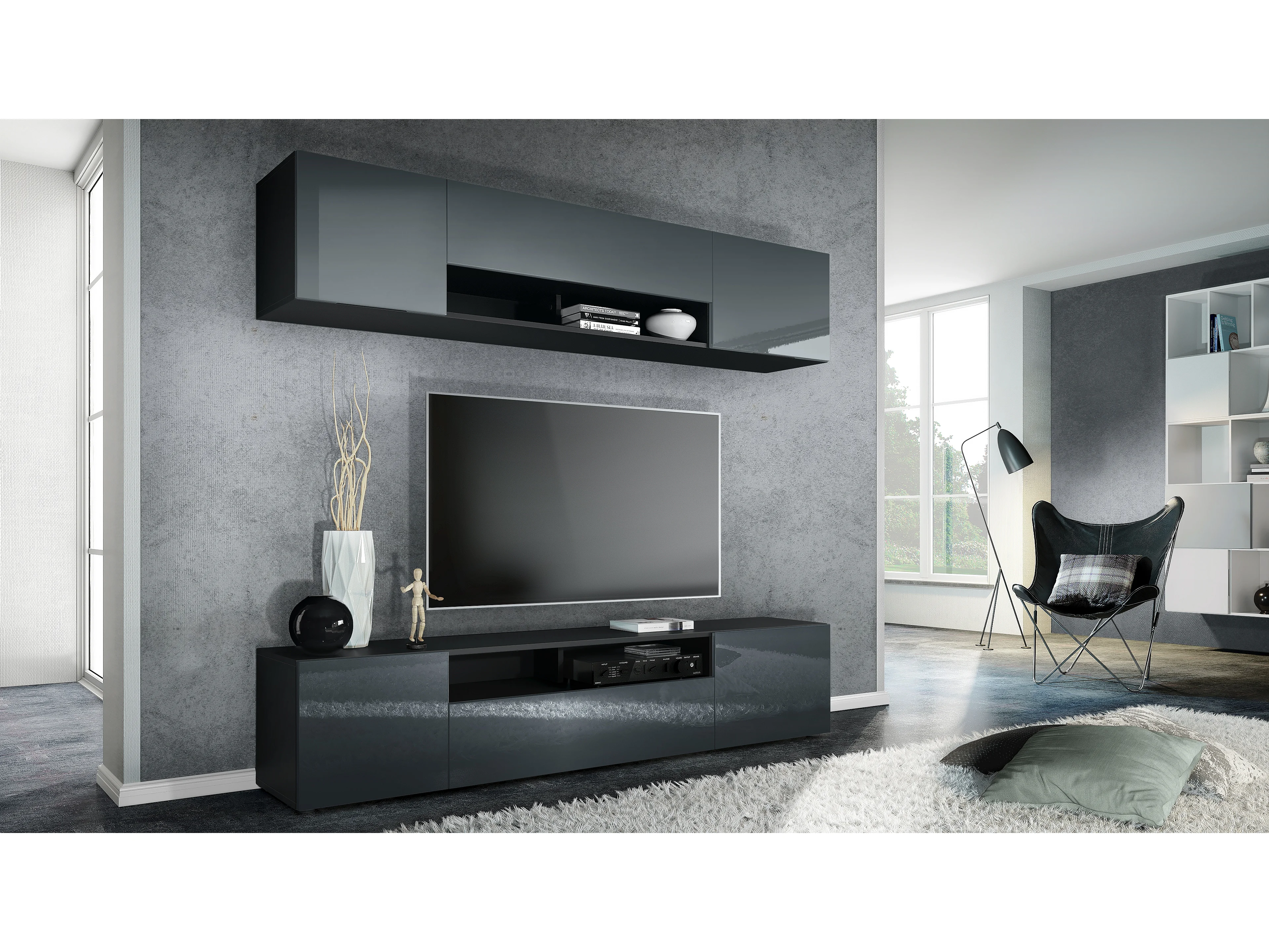 Meuble-paroi Mogan, noir mat/gris haute brillance - Meuble mural moderne composé de 2 étagères TV (181 x 147 x 35 cm)