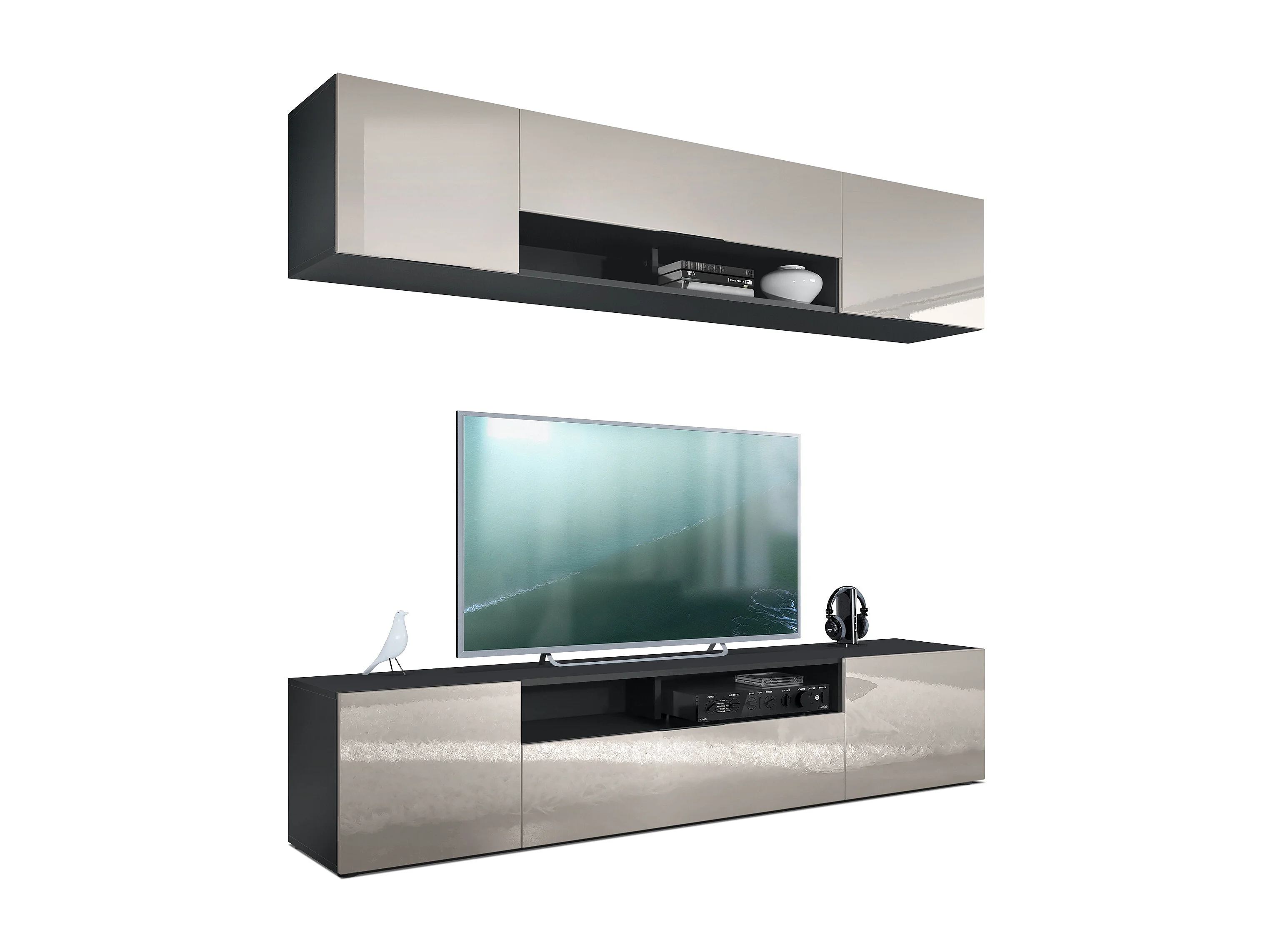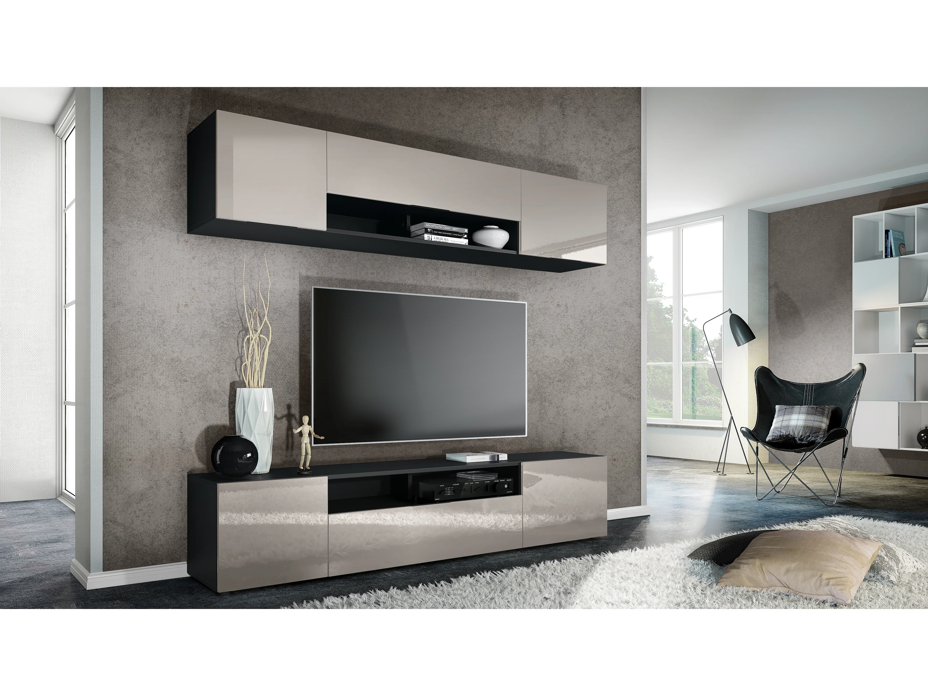 Meuble-paroi Mogan, noir mat/gris sable haute brillance - Meuble mural moderne composé de 2 étagères TV (181 x 147 x 35 cm)