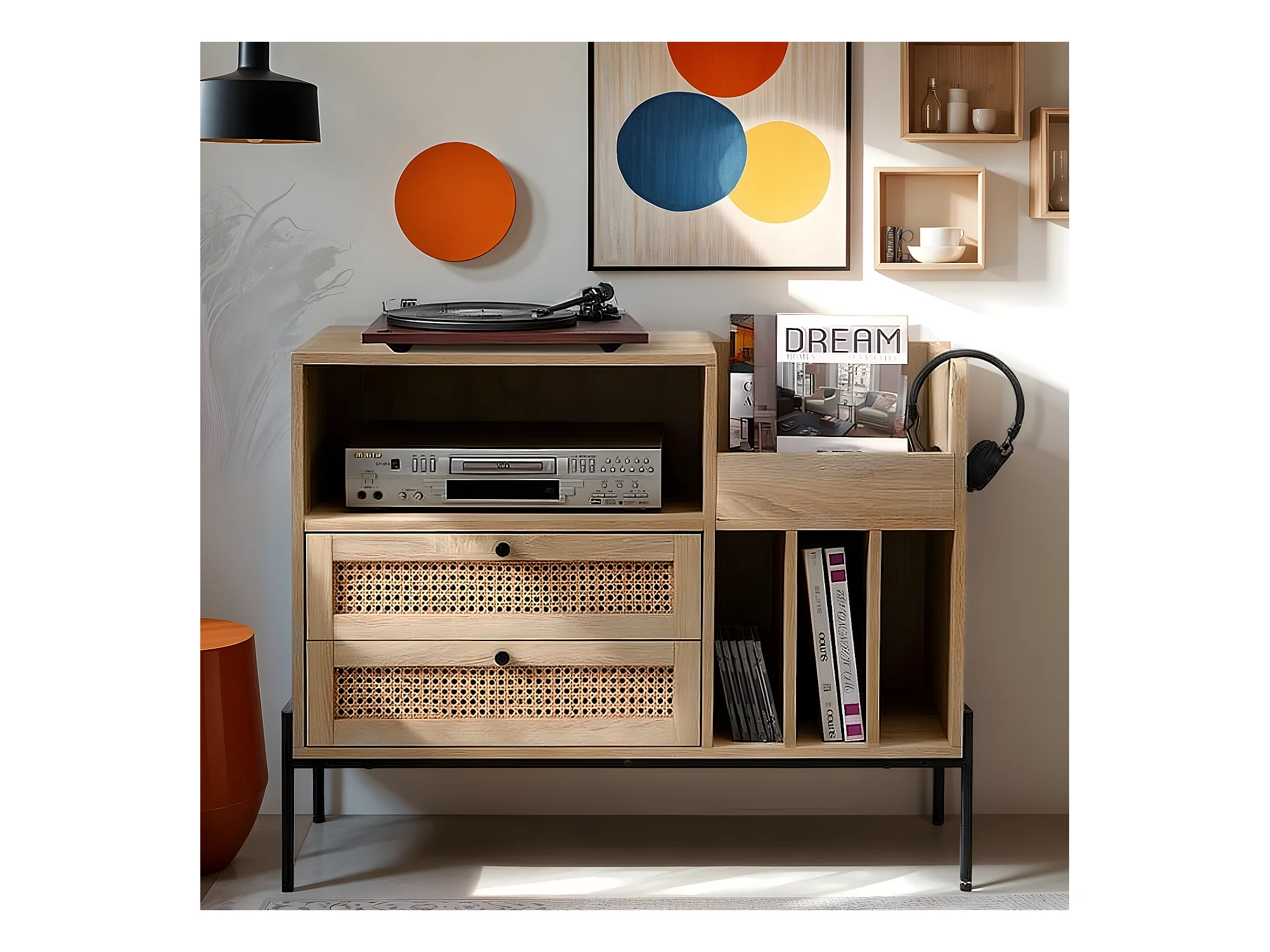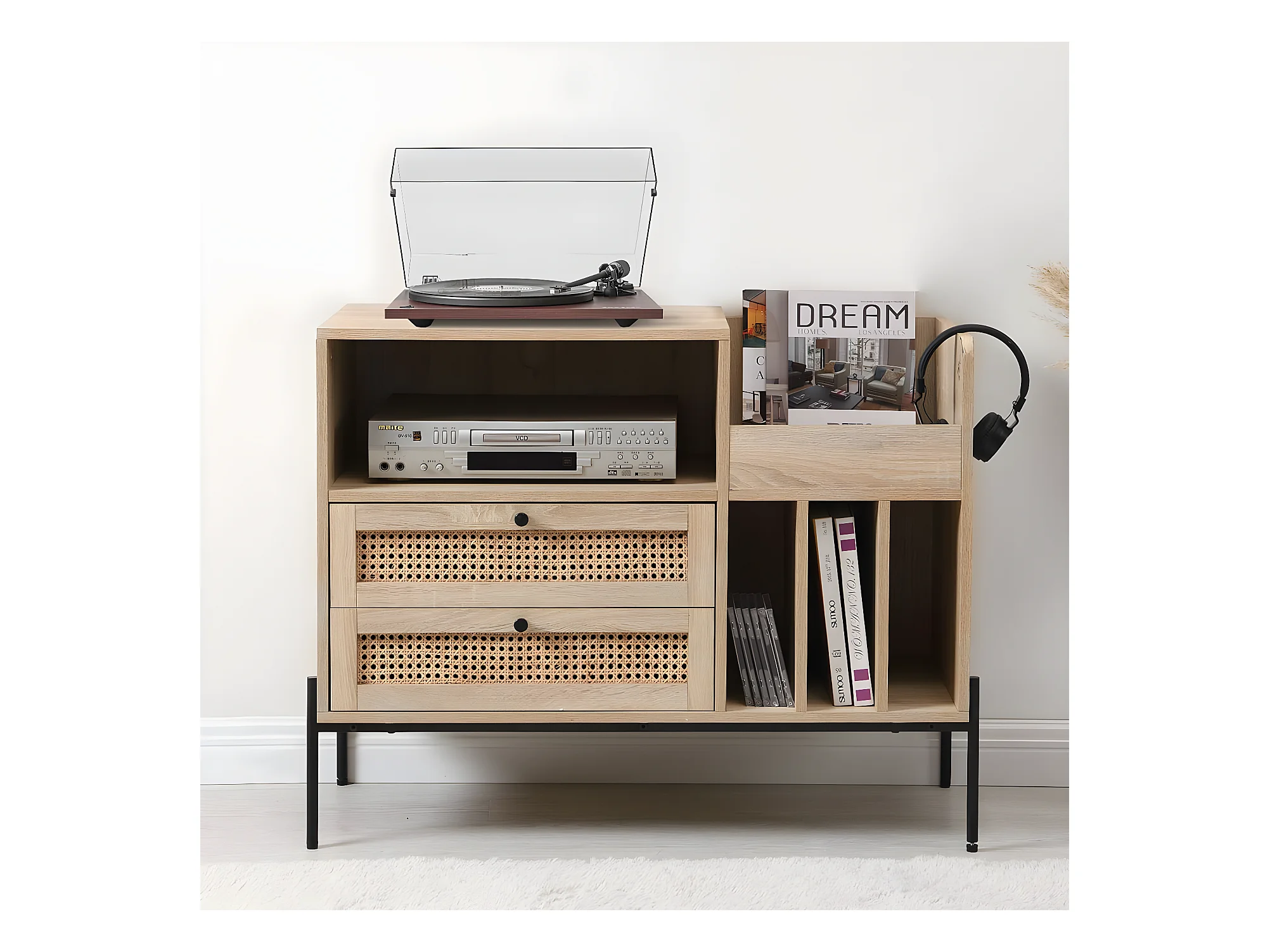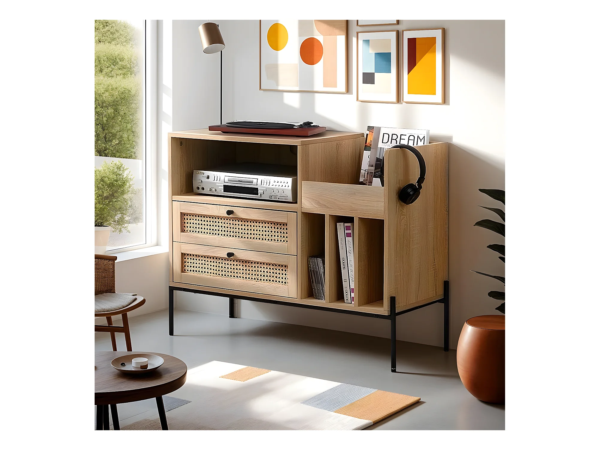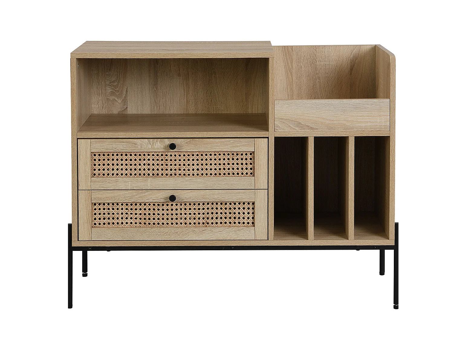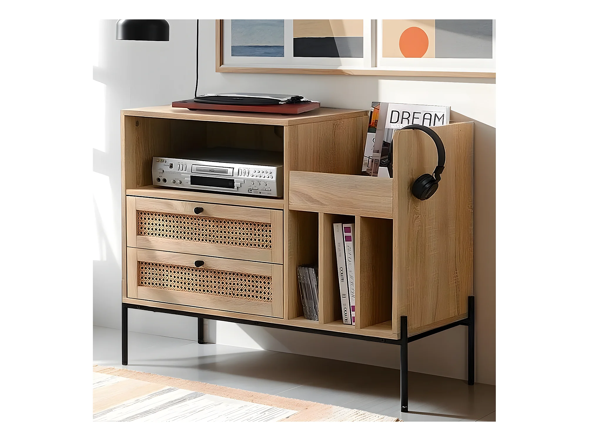 Meuble range vinyles 2 tiroirs en cannage naturel et effet chêne 90 cm - Iris