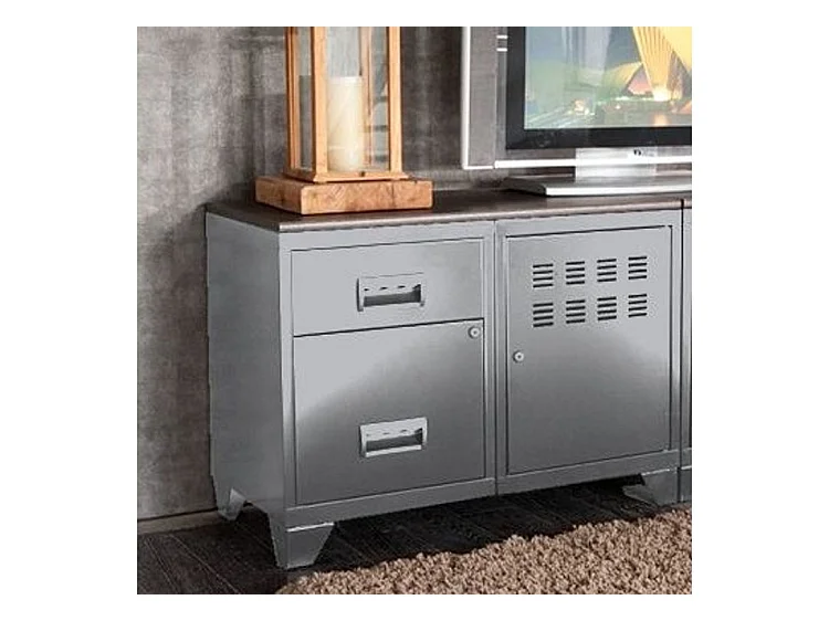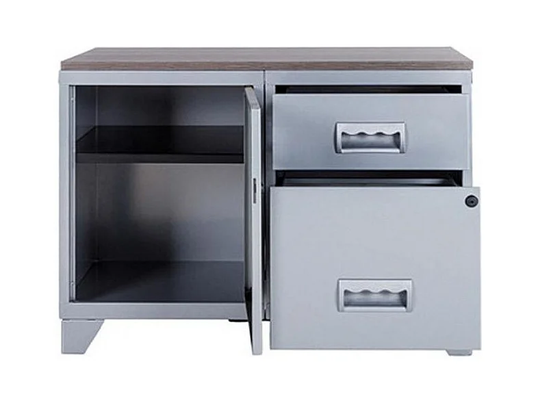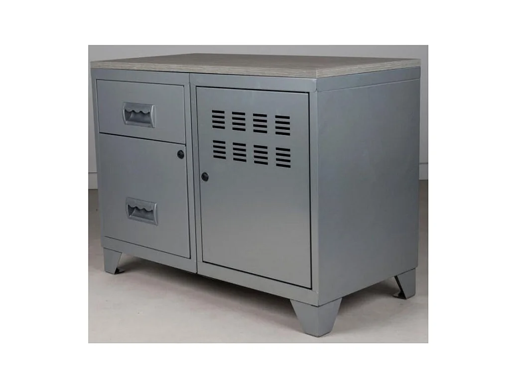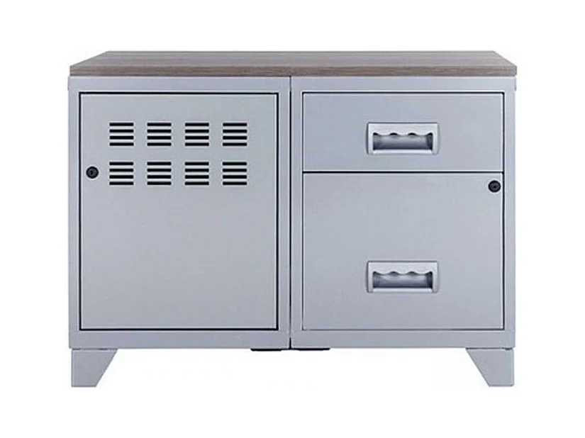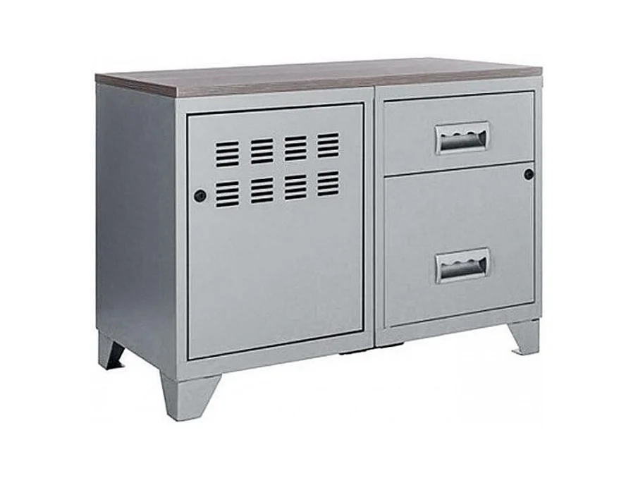 Meuble 1 porte 2 tiroirs métal gris aluminium et plateau chêne naturel Naya L80xH60xP40