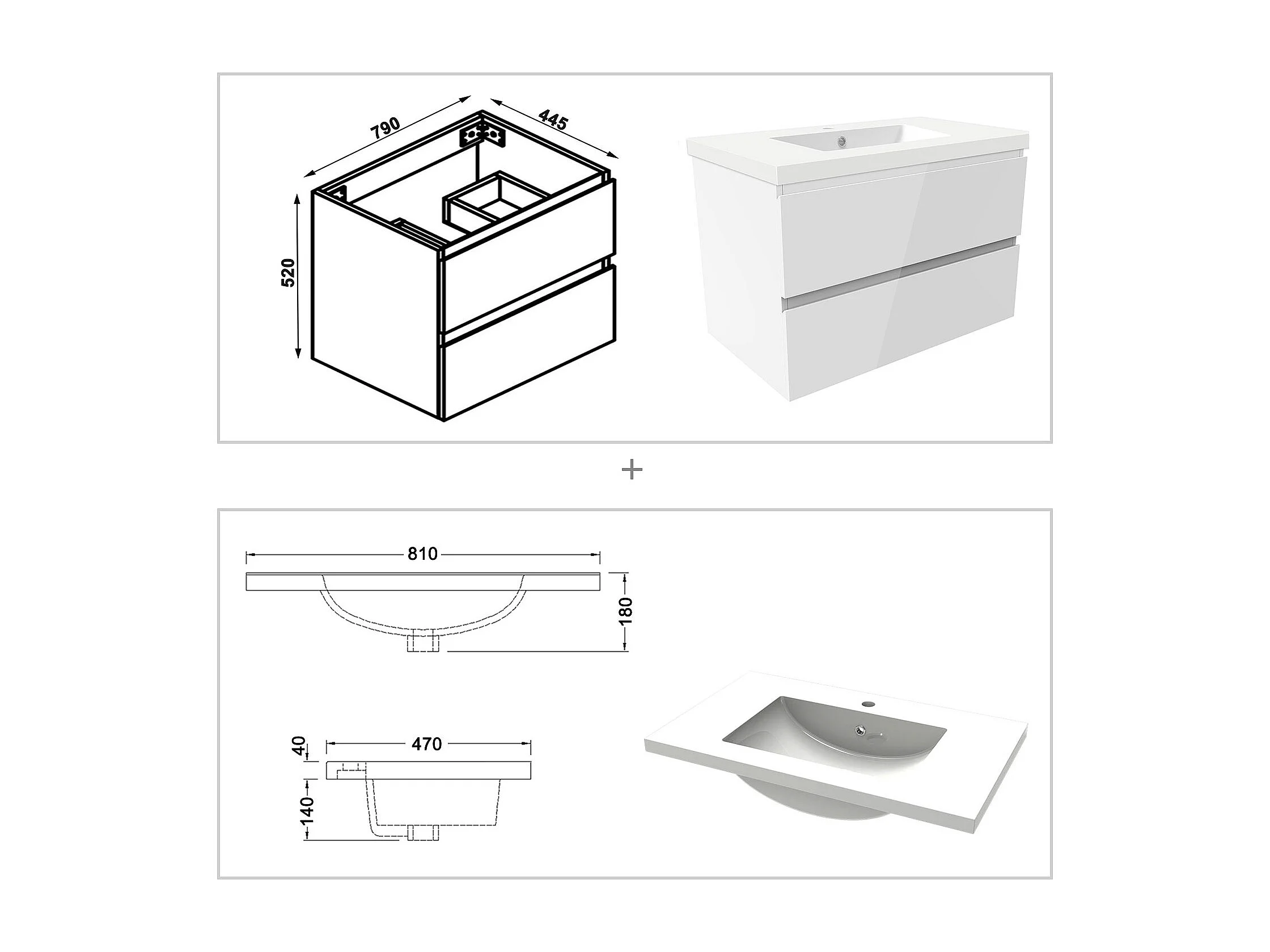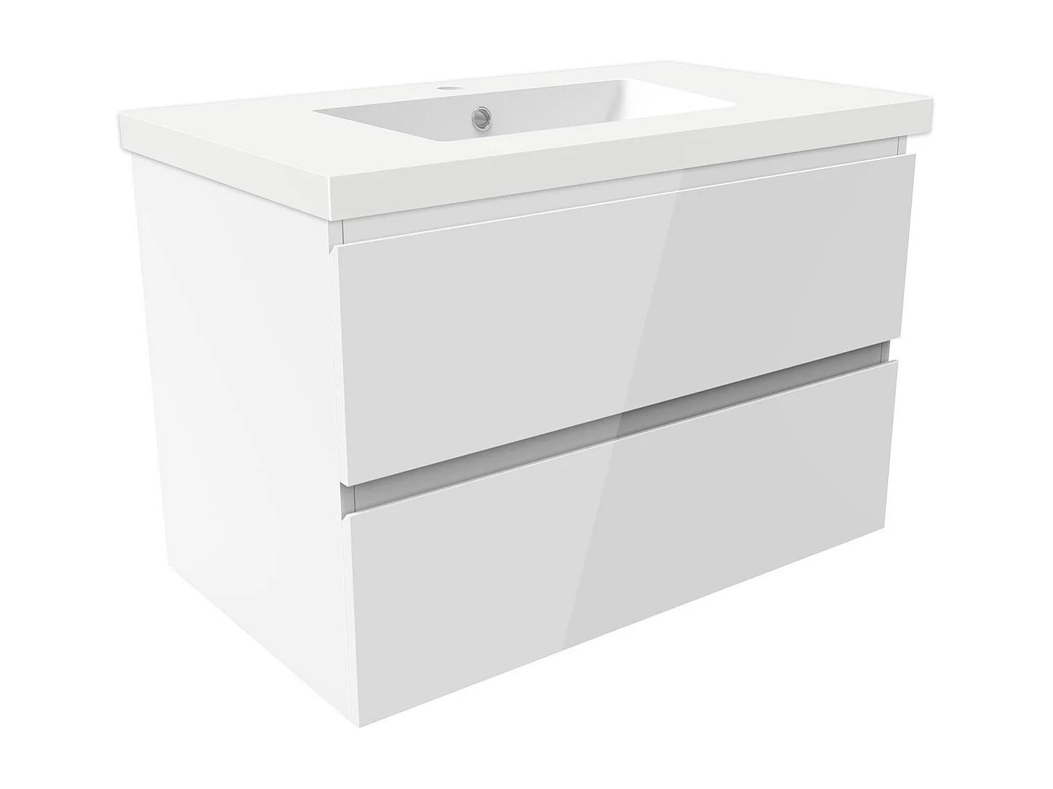 Meuble salle de bain 80cm blanc brillant avec 2 tiroirs à fermeture automatique et simple lavabo