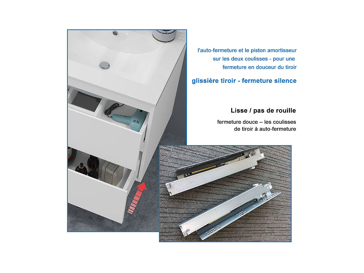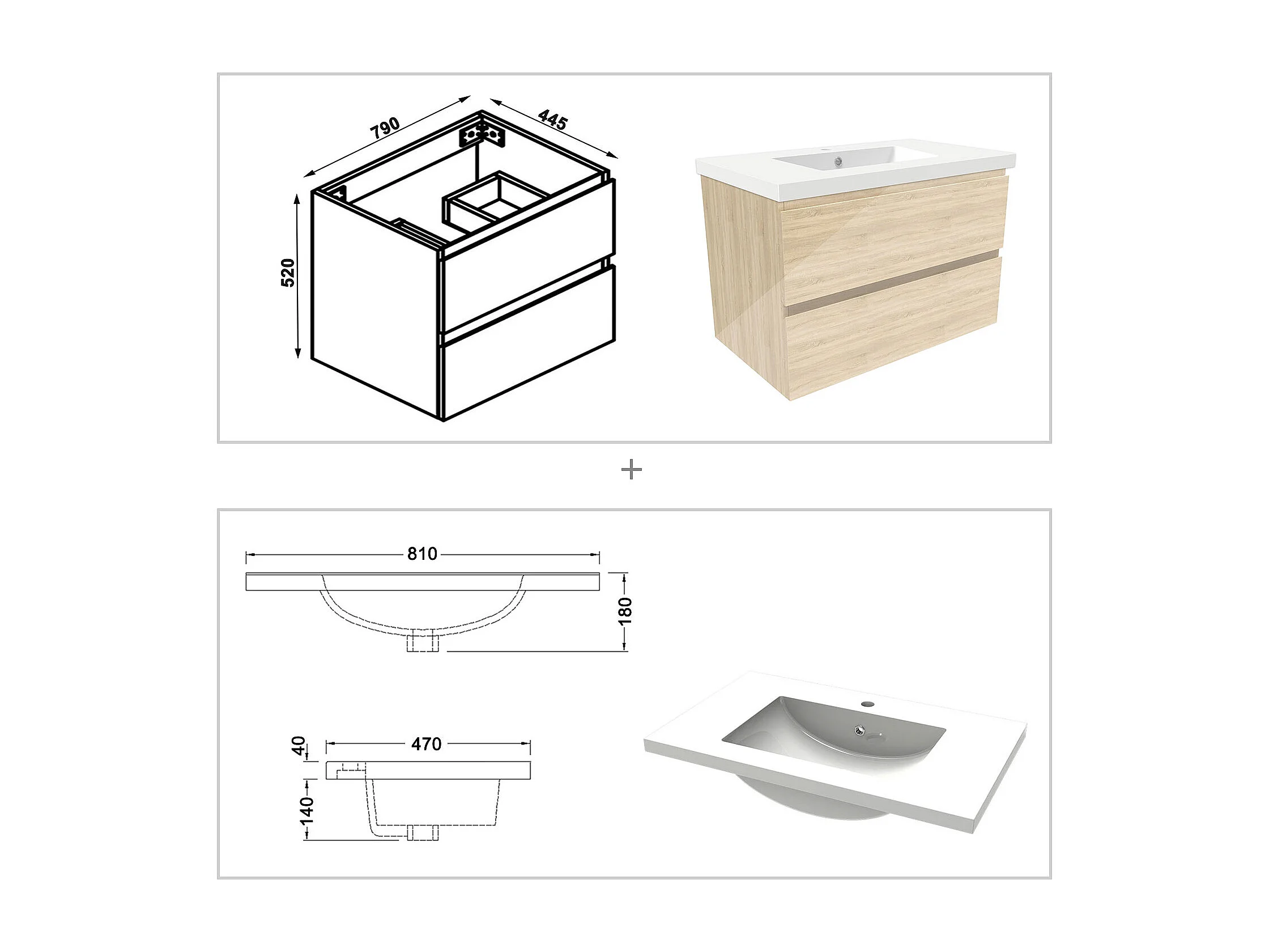 Meuble salle de bain 80cm chêne brillant avec 2 tiroirs à fermeture automatique et simple lavabo
