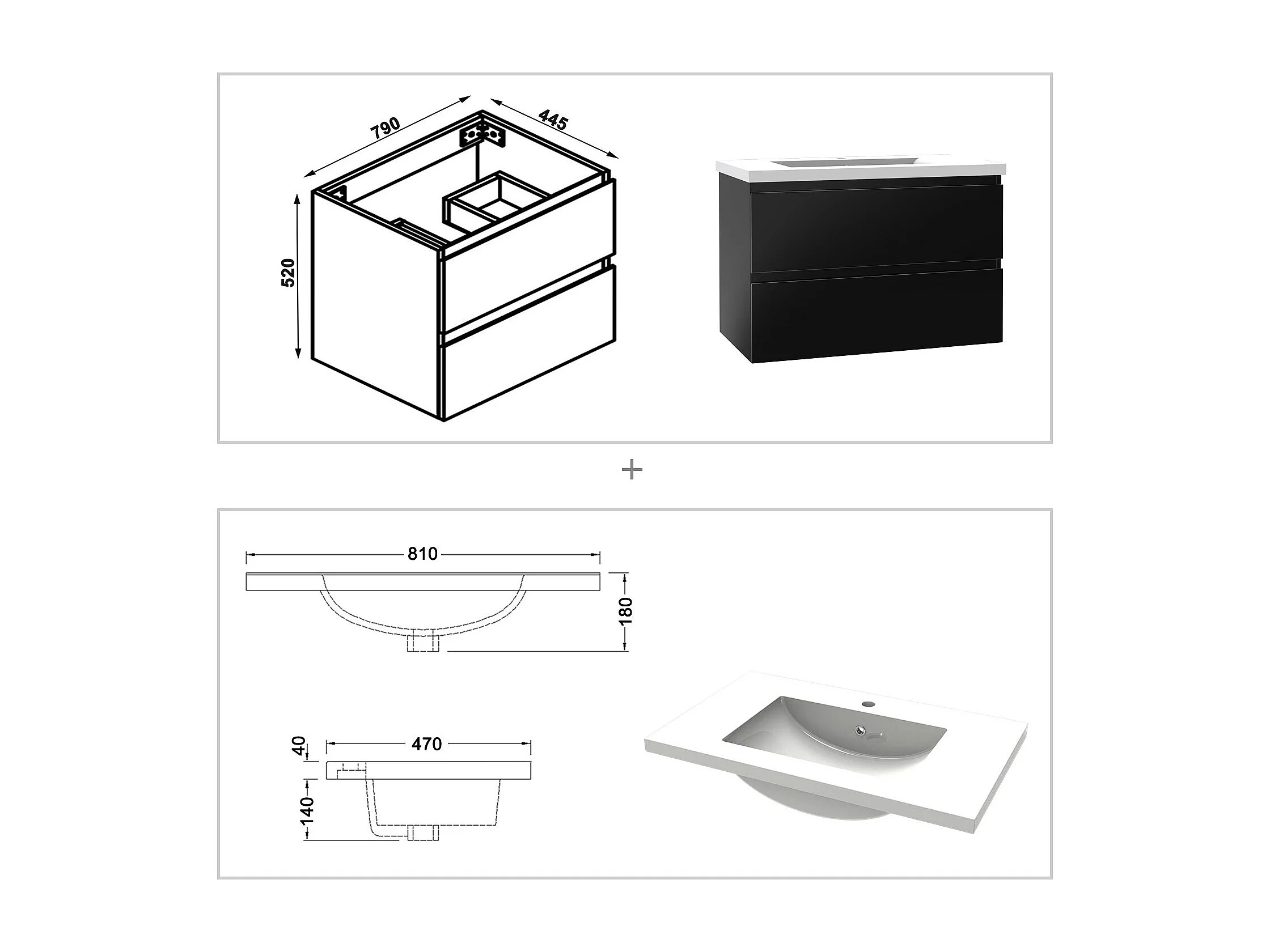Meuble salle de bain 80cm noir brillant avec 2 tiroirs à fermeture automatique et simple lavabo