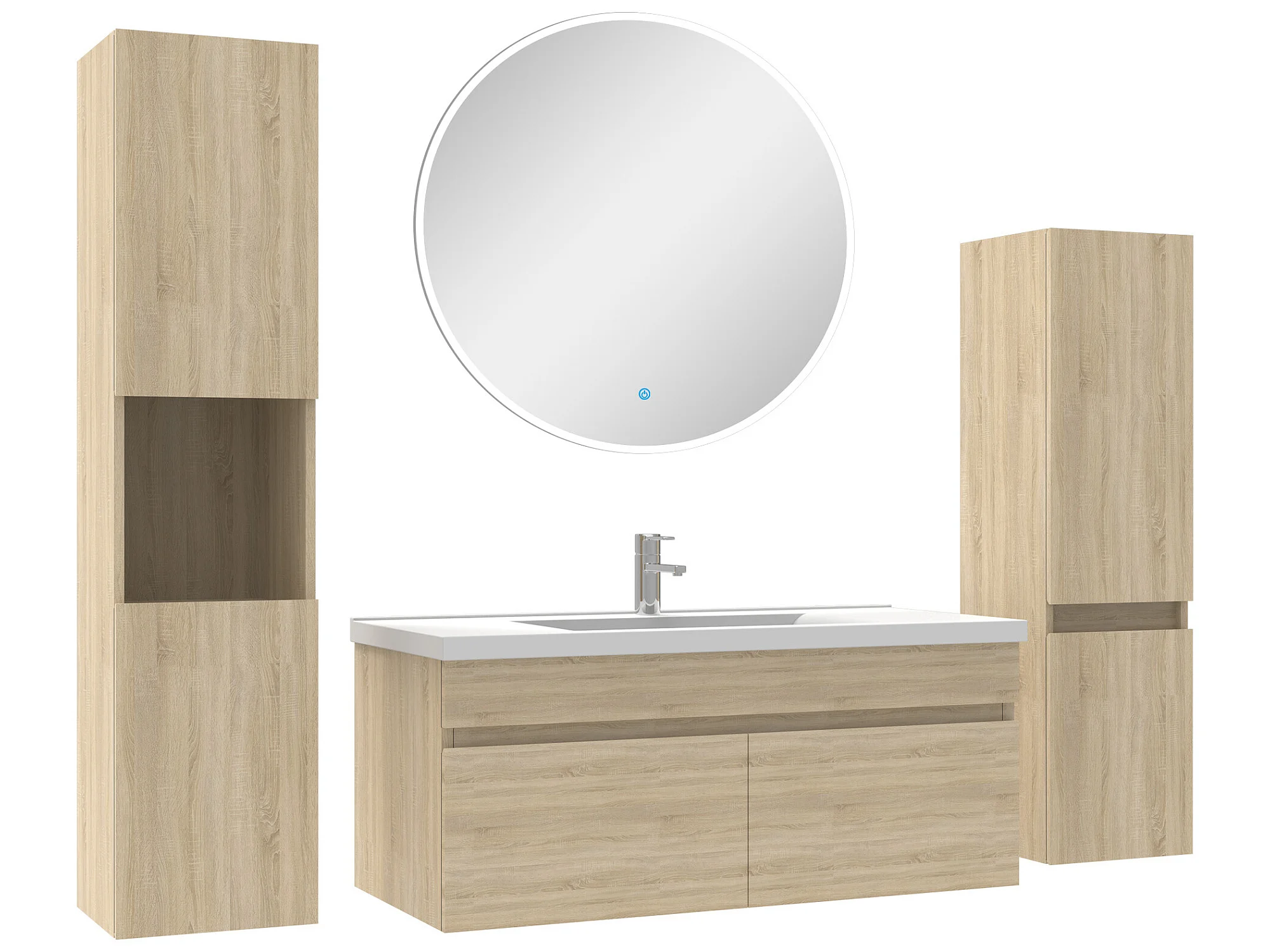 Meuble Salle de Bain Chêne Wotan 100cm simple vasque + colonne + miroir rond LED