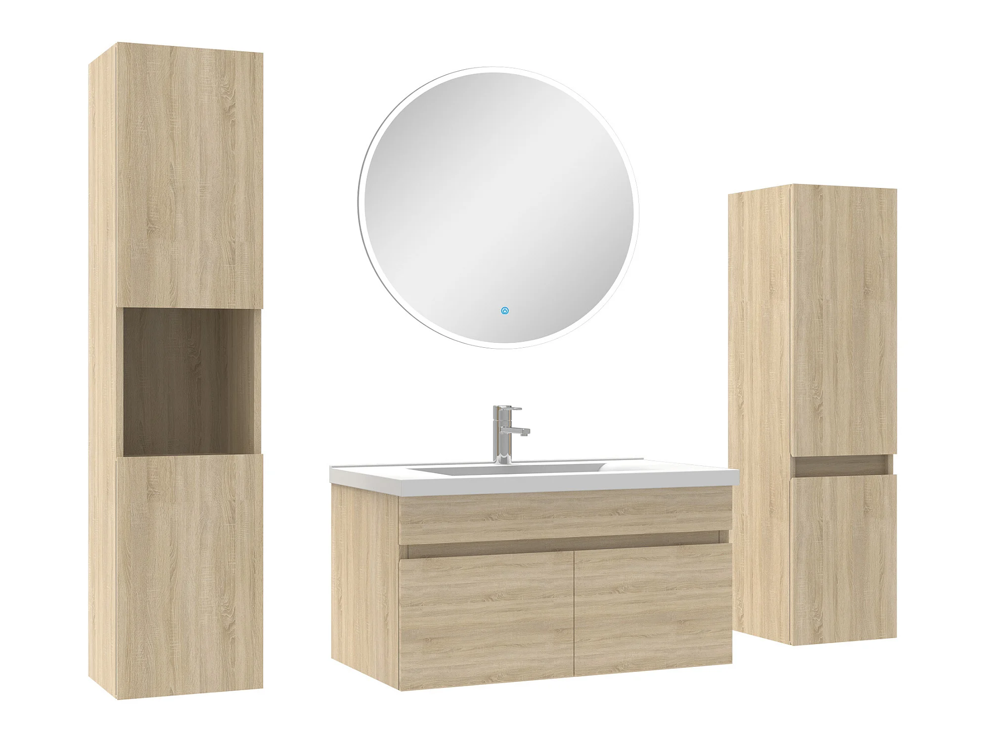 Meuble Salle de Bain Chêne Wotan 80cm simple vasque + colonne + miroir rond LED