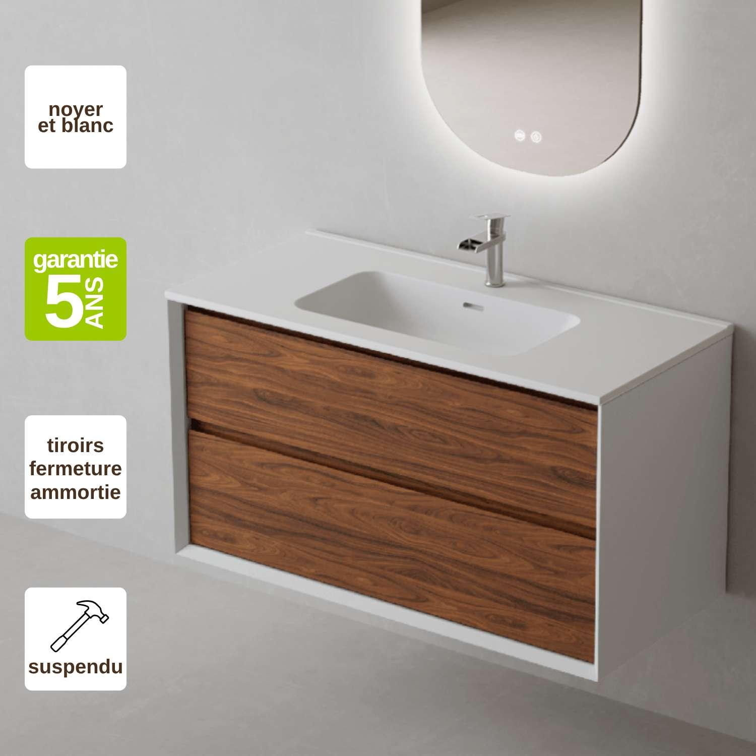 Meuble Salle de Bain COOL (101 cm x H54 x P45 cm), Plan Vasque Céramique WM, 2 Tiroirs, Laqué Blanc Mat/Noyer