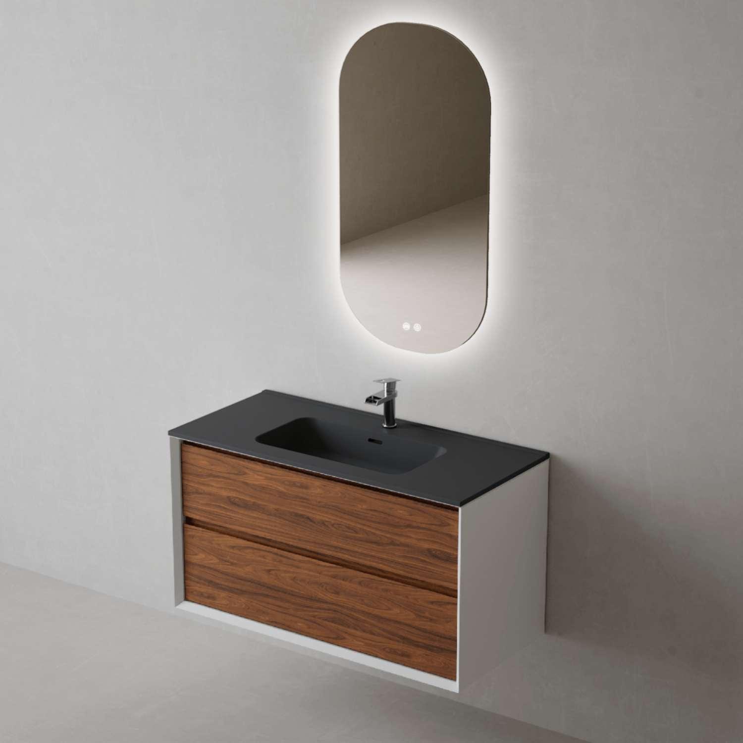 Meuble Salle de Bain COOL (61 cm x H54 x P45 cm), Plan Vasque Céramique NM, 2 Tiroirs, Laqué Blanc Mat/Noyer